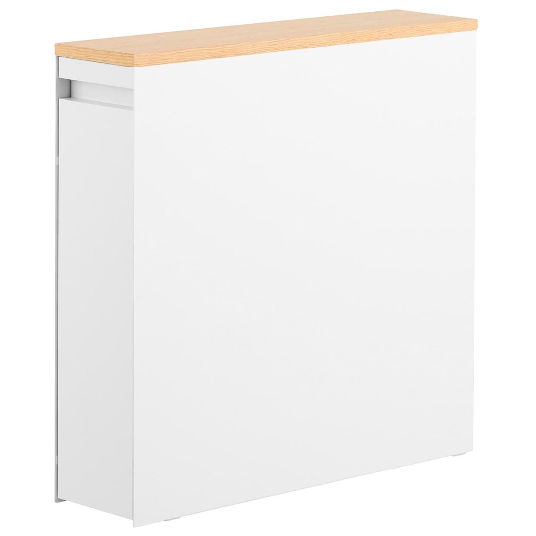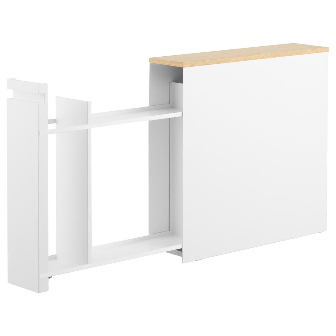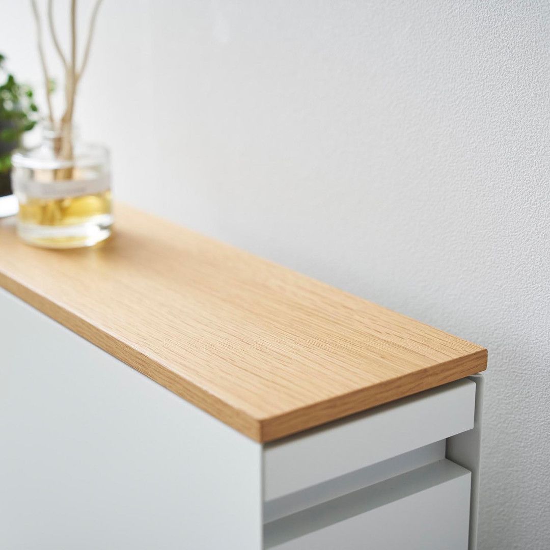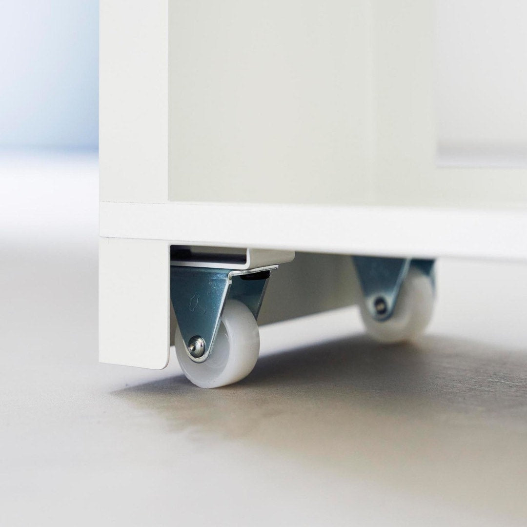 引き出して大容量。 スリムに置けるトイレ収納トイレ小物を隠しながら大容量収納が叶うキャスター付き引き出し収納です。スリムだからトイレの中に置いても邪魔になりません。左右・引き出しの向きなどお好きな置き方ができるからどのご家庭のトイレにも導入しやすいアイテムです。どんなトイレインテリアにもOK。 2色のカラーバリエーションカラーは、清潔感のあるホワイト、スタイリッシュなブラックをご用意しました。どのお家のトイレにもマッチするシンプルなモノトーンカラーです。天板も本体カラーに合わせたカラーリングになっています。トイレの中にスマートに設置幅14cm×高さ55cm×奥行き56cmのスリムさは狭いトイレ空間でも圧迫感なく設置できます。低めの高さで設計されているので、手洗いカウンター下にも無理なく置けるサイズ感です。本体はスチール製なため側面をマグネット収納としてもご使用いただけます。スリムなのに大容量。 トイレ小物がすっきりと収まるキャスター付きの引き出しには、トイレロールは縦に三段×三列で九個、トイレブラシ、お掃除用ウェットシートなどを区分けして収納できます。トイレブラシはスタンドごと収納できるのが◎サニタリー用品や使い捨てトイレブラシのストックを収納しておくのもおすすめです。ホコリの侵入をブロック。 収納物はキレイなままキャスターと取っ手付きだからたくさんの物を収納していても引き出しがスムーズです。引き出し部だけでなく本体側にも底板があるためホコリの侵入を防ぎます。収納部も中の収納物もしっかりと汚れから守れて安心してお使いいただけます。