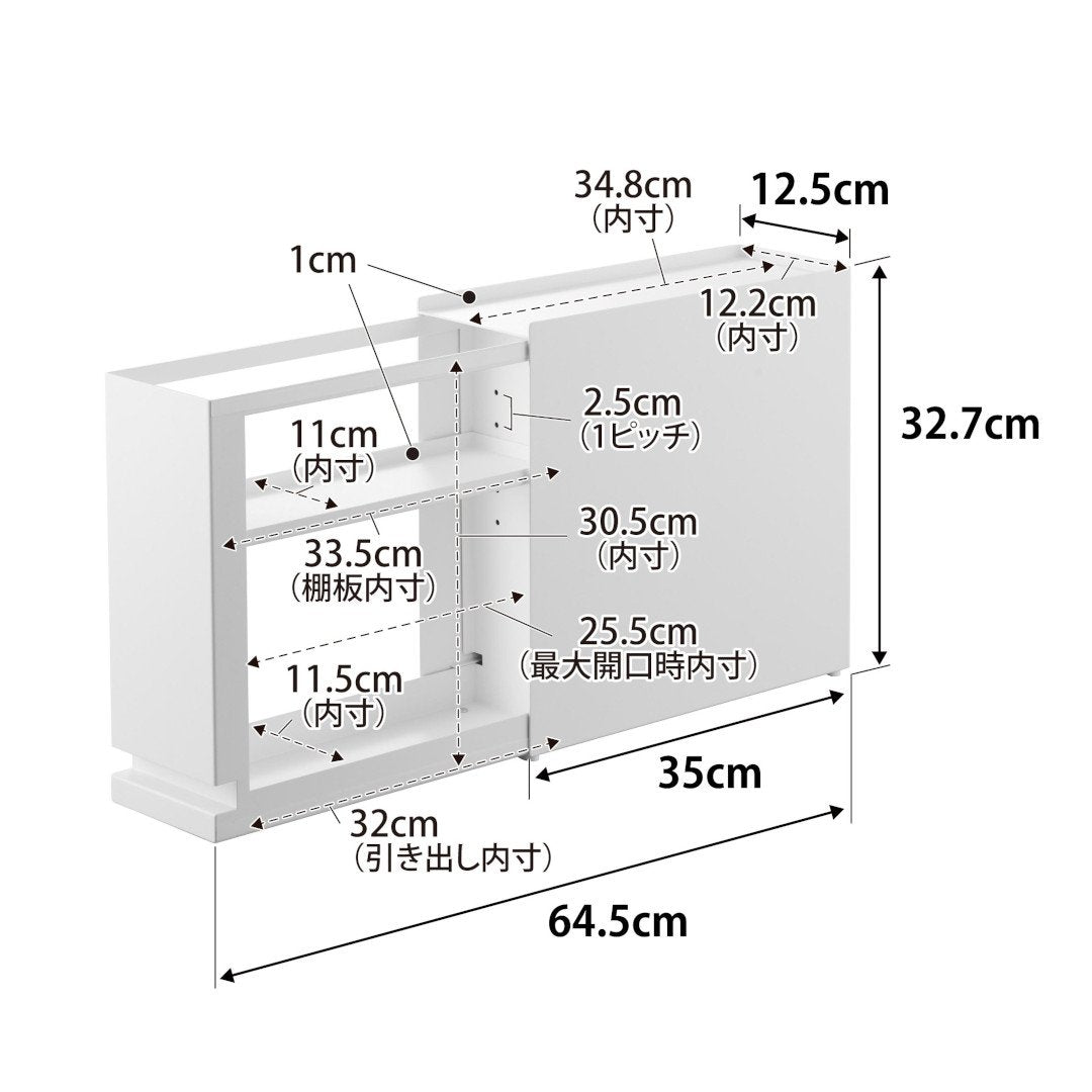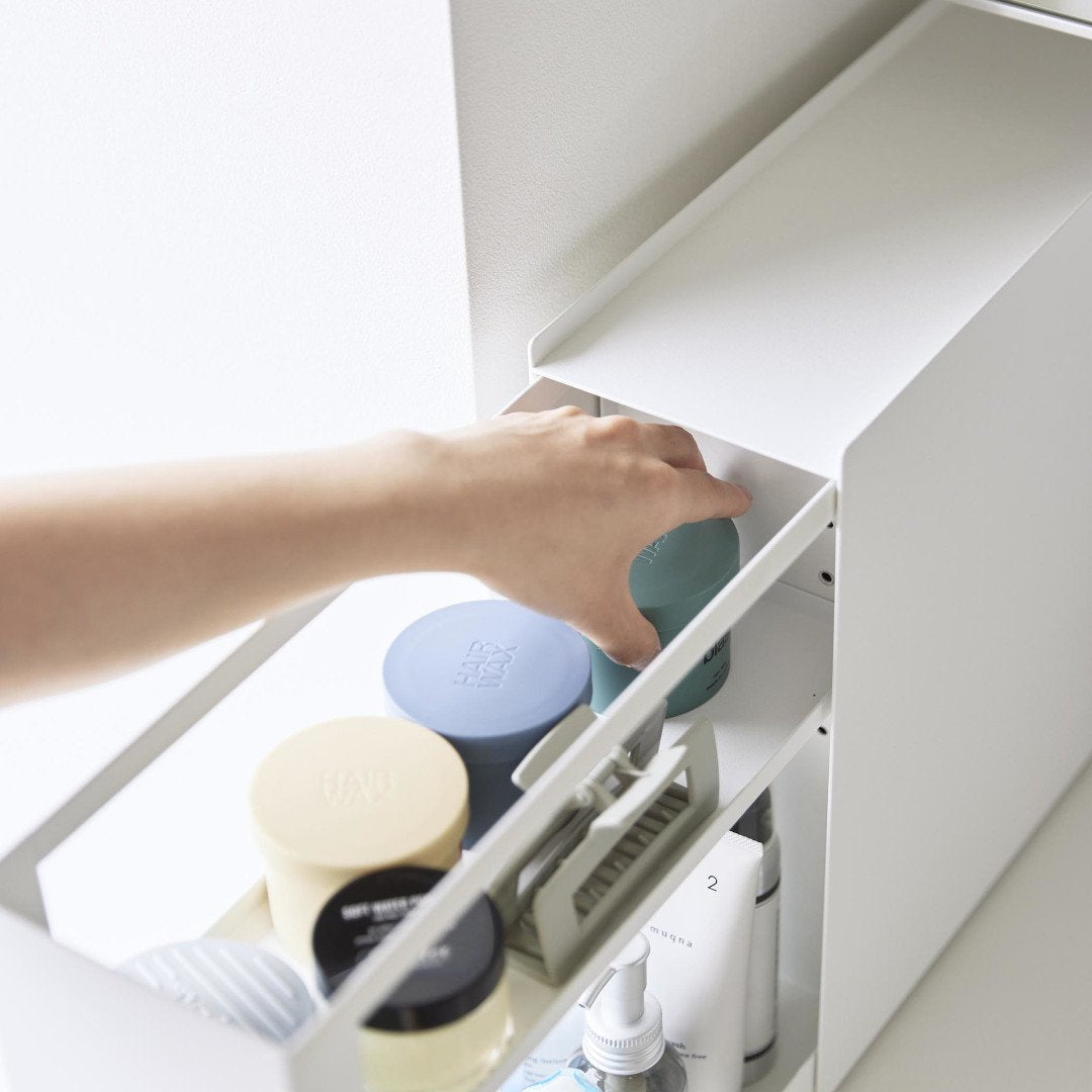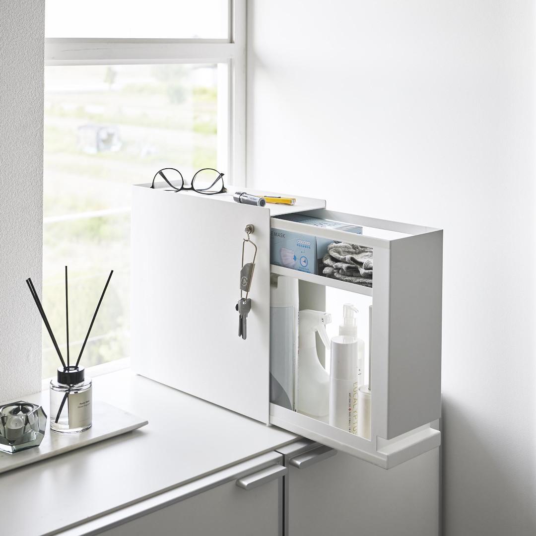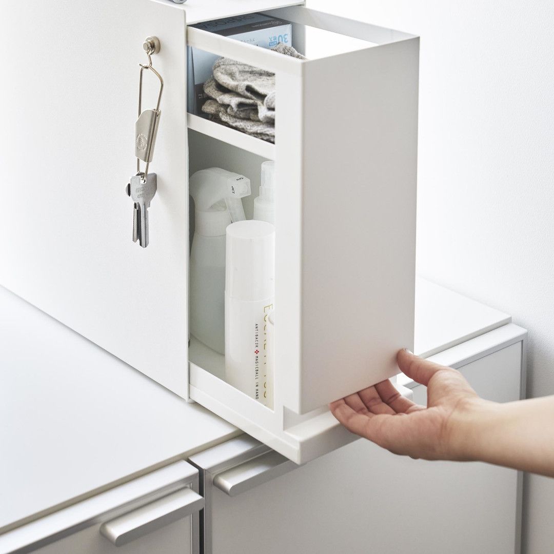 目隠しできる引き出し収納生活感の出やすい日用品をまとめて収納できる引き出し収納です。普段は中の物を隠しておけるので見た目もすっきりと片付きます。天板には眼鏡などをちょい置きすることも可能。スチール製なので側面をマグネット収納としてお使いいただくこともできます。どのお部屋にもなじみやすい、2色のカラーバリエーションカラーは、明るい印象のホワイト、スタイリッシュなブラックをご用意しました。リビングや玄関などどこに置いてもマッチするシンプルなモノトーンカラーです。設置場所のインテリアに合わせてお好みのカラーをお選びください。家中どこにおいても使えるスリムな小物収納ちょっとしたスペースにも置きやすい幅12.5cmのスリム設計です。キッチンや玄関、リビングや洗面所などにさりげなく置けて収納スペースを増設できるのがうれしいポイント。引き出しの中は二段式で、収納物に合わせて2.5cm間隔で高さ調節が可能です。キッチン雑貨の収納にカップボード上などに設置してキッチン小物を一括収納。ごちゃごちゃしがちな調味料やスパイス、オイルやジャム、お茶やスティックシュガーなどをまとめて収納するのに便利です。キッチン周りがすっきりとした印象に整えられます。玄関がチラ見えしても慌てないお出かけ用のハンカチ、アルコールや消臭スプレー、防水スプレーなどをまとめて収納しておけます。シューズボックスの上に整理して並べていたとしても雑然とした印象を与えてしまいますが、隠せる引き出し収納を活用すれば生活感をオフに。