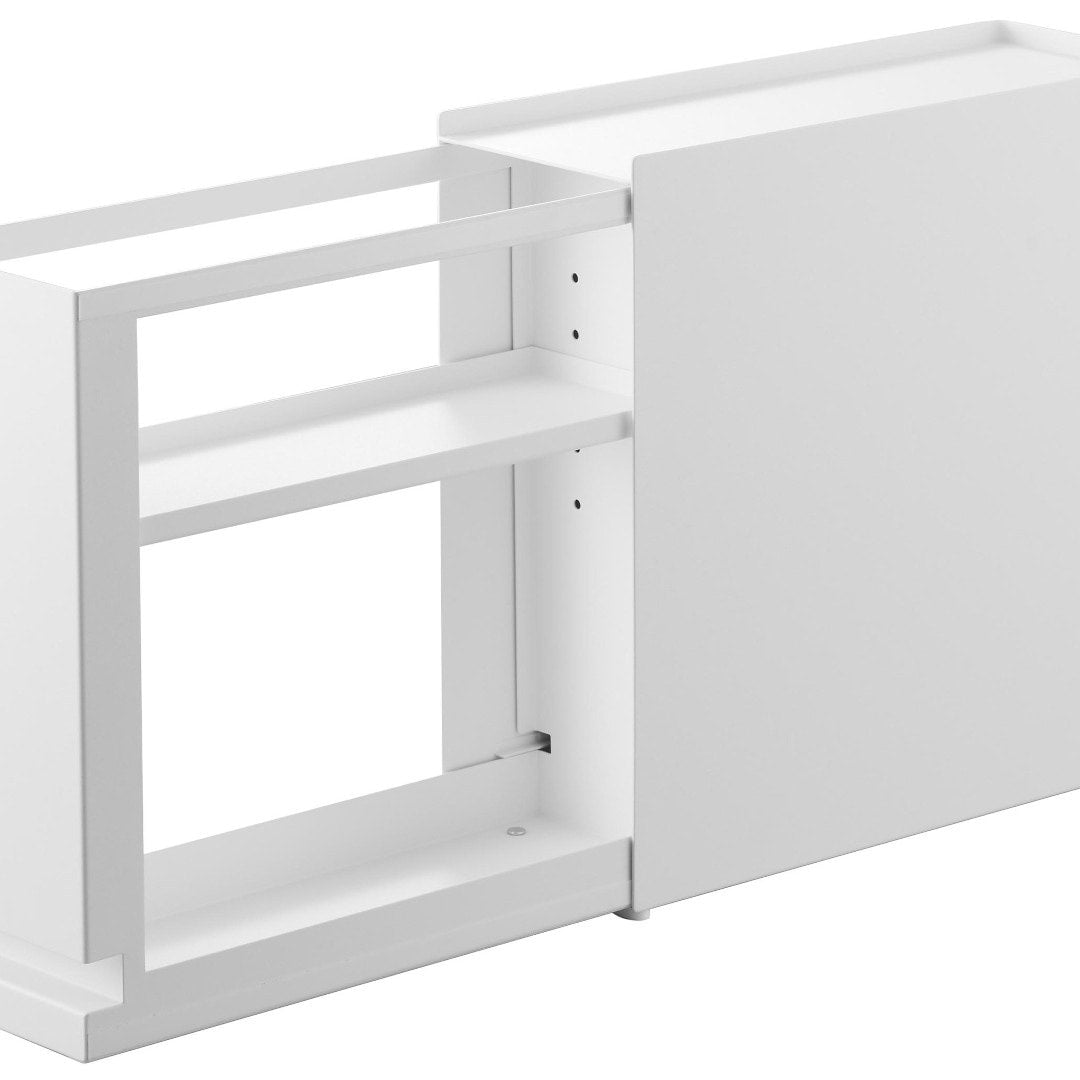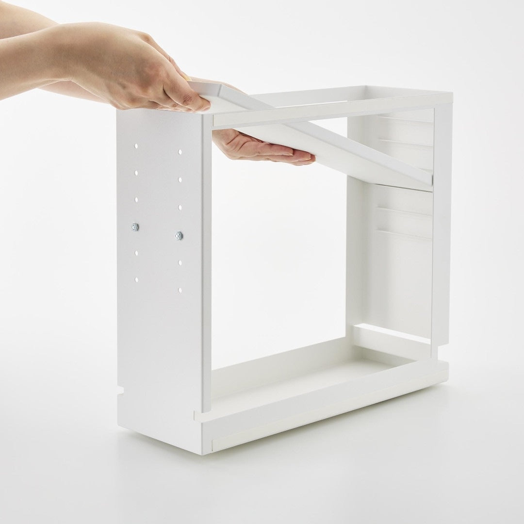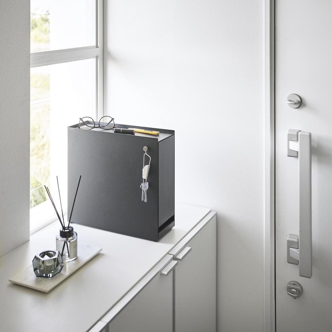 目隠しできる引き出し収納生活感の出やすい日用品をまとめて収納できる引き出し収納です。普段は中の物を隠しておけるので見た目もすっきりと片付きます。天板には眼鏡などをちょい置きすることも可能。スチール製なので側面をマグネット収納としてお使いいただくこともできます。どのお部屋にもなじみやすい、2色のカラーバリエーションカラーは、明るい印象のホワイト、スタイリッシュなブラックをご用意しました。リビングや玄関などどこに置いてもマッチするシンプルなモノトーンカラーです。設置場所のインテリアに合わせてお好みのカラーをお選びください。家中どこにおいても使えるスリムな小物収納ちょっとしたスペースにも置きやすい幅12.5cmのスリム設計です。キッチンや玄関、リビングや洗面所などにさりげなく置けて収納スペースを増設できるのがうれしいポイント。引き出しの中は二段式で、収納物に合わせて2.5cm間隔で高さ調節が可能です。キッチン雑貨の収納にカップボード上などに設置してキッチン小物を一括収納。ごちゃごちゃしがちな調味料やスパイス、オイルやジャム、お茶やスティックシュガーなどをまとめて収納するのに便利です。キッチン周りがすっきりとした印象に整えられます。玄関がチラ見えしても慌てないお出かけ用のハンカチ、アルコールや消臭スプレー、防水スプレーなどをまとめて収納しておけます。シューズボックスの上に整理して並べていたとしても雑然とした印象を与えてしまいますが、隠せる引き出し収納を活用すれば生活感をオフに。