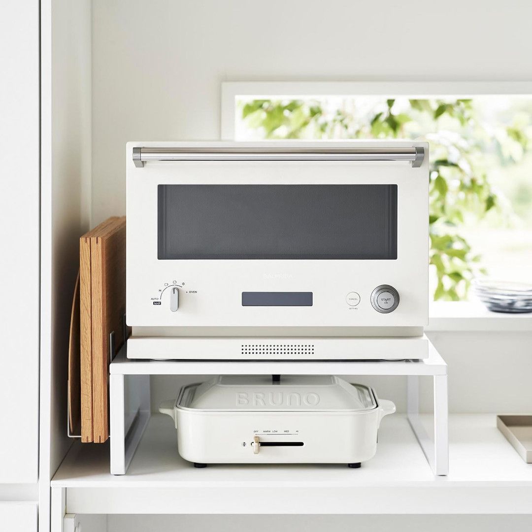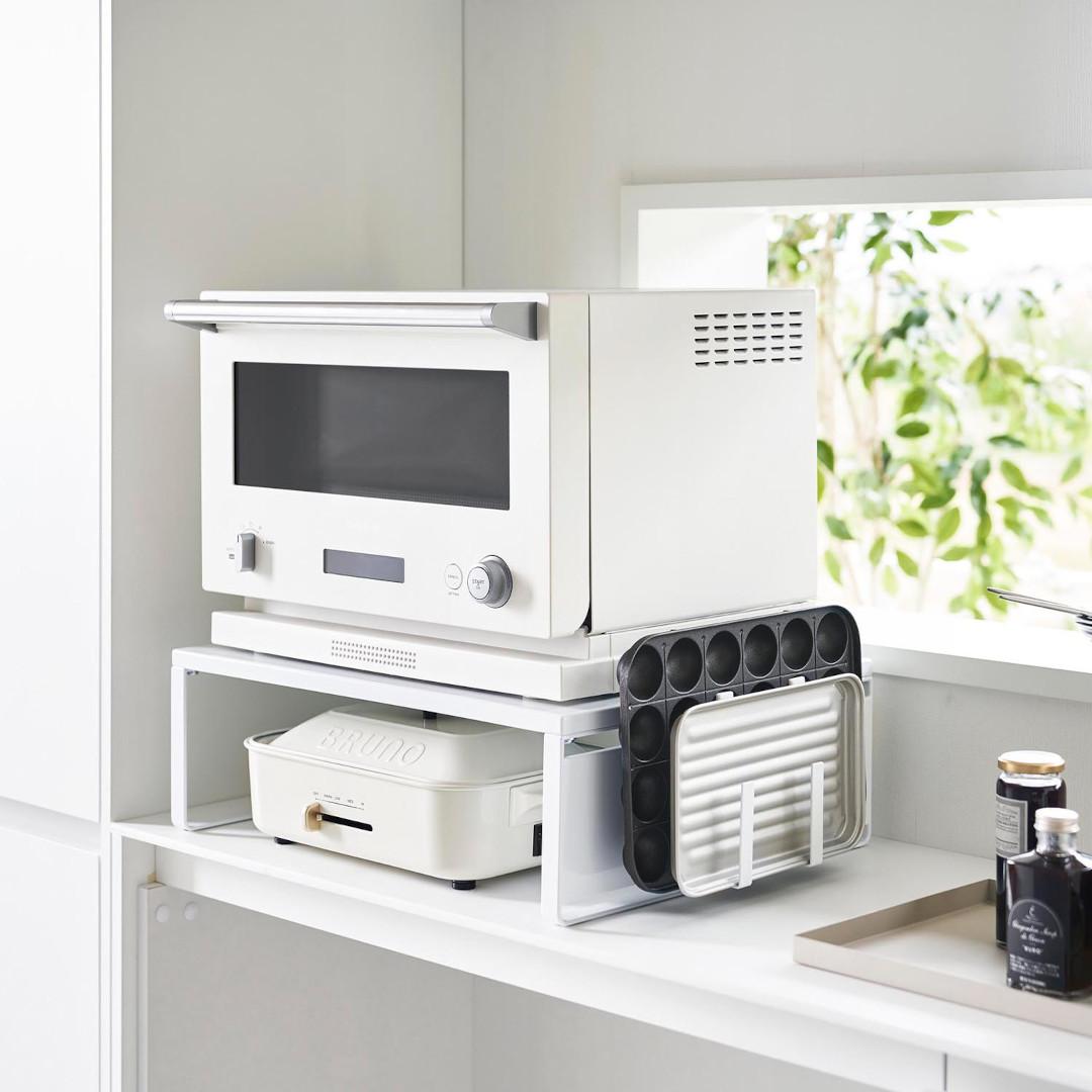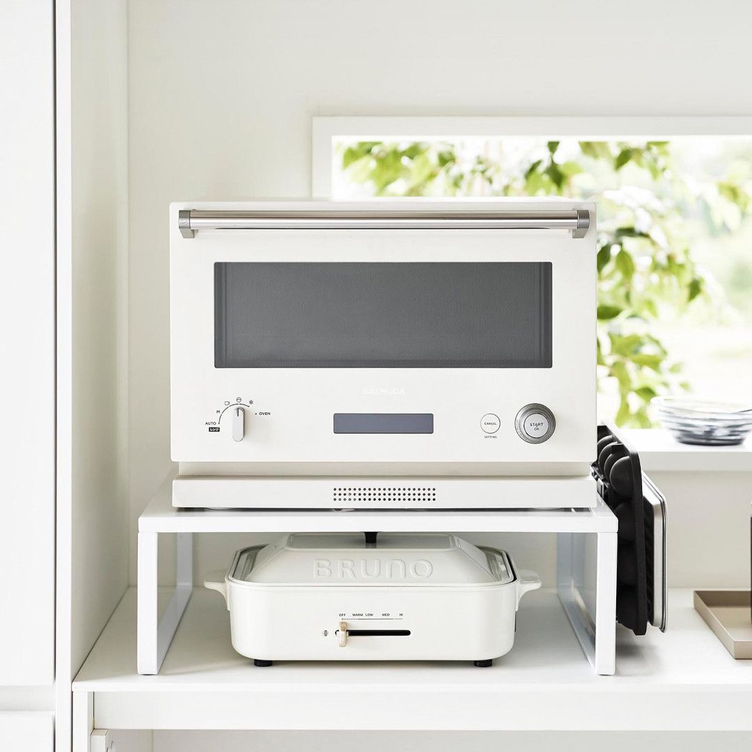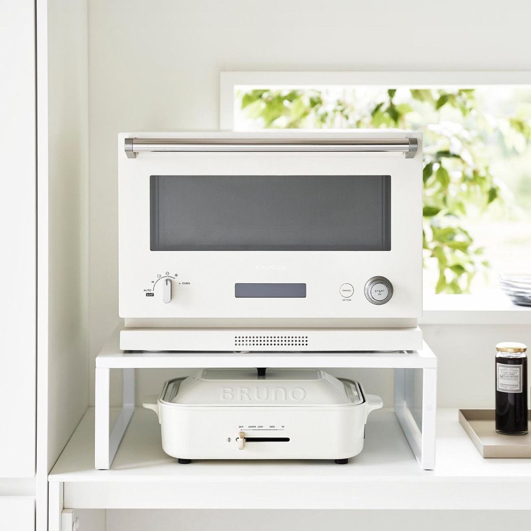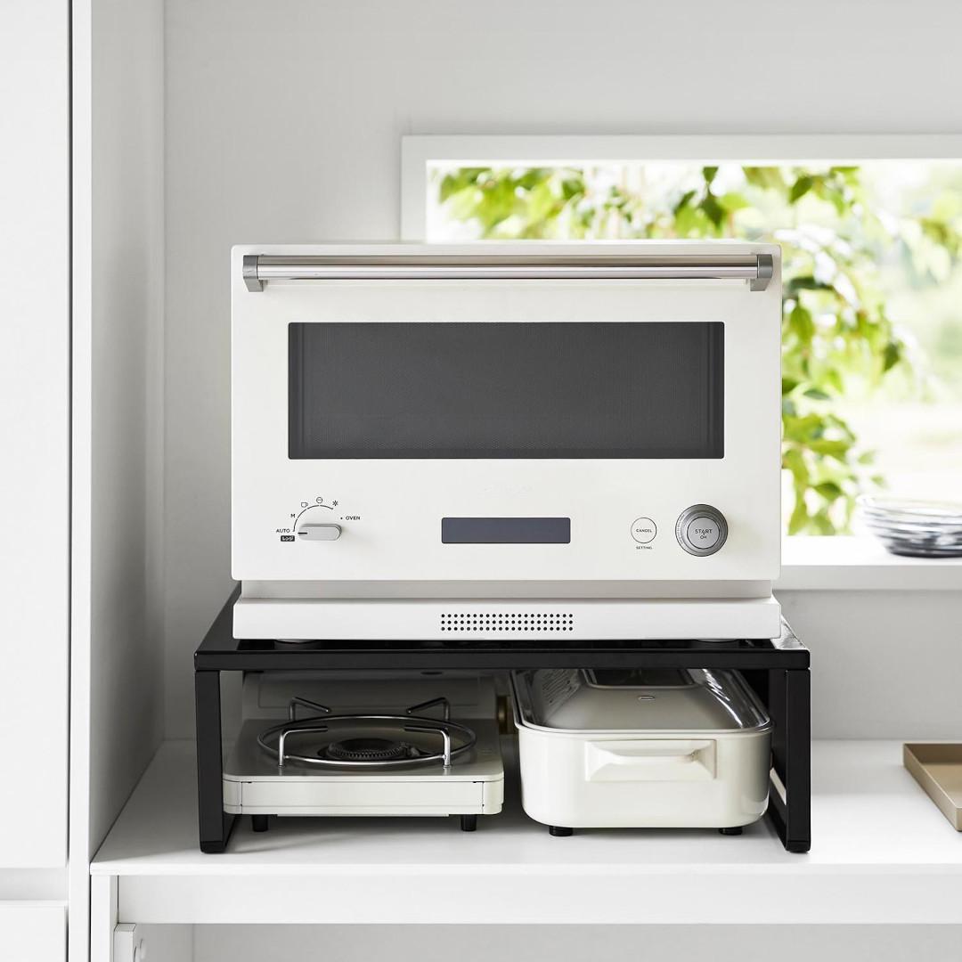 下に収納スペースを作るオーブンラック置き場に困るホットプレートやカセットコンロを、オーブンレンジの下に収納できます。縦にスペースを作ることで、見た目もスッキリ。ラックを活用することでホットプレートの取り出しも片付けもスムーズに。スチールパネルは左右どちらにも取り付けられます。インテリアになじみやすい、2色のカラーバリエーションカラーは、明るい印象のホワイト、スタイリッシュなブラックをご用意しました。キッチンインテリアを邪魔しないシンプルなモノトーンカラーです。カップボードやオーブンレンジに合わせてお好みのカラーをお選びください。使いたいときに手に取りやすい収納使用頻度の高くないホットプレートやカセットコンロは取り出しにくいところに収納しがち。でもそれだといざ「使いたい。」ってときに取り出しづらいし、億劫になってしまうことも。だからこそ“いつでも使いやすく、視界に入る場所”に収納するのが◎マグネット対応のサイドパネルラックのサイドにはスチールパネルが取り付けられ、マグネットでレシピなども貼り付けておけます。別売りのマグネット収納アイテムと組合わせることで、収納の幅が広がります。カップボードの傷つきを防止するクッション材付き耐荷重は25kgなので高性能のオーブンレンジも安定して設置できます。ラックの脚にはシリコーン製のクッションが付いており、ラックとの設置面にキズが付きにくいよう工夫されています。