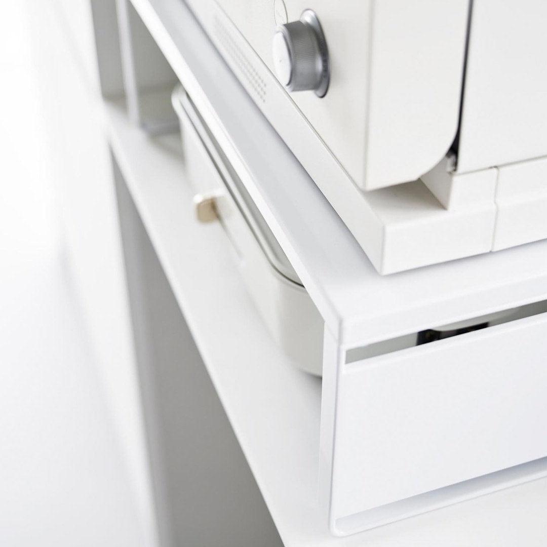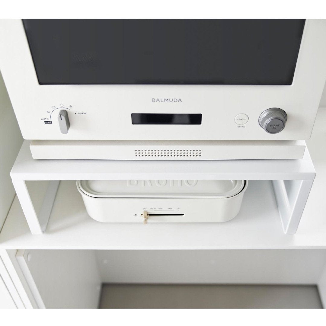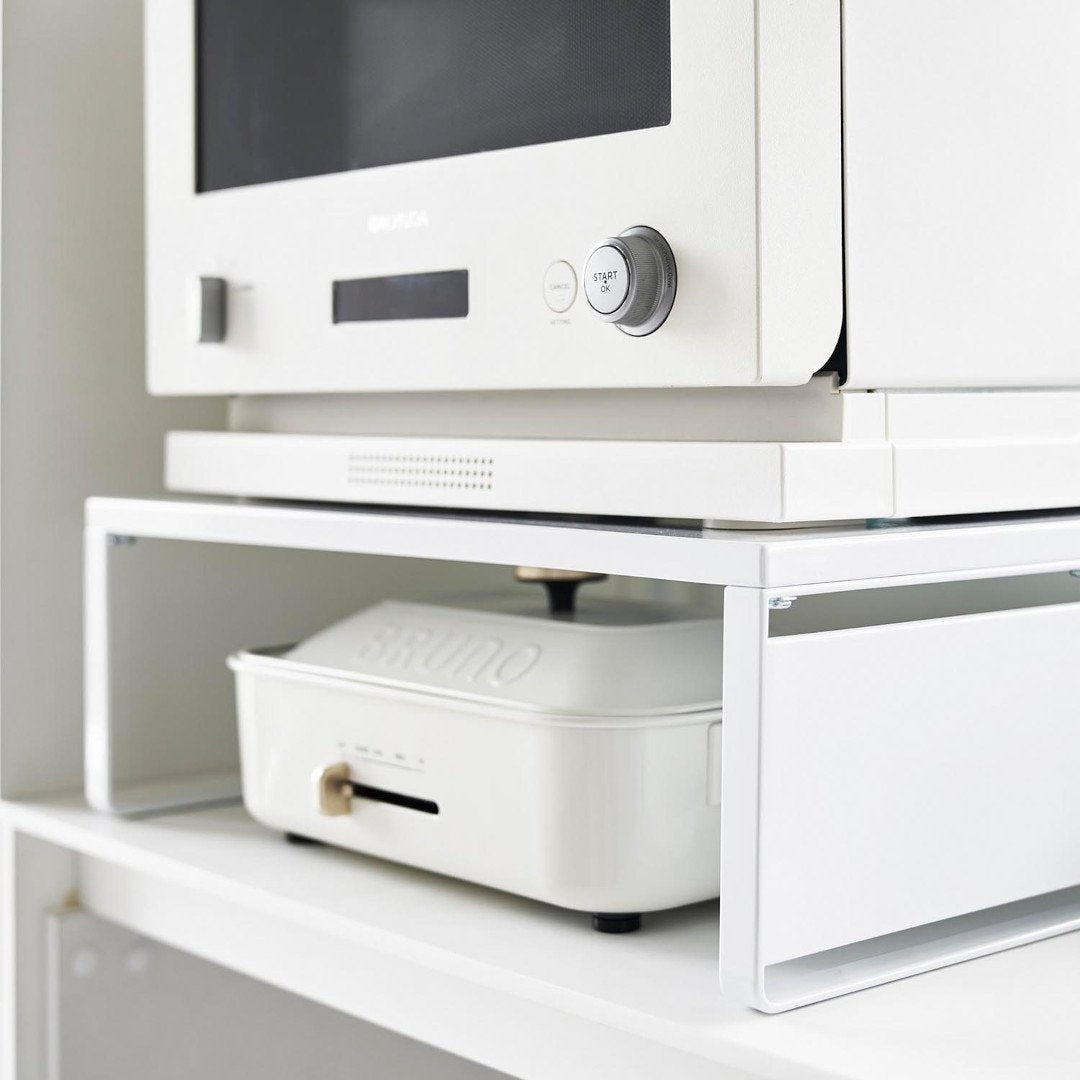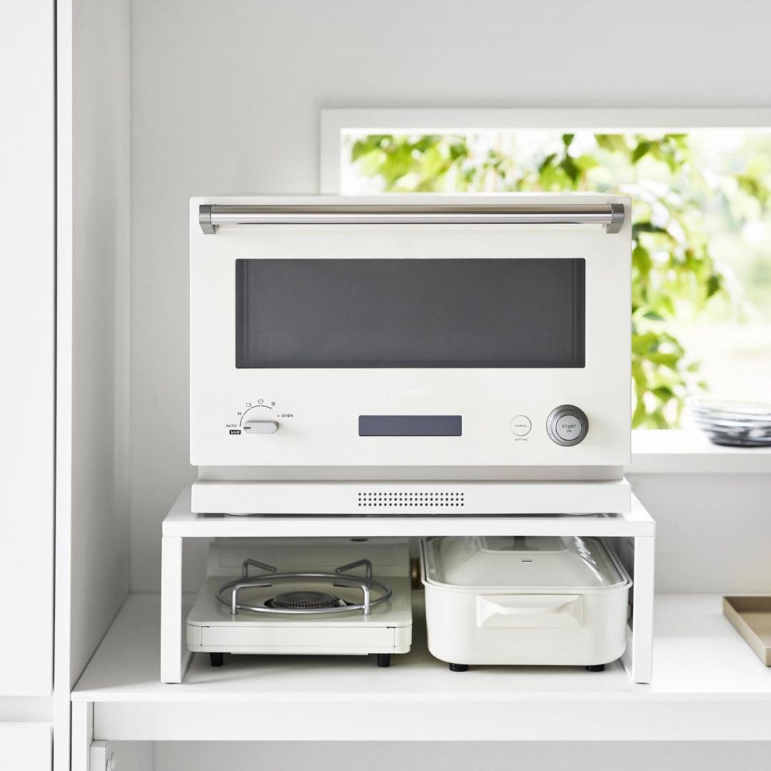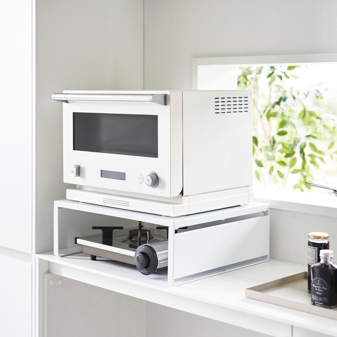 下に収納スペースを作るオーブンラック置き場に困るホットプレートやカセットコンロを、オーブンレンジの下に収納できます。縦にスペースを作ることで、見た目もスッキリ。ラックを活用することでホットプレートの取り出しも片付けもスムーズに。スチールパネルは左右どちらにも取り付けられます。インテリアになじみやすい、2色のカラーバリエーションカラーは、明るい印象のホワイト、スタイリッシュなブラックをご用意しました。キッチンインテリアを邪魔しないシンプルなモノトーンカラーです。カップボードやオーブンレンジに合わせてお好みのカラーをお選びください。使いたいときに手に取りやすい収納使用頻度の高くないホットプレートやカセットコンロは取り出しにくいところに収納しがち。でもそれだといざ「使いたい。」ってときに取り出しづらいし、億劫になってしまうことも。だからこそ“いつでも使いやすく、視界に入る場所”に収納するのが◎マグネット対応のサイドパネルラックのサイドにはスチールパネルが取り付けられ、マグネットでレシピなども貼り付けておけます。別売りのマグネット収納アイテムと組合わせることで、収納の幅が広がります。カップボードの傷つきを防止するクッション材付き耐荷重は25kgなので高性能のオーブンレンジも安定して設置できます。ラックの脚にはシリコーン製のクッションが付いており、ラックとの設置面にキズが付きにくいよう工夫されています。