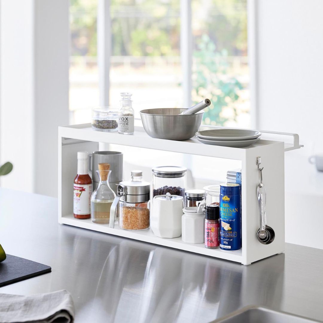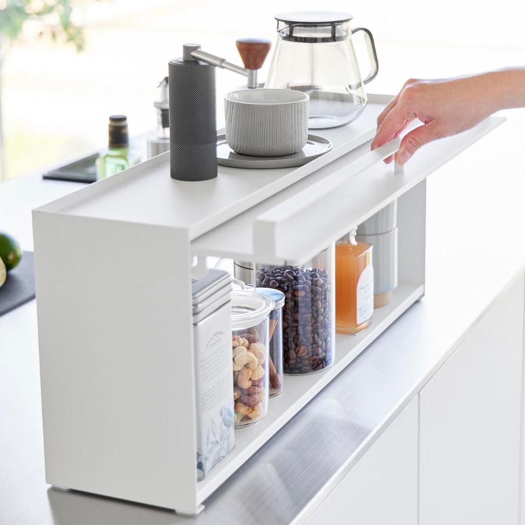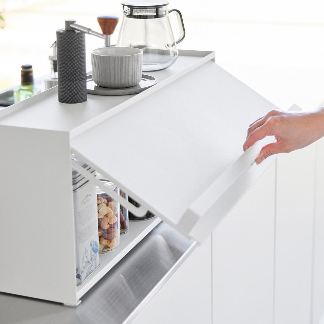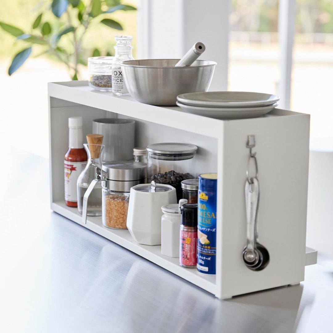 ダイニング側からもキッチン側からも取り出せる収納ラックキッチンやカウンターなどに設置してお使いいただけるフラップ扉式収納ラックです。スチール製だからマグネットを貼り付けられるのも便利。天面にはフチが付いており、上に置いたものが落ちにくい仕様です。カップボードなど壁面に沿うように設置すればオープン仕様の背面も隠せます。キッチンになじむ、2色のカラーバリエーションカラーは、明るい印象のホワイト、スタイリッシュなブラックをご用意しました。キッチンに似合うシンプルなモノトーンカラーです。キッチン小物やインテリアに合わせてお好きなカラーをお選びください。前面を隠して生活感をOFF背面はオープンになっているので、カウンターに置いておけばキッチン側からはノーアクションで、カウンター側からはフラップ扉をスッと持ち上げればスムーズに取り出せます。普段は扉が目隠しになっているのでいろいろな物を収納していてもごちゃごちゃして見えません。ティーブレイク、朝の一杯の準備をここで完結奥行15cmでコーヒー豆や紅茶を入れているキャニスター、調味料がちょうど良く収まるサイズ感です。収納ラックの天面にはコーヒーポットなどを置いておけます。コーヒー豆、マドラー、スティックシュガー、ミルクなど一式揃えておくとコーヒーの準備がラクちん。サイズが選べる2パターン展開奥行15cmタイプ、奥行き24cmタイプの2サイズをご用意しております。設置場所に合わせてちょうど良いサイズをお選びください。※こちらの商品は『前が開くキッチンカウンター上収納ラック D15』の商品となり、『前が開くキッチンカウンター上収納ラック D24』の商品は別売です。