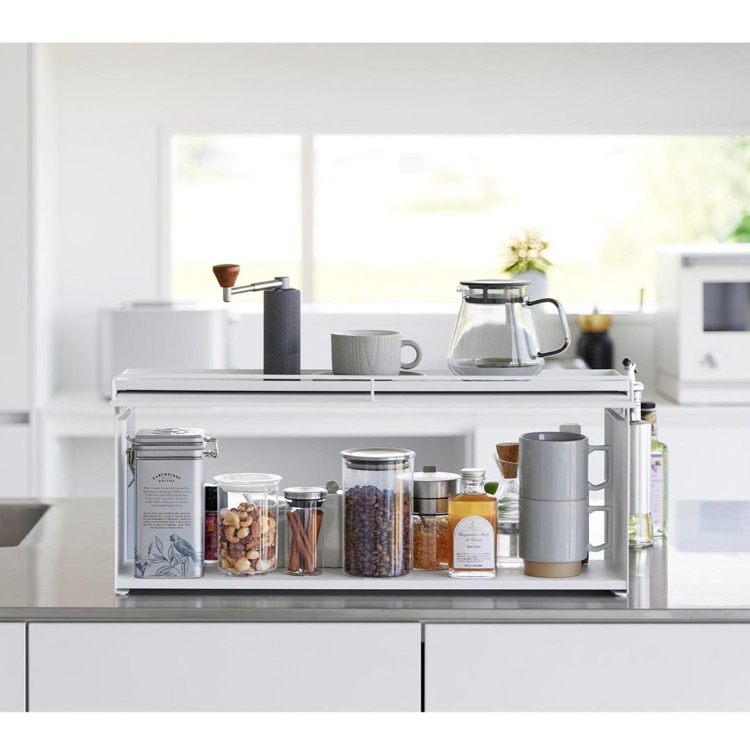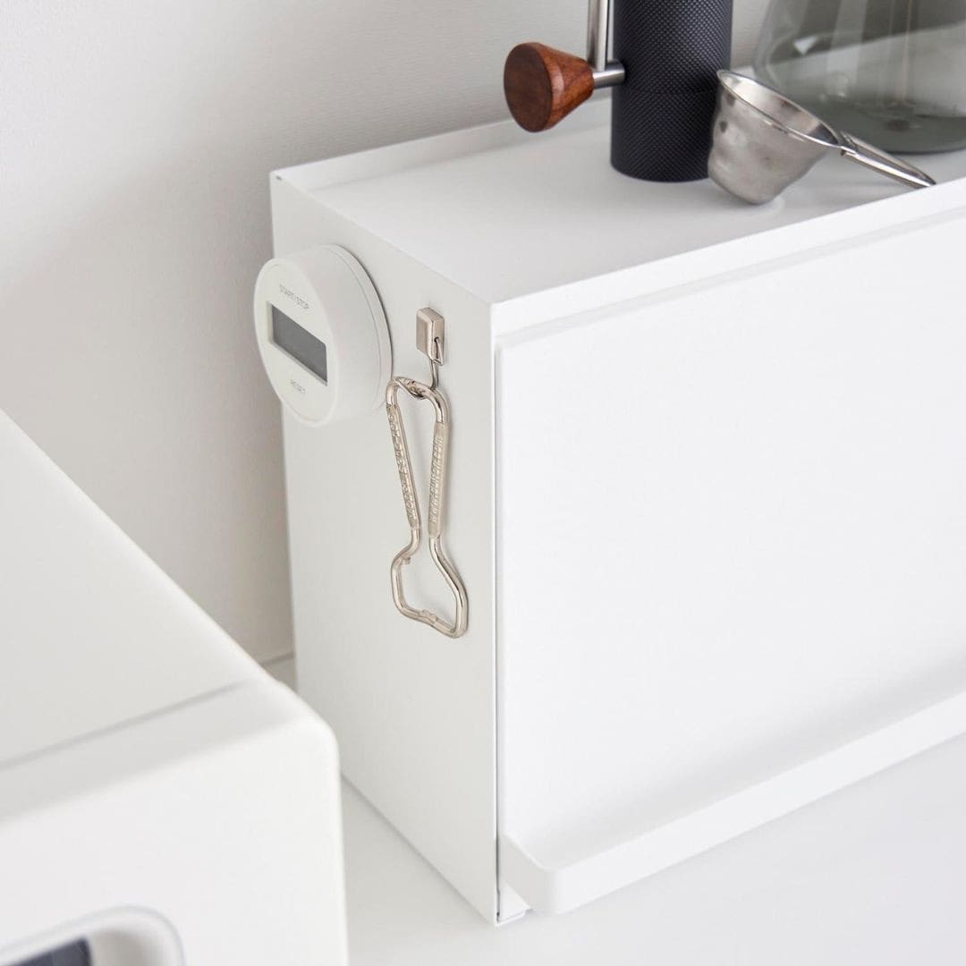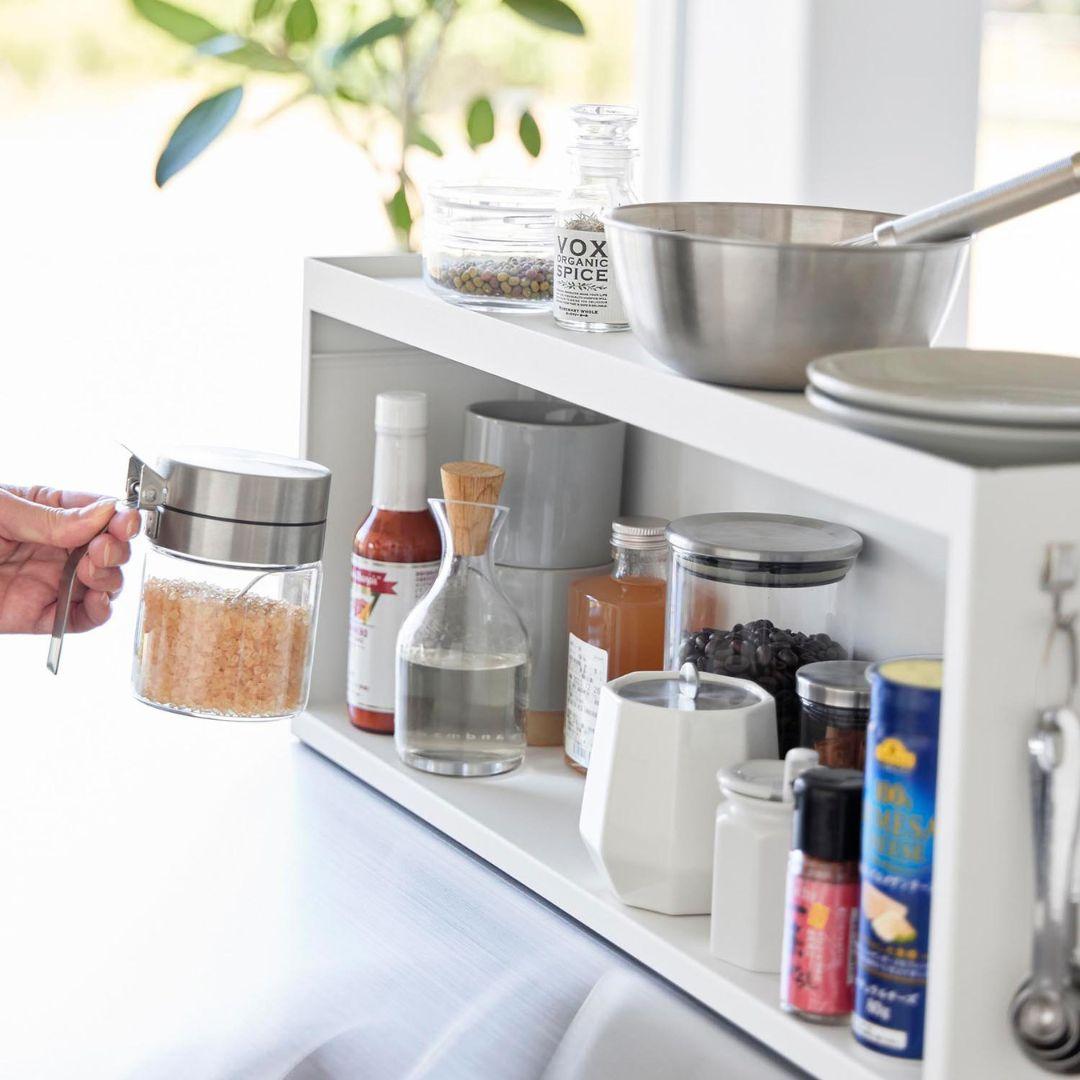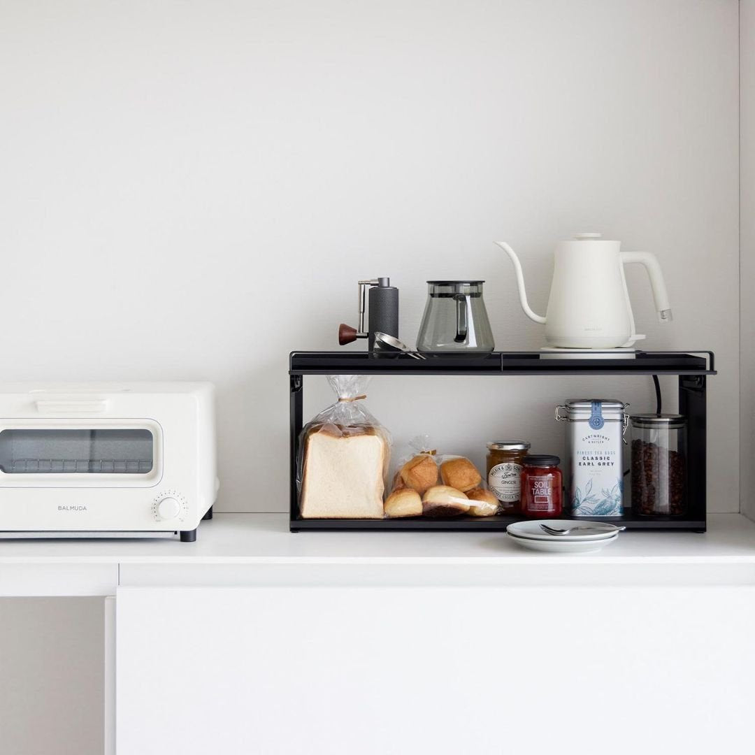 ダイニング側からもキッチン側からも取り出せる収納ラックキッチンやカウンターなどに設置してお使いいただけるフラップ扉式収納ラックです。スチール製だからマグネットを貼り付けられるのも便利。天面にはフチが付いており、上に置いたものが落ちにくい仕様です。カップボードなど壁面に沿うように設置すればオープン仕様の背面も隠せます。キッチンになじむ、2色のカラーバリエーションカラーは、明るい印象のホワイト、スタイリッシュなブラックをご用意しました。キッチンに似合うシンプルなモノトーンカラーです。キッチン小物やインテリアに合わせてお好きなカラーをお選びください。前面を隠して生活感をOFF背面はオープンになっているので、カウンターに置いておけばキッチン側からはノーアクションで、カウンター側からはフラップ扉をスッと持ち上げればスムーズに取り出せます。普段は扉が目隠しになっているのでいろいろな物を収納していてもごちゃごちゃして見えません。ティーブレイク、朝の一杯の準備をここで完結奥行15cmでコーヒー豆や紅茶を入れているキャニスター、調味料がちょうど良く収まるサイズ感です。収納ラックの天面にはコーヒーポットなどを置いておけます。コーヒー豆、マドラー、スティックシュガー、ミルクなど一式揃えておくとコーヒーの準備がラクちん。サイズが選べる2パターン展開奥行15cmタイプ、奥行き24cmタイプの2サイズをご用意しております。設置場所に合わせてちょうど良いサイズをお選びください。※こちらの商品は『前が開くキッチンカウンター上収納ラック D15』の商品となり、『前が開くキッチンカウンター上収納ラック D24』の商品は別売です。