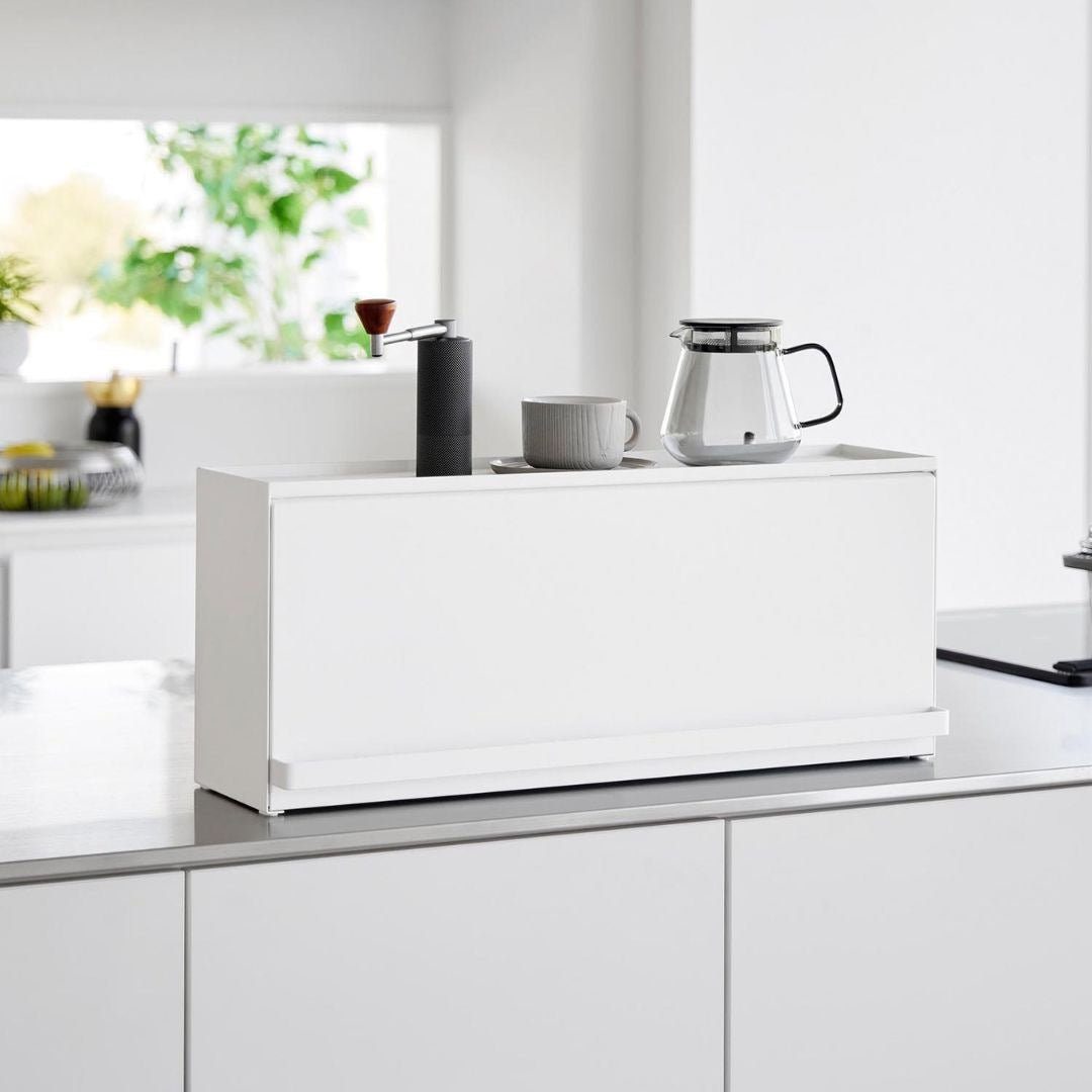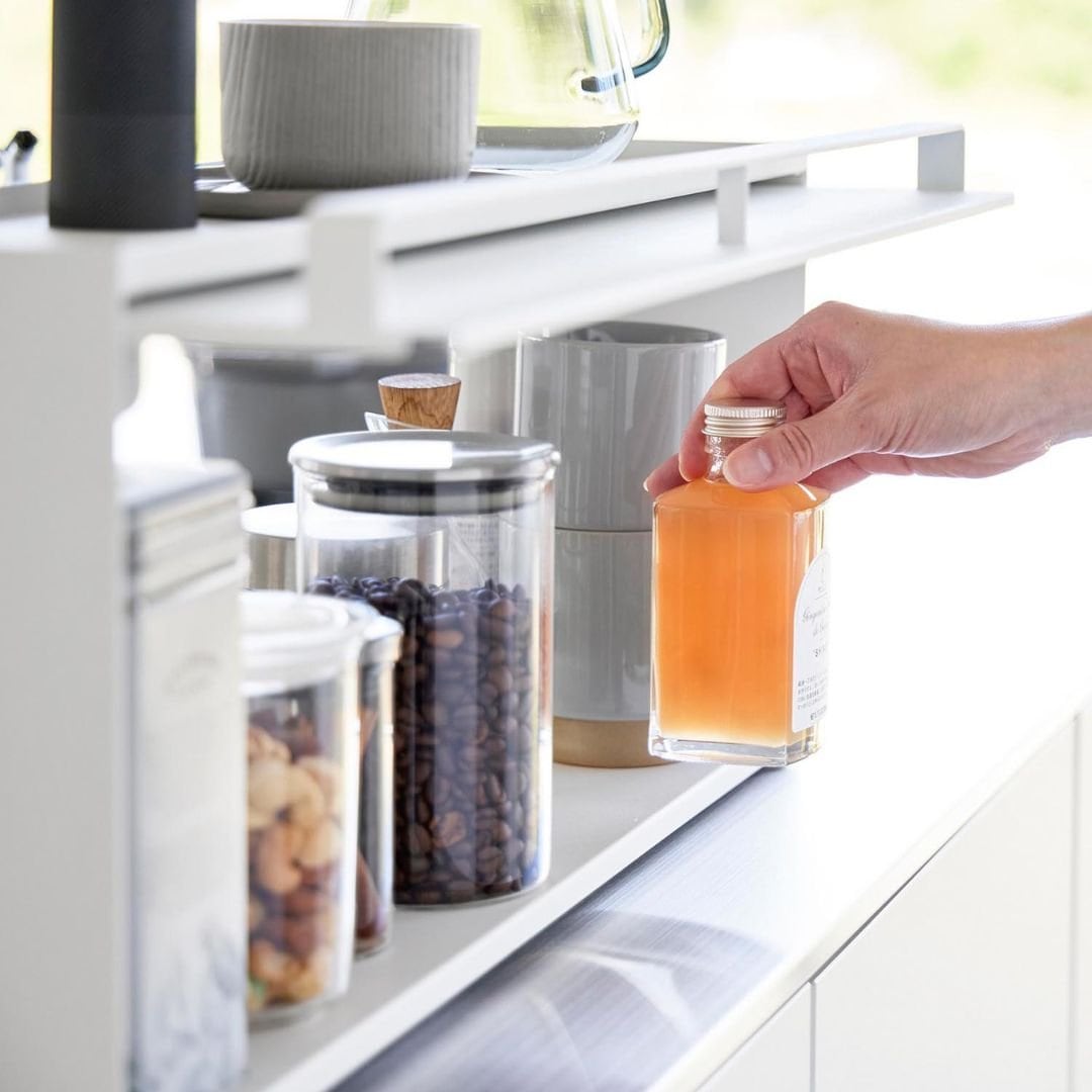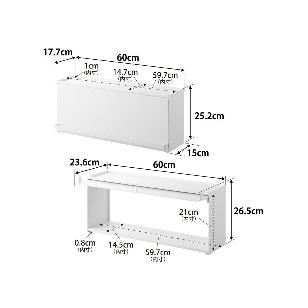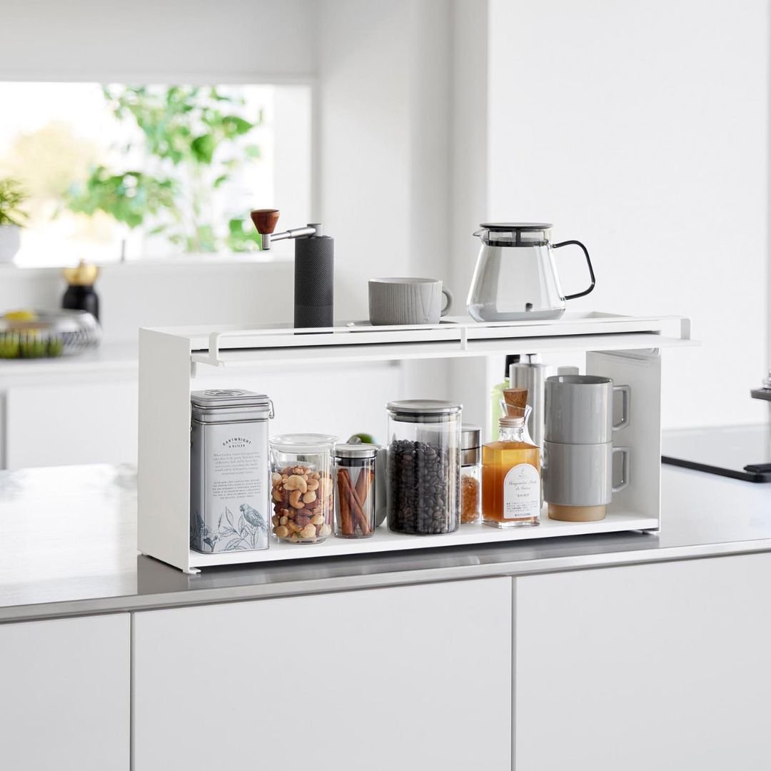 ダイニング側からもキッチン側からも取り出せる収納ラックキッチンやカウンターなどに設置してお使いいただけるフラップ扉式収納ラックです。スチール製だからマグネットを貼り付けられるのも便利。天面にはフチが付いており、上に置いたものが落ちにくい仕様です。カップボードなど壁面に沿うように設置すればオープン仕様の背面も隠せます。キッチンになじむ、2色のカラーバリエーションカラーは、明るい印象のホワイト、スタイリッシュなブラックをご用意しました。キッチンに似合うシンプルなモノトーンカラーです。キッチン小物やインテリアに合わせてお好きなカラーをお選びください。前面を隠して生活感をOFF背面はオープンになっているので、カウンターに置いておけばキッチン側からはノーアクションで、カウンター側からはフラップ扉をスッと持ち上げればスムーズに取り出せます。普段は扉が目隠しになっているのでいろいろな物を収納していてもごちゃごちゃして見えません。ティーブレイク、朝の一杯の準備をここで完結奥行15cmでコーヒー豆や紅茶を入れているキャニスター、調味料がちょうど良く収まるサイズ感です。収納ラックの天面にはコーヒーポットなどを置いておけます。コーヒー豆、マドラー、スティックシュガー、ミルクなど一式揃えておくとコーヒーの準備がラクちん。サイズが選べる2パターン展開奥行15cmタイプ、奥行き24cmタイプの2サイズをご用意しております。設置場所に合わせてちょうど良いサイズをお選びください。※こちらの商品は『前が開くキッチンカウンター上収納ラック D15』の商品となり、『前が開くキッチンカウンター上収納ラック D24』の商品は別売です。