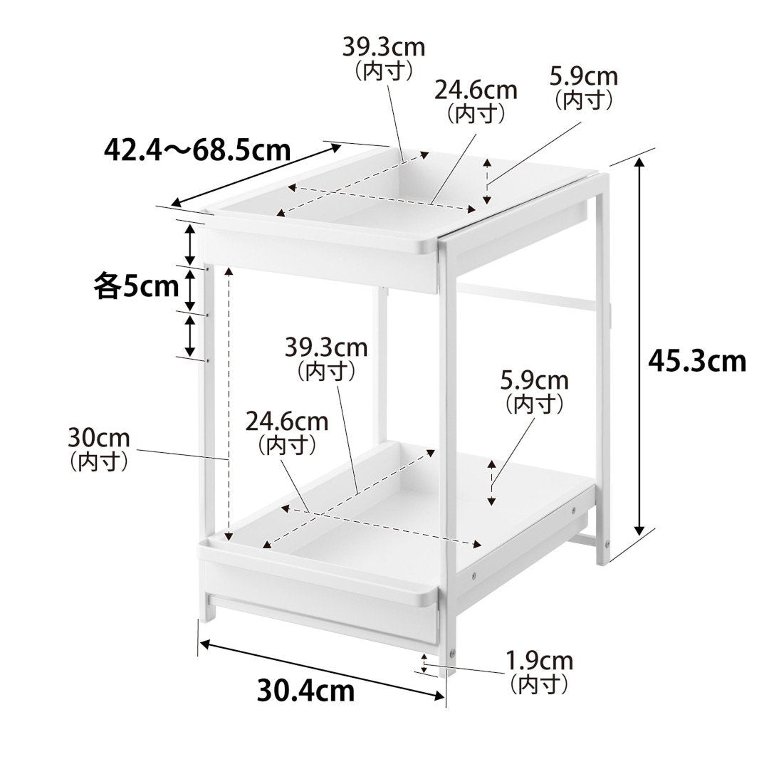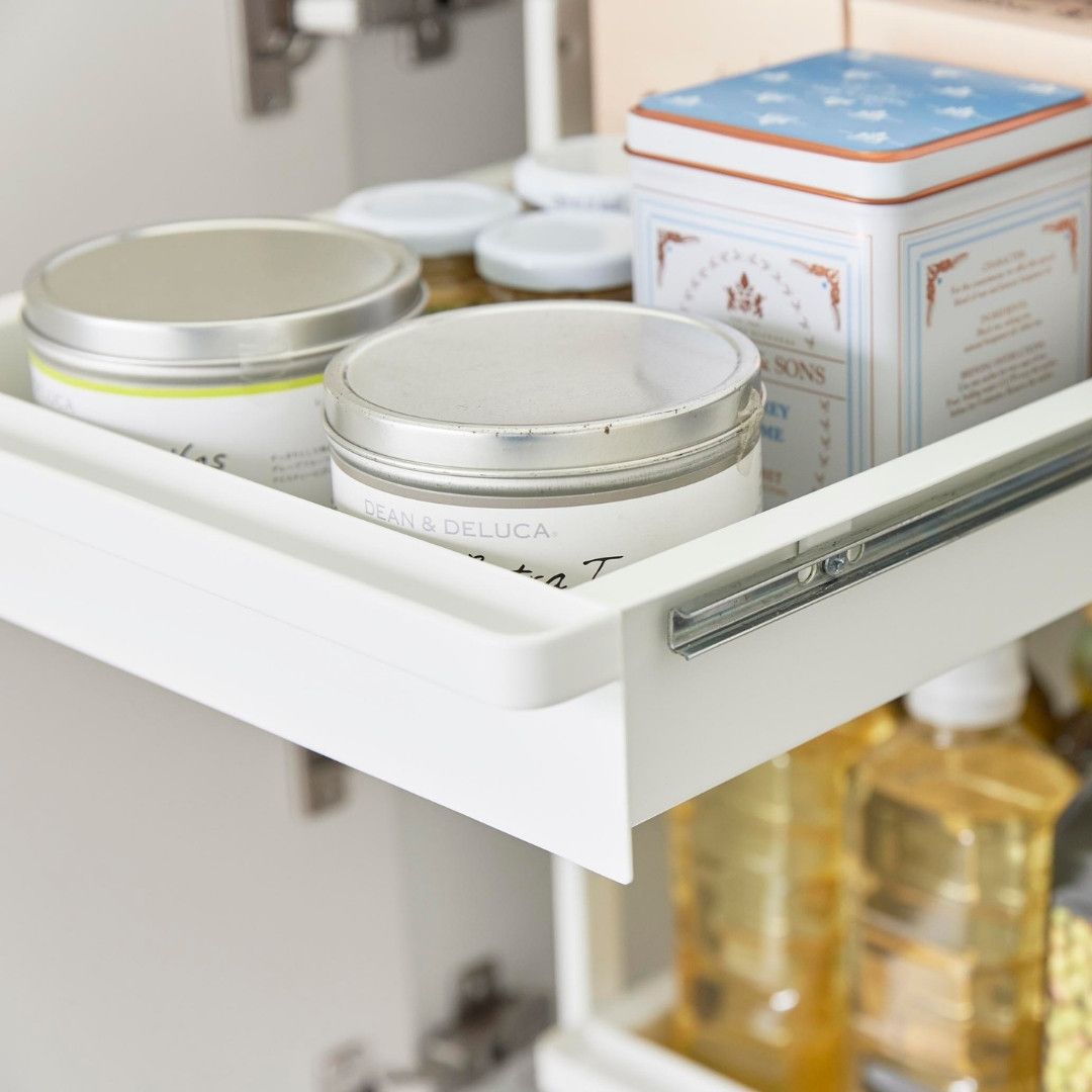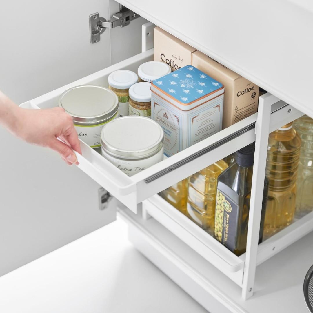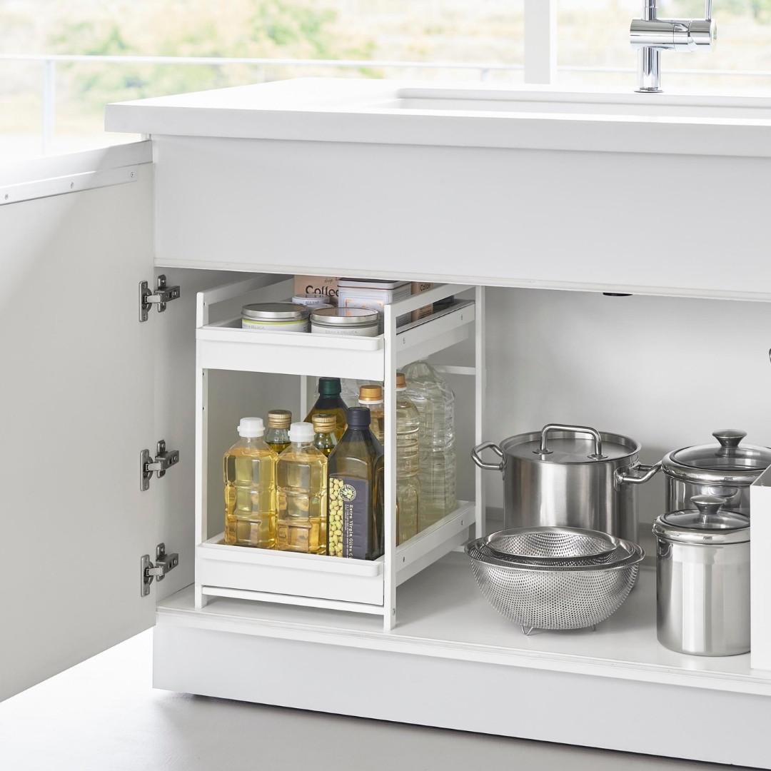 ラクに引き出せるハンドル付きスライドラック奥に収納したものが取り出しやすいスライド式のシンク下ラックです。上段は5cm刻みで四段階に高さを変更できます。収納物に合わせて変えられるので、下段に高さのある調味料を収納したいときにも便利です。キッチンや洗面所になじむ、2色のカラーバリエーション カラーは、清潔感のあるホワイト、スタイリッシュなブラックをご用意しました。シンプルなモノトーンカラーは主張が控えめで、調味料を探すときにも色味が視界の邪魔になりません。シンク下のその他の収納用品をあわせたカラーを選ぶと統一感が出ておすすめです。しまいっぱなしで忘れる、を防止。 スライドレール付きの引き出しで奥に入れたものもスムーズに取り出せます。手前の物が邪魔で奥の物の存在を忘れがち。でもスライド式なら簡単に取り出せるから長期間のしまいっぱなしを防ぎ、賞味期限切れやストックがあるのに同じものを買ってしまうのを回避。 重さのあるボトルや缶の収納もバッチリ 丈夫なスチール製で、耐荷重は上段が5kg、下段が10kgです。上段にはホールトマトやご飯のおともなどの瓶や缶詰、下段には料理酒や調理用オイルなどをたっぷりと収納でます。セール時に購入したストック品も入る大容量。洗面所でサニタリー収納 洗面台下のスペースにも設置していただけます。洗濯用洗剤やバス用品、シャンプーやボディーソープの詰め替えも手に取りやすく収納が可能です。ラック内に小さなカゴを置いておけば、洗濯用ネットやピンチなどの小物類もまとめて収納できます。
