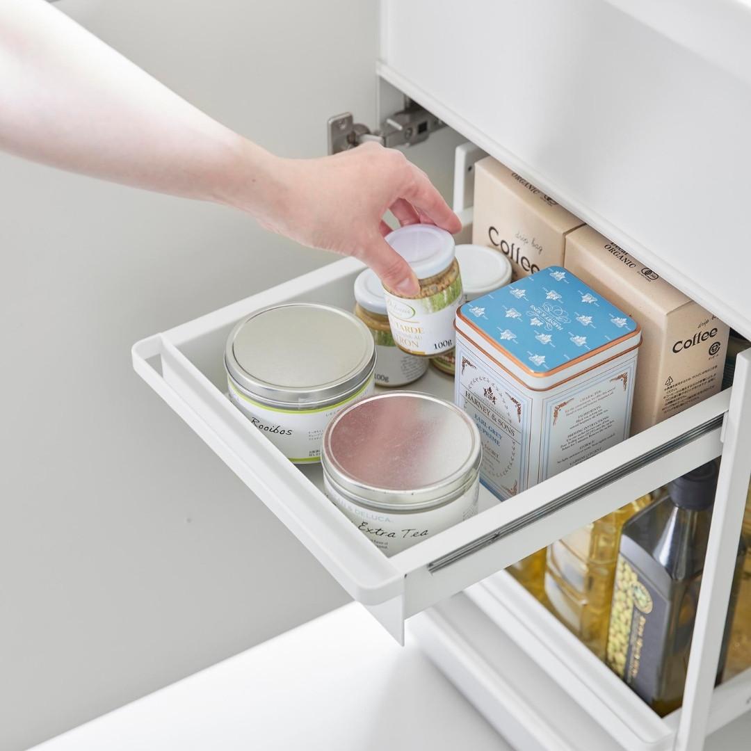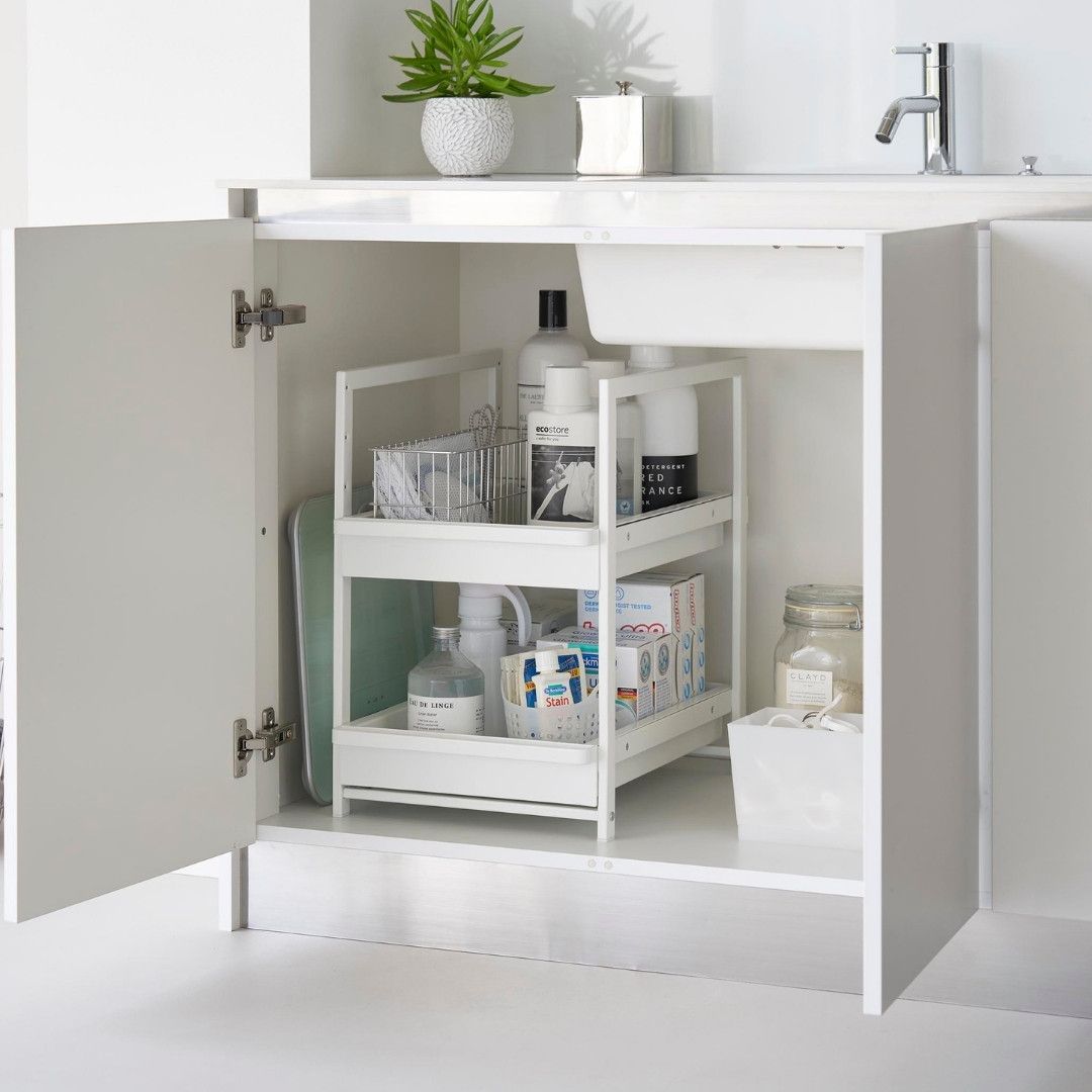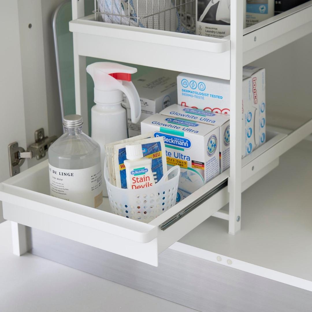 ラクに引き出せるハンドル付きスライドラック奥に収納したものが取り出しやすいスライド式のシンク下ラックです。上段は5cm刻みで四段階に高さを変更できます。収納物に合わせて変えられるので、下段に高さのある調味料を収納したいときにも便利です。キッチンや洗面所になじむ、2色のカラーバリエーション カラーは、清潔感のあるホワイト、スタイリッシュなブラックをご用意しました。シンプルなモノトーンカラーは主張が控えめで、調味料を探すときにも色味が視界の邪魔になりません。シンク下のその他の収納用品をあわせたカラーを選ぶと統一感が出ておすすめです。しまいっぱなしで忘れる、を防止。 スライドレール付きの引き出しで奥に入れたものもスムーズに取り出せます。手前の物が邪魔で奥の物の存在を忘れがち。でもスライド式なら簡単に取り出せるから長期間のしまいっぱなしを防ぎ、賞味期限切れやストックがあるのに同じものを買ってしまうのを回避。 重さのあるボトルや缶の収納もバッチリ 丈夫なスチール製で、耐荷重は上段が5kg、下段が10kgです。上段にはホールトマトやご飯のおともなどの瓶や缶詰、下段には料理酒や調理用オイルなどをたっぷりと収納でます。セール時に購入したストック品も入る大容量。洗面所でサニタリー収納 洗面台下のスペースにも設置していただけます。洗濯用洗剤やバス用品、シャンプーやボディーソープの詰め替えも手に取りやすく収納が可能です。ラック内に小さなカゴを置いておけば、洗濯用ネットやピンチなどの小物類もまとめて収納できます。