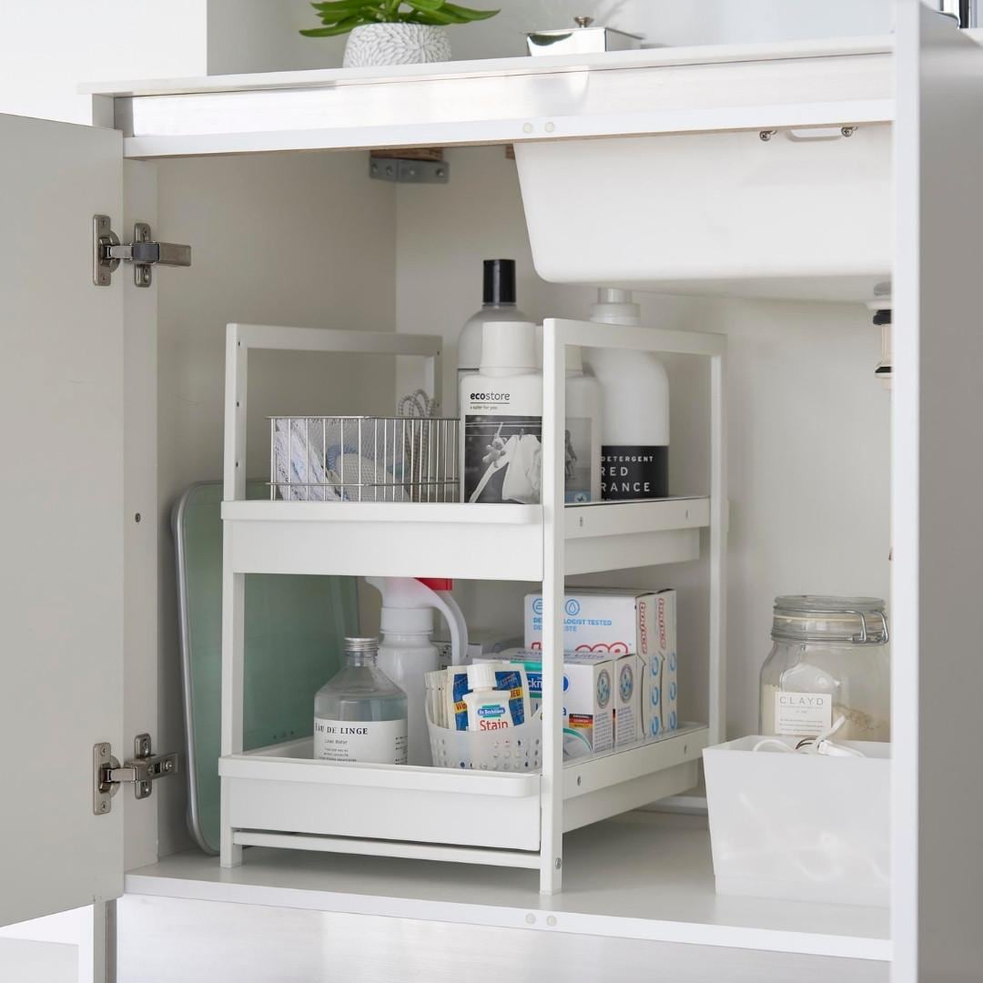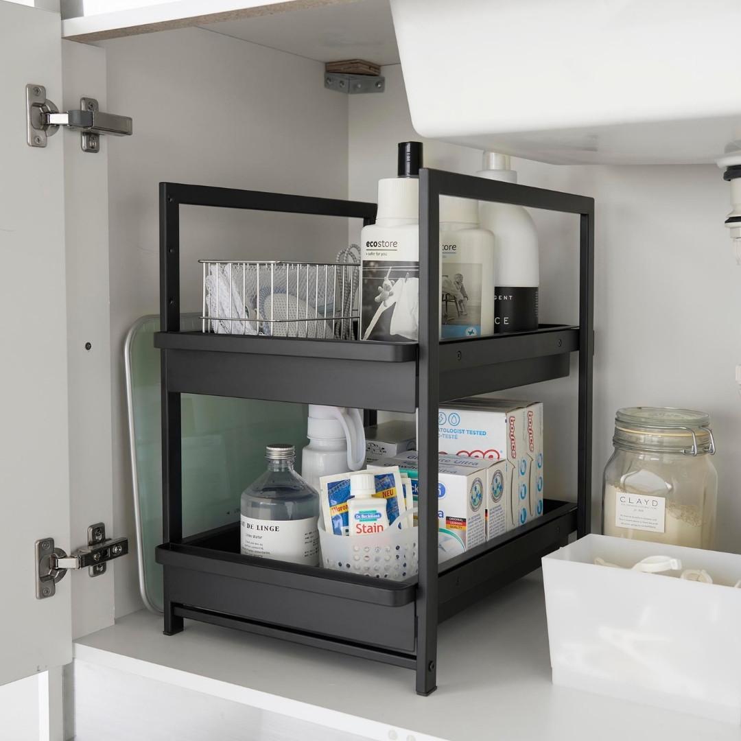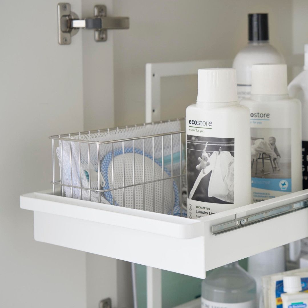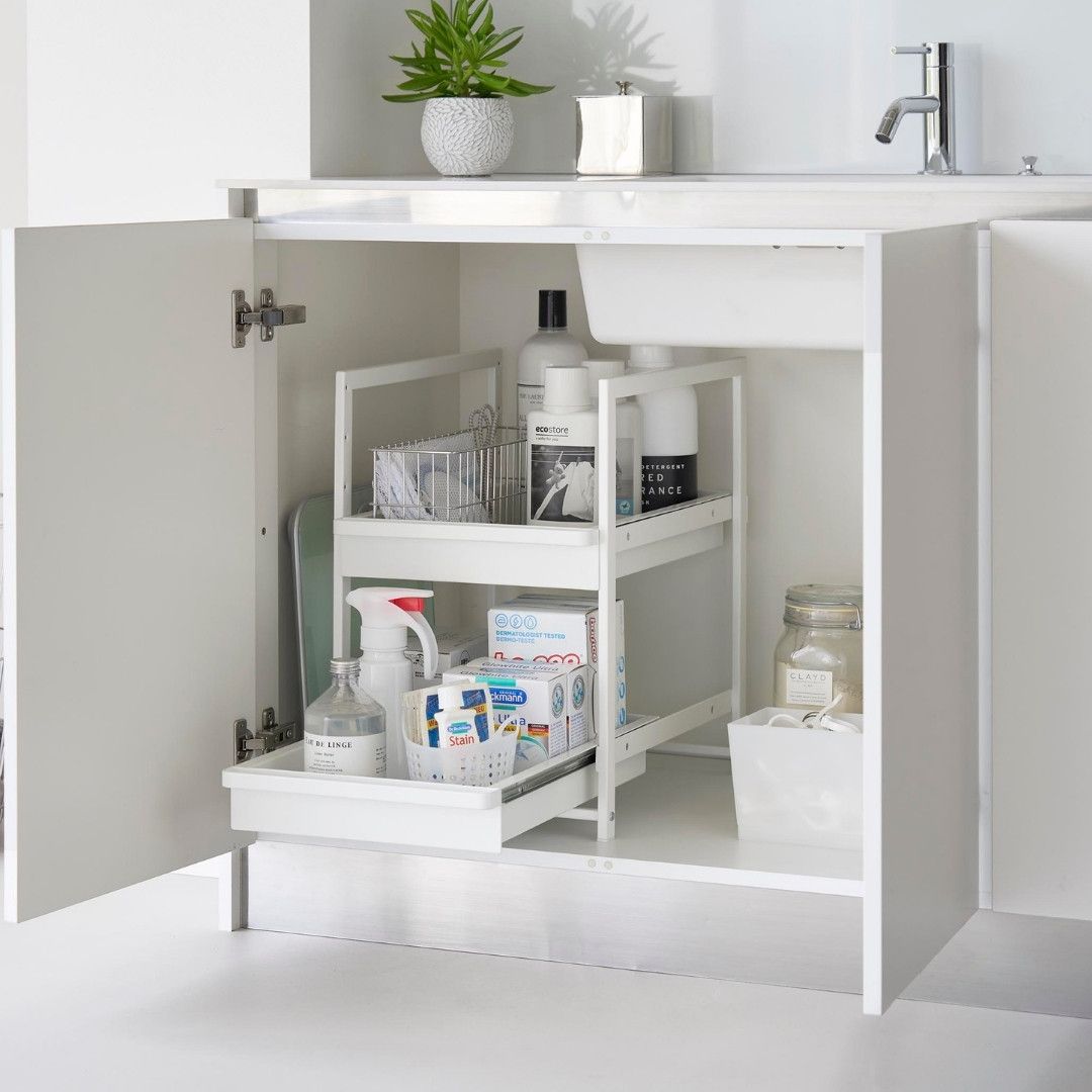 ラクに引き出せるハンドル付きスライドラック奥に収納したものが取り出しやすいスライド式のシンク下ラックです。上段は5cm刻みで四段階に高さを変更できます。収納物に合わせて変えられるので、下段に高さのある調味料を収納したいときにも便利です。キッチンや洗面所になじむ、2色のカラーバリエーション カラーは、清潔感のあるホワイト、スタイリッシュなブラックをご用意しました。シンプルなモノトーンカラーは主張が控えめで、調味料を探すときにも色味が視界の邪魔になりません。シンク下のその他の収納用品をあわせたカラーを選ぶと統一感が出ておすすめです。しまいっぱなしで忘れる、を防止。 スライドレール付きの引き出しで奥に入れたものもスムーズに取り出せます。手前の物が邪魔で奥の物の存在を忘れがち。でもスライド式なら簡単に取り出せるから長期間のしまいっぱなしを防ぎ、賞味期限切れやストックがあるのに同じものを買ってしまうのを回避。 重さのあるボトルや缶の収納もバッチリ 丈夫なスチール製で、耐荷重は上段が5kg、下段が10kgです。上段にはホールトマトやご飯のおともなどの瓶や缶詰、下段には料理酒や調理用オイルなどをたっぷりと収納でます。セール時に購入したストック品も入る大容量。洗面所でサニタリー収納 洗面台下のスペースにも設置していただけます。洗濯用洗剤やバス用品、シャンプーやボディーソープの詰め替えも手に取りやすく収納が可能です。ラック内に小さなカゴを置いておけば、洗濯用ネットやピンチなどの小物類もまとめて収納できます。