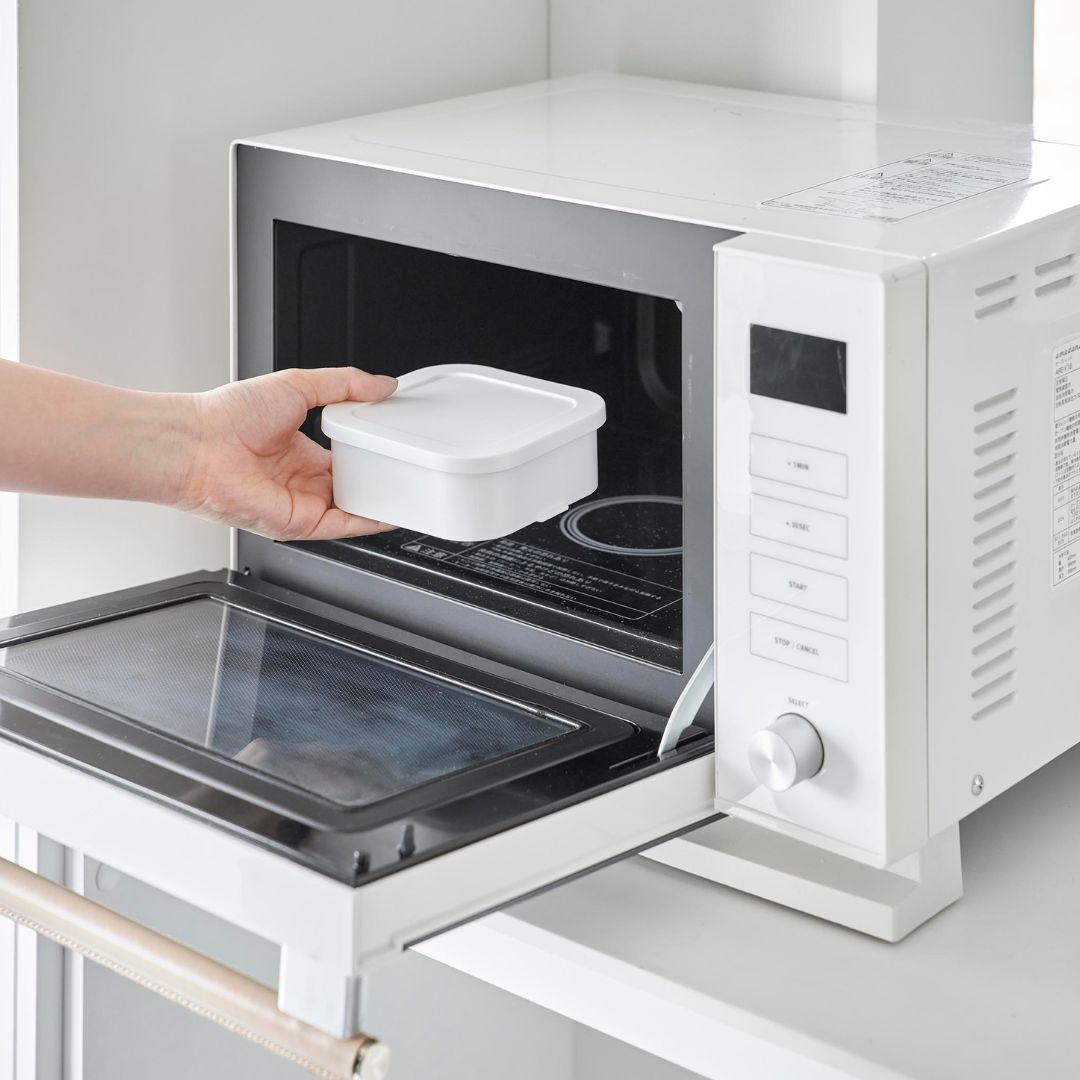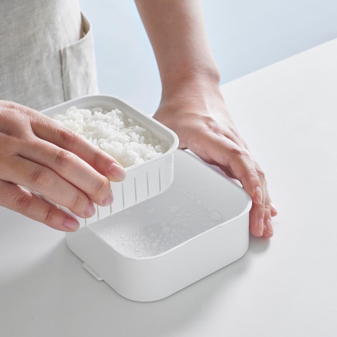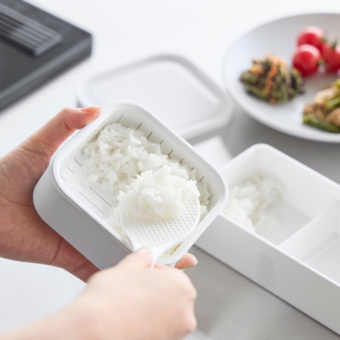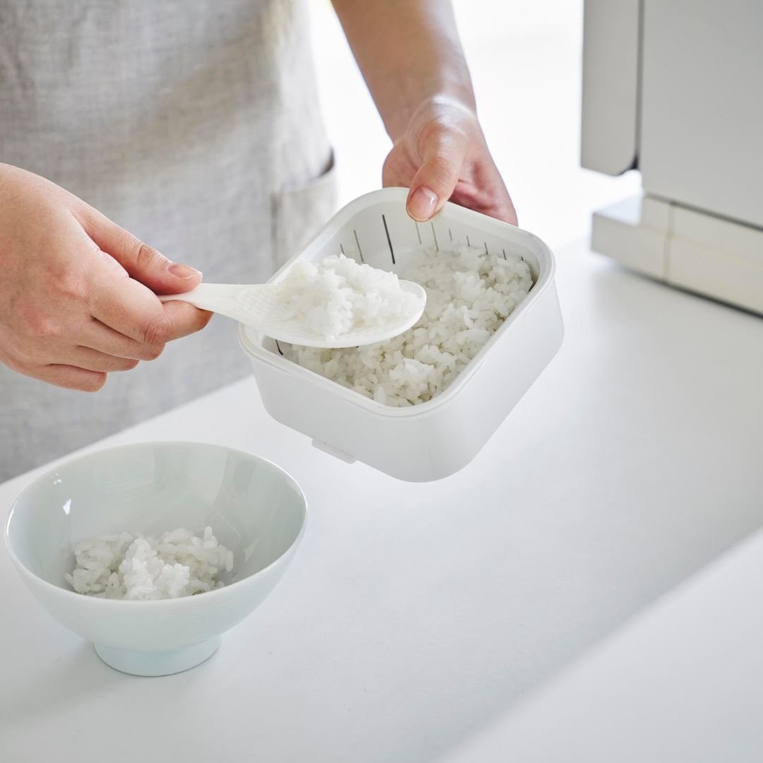 スチームのような効果でふっくら食感に蓋をしたまま電子レンジで温めるだけで、炊き立てのようなごはんに仕上がります。ザルが付いた二重構造の容器により、蒸し器のように蒸気がごはん全体に行き渡りムラなくふっくらとおいしいごはんに。蒸し器代わりとして冷凍焼売や温野菜作りにもご活用いただけます。キッチンになじむ、2色のカラーバリエーションカラーは、清潔感のあるホワイト、スタイリッシュなブラックをご用意しました。キッチンに似合うシンプルなモノトーンカラーです。キッチン小物やインテリアに合わせてお好きなカラーをお選びください。「べたっとしたおいしくないごはん」にならないごはんが解凍される際に余分な水分がザルから落ちることで、べたつきや水っぽさを感じないごはんに仕上がります。冷凍ごはんにありがちだった『容器底のごはんがべちゃっとしてる』問題を、ザル付き容器が解決。立てても横でもOK。 取り出しやすいように冷凍保存丸みを帯びた四角いフォルムは冷凍庫内にデッドスペースを作ることなくすっきりと保管できます。立てても横でも収納できるので、収納スペースや冷凍庫内の高さにあわせて取り出しやすいように入れていただけます。食洗機対応可能でお手入れらくちんすべてのパーツが食洗機に対応可能です。食事後は他の食器や調理器具と一緒に食洗機に入れるだけの簡単お手入れ。凹凸が少ない容器ながら手洗いもしやすいです。容器の底にある突起に指を引っ掛けると蓋を開けるのが簡単です。