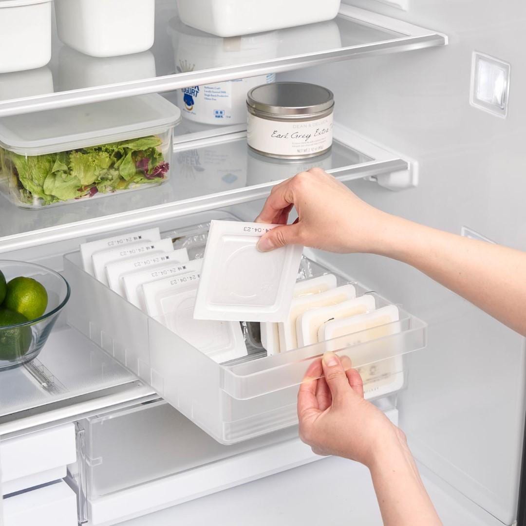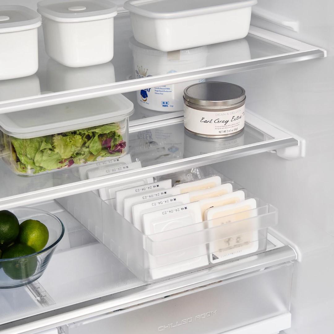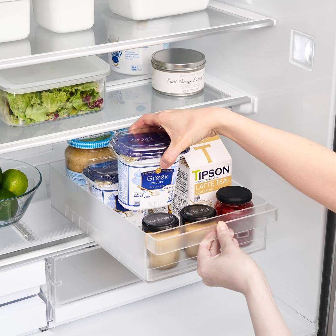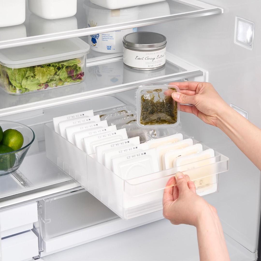 冷蔵庫の中をスッキリと整頓。奥行きのある冷蔵庫の中を無駄なく有効利用できる『冷蔵庫中収納ケースシリーズ』から、幅広のLサイズが登場。 味噌や漬物などの大きなパックや、調味料もまとめて収納。引き出して使えるから冷蔵庫の奥まで無駄なく使えます。シンプルな2種類のカラーバリエーション カラーは、清潔感のあるホワイトと、シックなブラックをご用意しました。シンプルなモノトーンカラーで、冷蔵庫の中でもなじみやすい色味です。冷蔵庫本体のカラーで選んだり、食品ごとにカラーを変えたりなどお好みに合わせてお選びください。奥のものまで取り出しやすい、便利なハンドル付き 手前にはハンドル付きでケースを取り出しやすく、しまいやすいのがうれしいポイント。「奥のものが取り出しにくい」なんて悩みも、ケースを引っ張ることで簡単に解決。底面に凹凸があるので立てて見やすく収納でき、定期的な冷蔵庫内の整理もしやすくなります。冷蔵庫の中だけじゃない。パントリーの使用にも こちらの仕切り付き収納ケースは、冷蔵庫の中だけでなくパントリーや食器棚での使用にもおすすめです。縦収納することで、手前から順に消費もでき、取手付きで棚の奥のものも取り出しやすくなります。お好みの位置に変更できる仕切りが付いていて便利です。シリーズで合わせて使うのがおすすめ◎ 冷蔵庫中収納シリーズと並べて使えば冷蔵庫の中をスッキリ整頓できます。 こちらのLサイズの他に、『通常サイズ』『Sサイズ』『缶ストッカーS』『蓋付き卵ケース』をご用意しております。お好みのサイズを組み合わせてお使いいただくと、より使い勝手も便利に◎。※同シリーズの他サイズにつきましては別ページにてご確認いただけます。