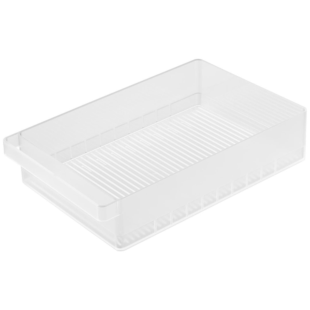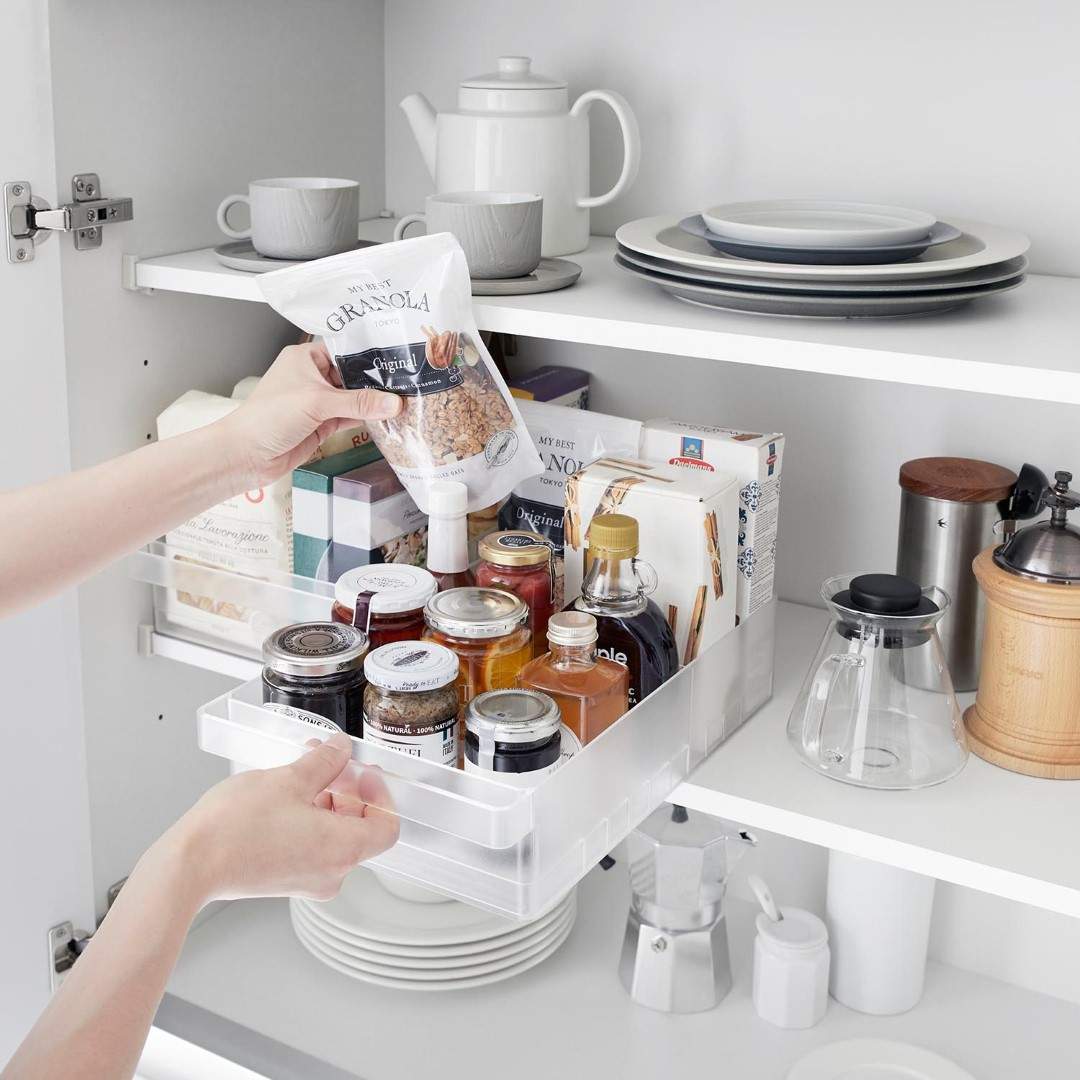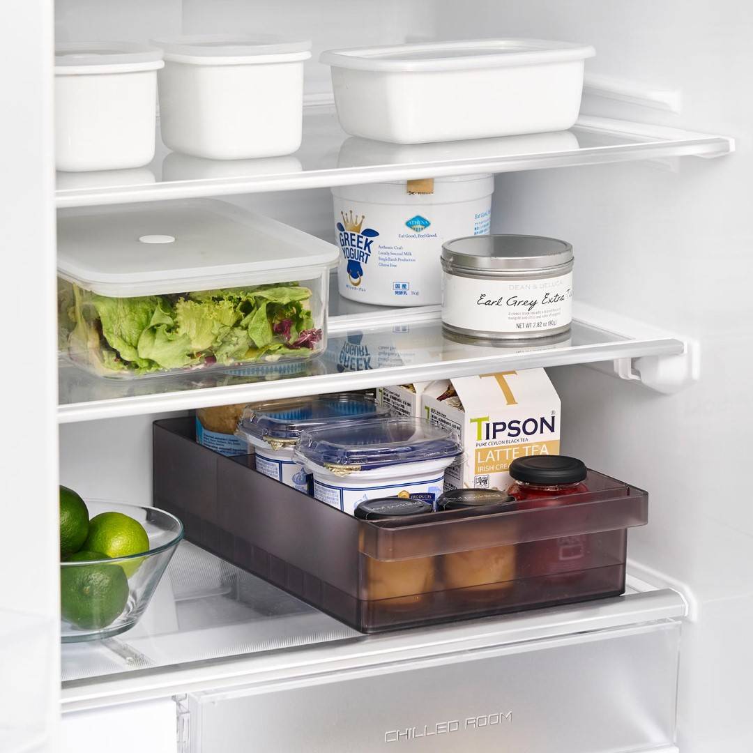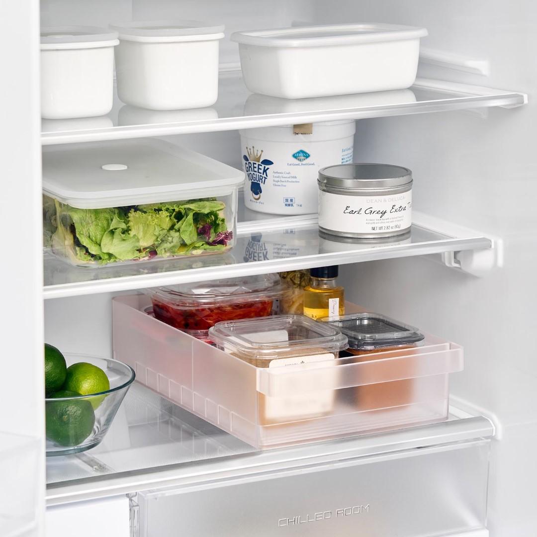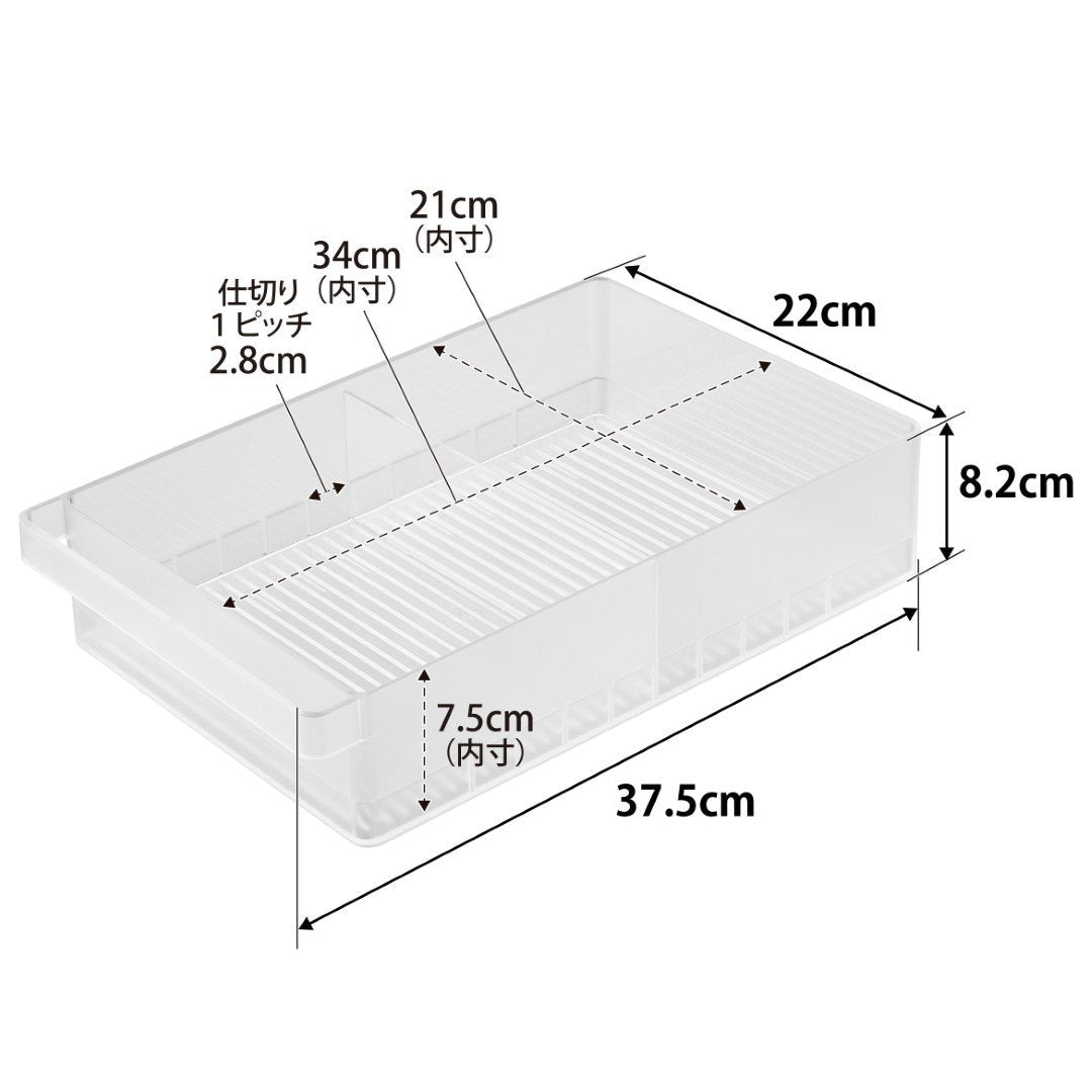 冷蔵庫の中をスッキリと整頓。奥行きのある冷蔵庫の中を無駄なく有効利用できる『冷蔵庫中収納ケースシリーズ』から、幅広のLサイズが登場。 味噌や漬物などの大きなパックや、調味料もまとめて収納。引き出して使えるから冷蔵庫の奥まで無駄なく使えます。シンプルな2種類のカラーバリエーション カラーは、清潔感のあるホワイトと、シックなブラックをご用意しました。シンプルなモノトーンカラーで、冷蔵庫の中でもなじみやすい色味です。冷蔵庫本体のカラーで選んだり、食品ごとにカラーを変えたりなどお好みに合わせてお選びください。奥のものまで取り出しやすい、便利なハンドル付き 手前にはハンドル付きでケースを取り出しやすく、しまいやすいのがうれしいポイント。「奥のものが取り出しにくい」なんて悩みも、ケースを引っ張ることで簡単に解決。底面に凹凸があるので立てて見やすく収納でき、定期的な冷蔵庫内の整理もしやすくなります。冷蔵庫の中だけじゃない。パントリーの使用にも こちらの仕切り付き収納ケースは、冷蔵庫の中だけでなくパントリーや食器棚での使用にもおすすめです。縦収納することで、手前から順に消費もでき、取手付きで棚の奥のものも取り出しやすくなります。お好みの位置に変更できる仕切りが付いていて便利です。シリーズで合わせて使うのがおすすめ◎ 冷蔵庫中収納シリーズと並べて使えば冷蔵庫の中をスッキリ整頓できます。 こちらのLサイズの他に、『通常サイズ』『Sサイズ』『缶ストッカーS』『蓋付き卵ケース』をご用意しております。お好みのサイズを組み合わせてお使いいただくと、より使い勝手も便利に◎。※同シリーズの他サイズにつきましては別ページにてご確認いただけます。