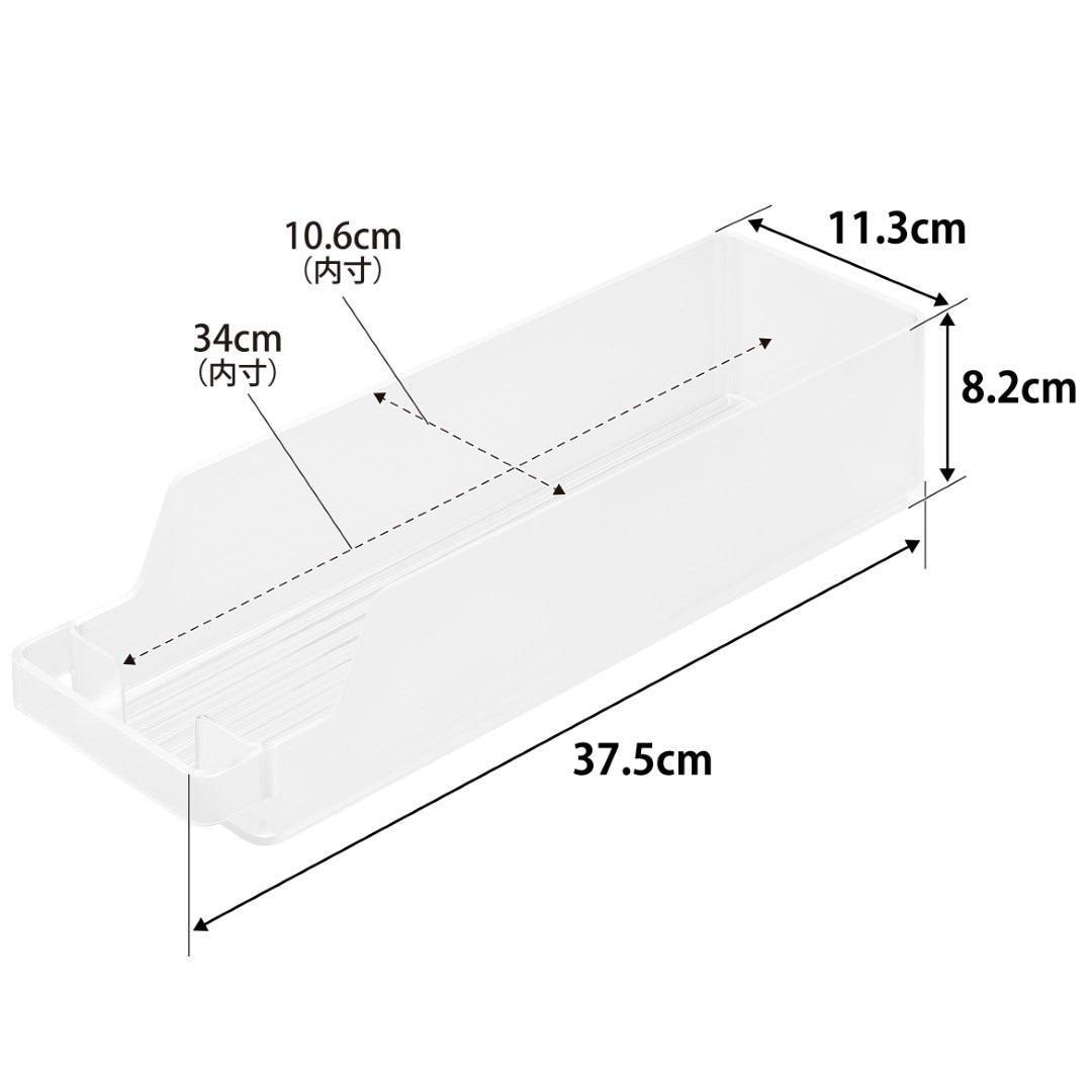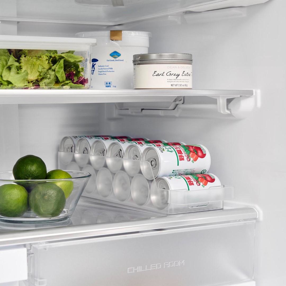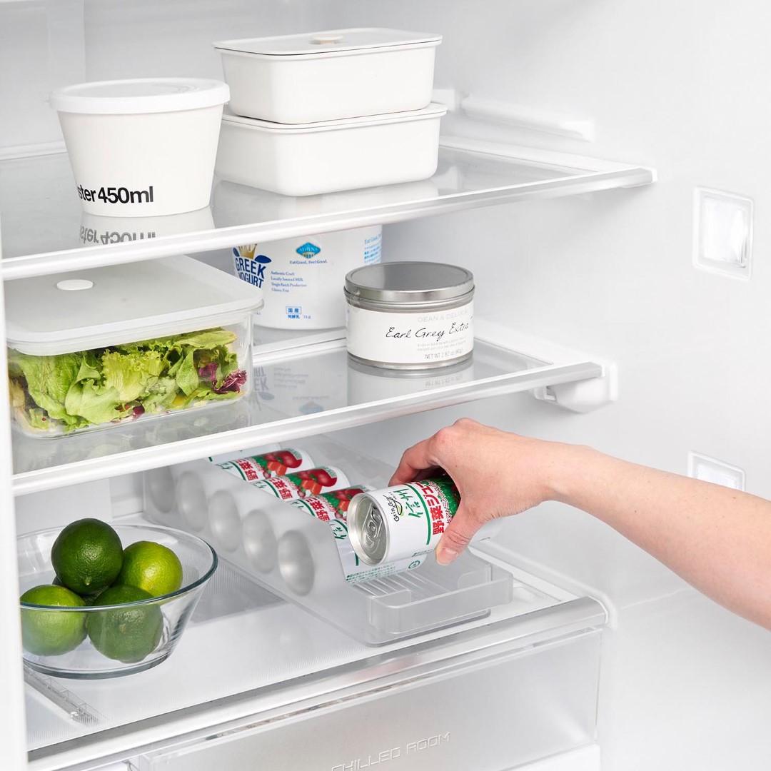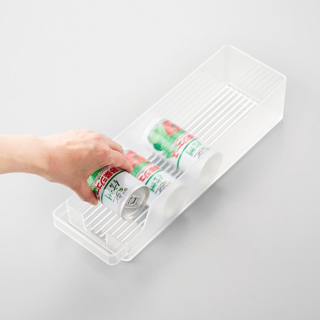 冷蔵庫の中をスッキリと整頓。奥行きのある冷蔵庫の中を無駄なく有効利用できる『冷蔵庫中収納ケースシリーズ』から、ミニ缶やスリム缶をまとめて収納できる缶ストッカーSが登場。 底面に傾斜がついていて、缶を1本取り出すごとに後ろの缶が転がって手前に出てくるミニ缶用のストッカーです。引き出して使えるから冷蔵庫の奥まで無駄なく使えます。シンプルな2種類のカラーバリエーション カラーは、清潔感のあるホワイトと、シックなブラックをご用意しました。シンプルなモノトーンカラーで、冷蔵庫の中でもなじみやすい色味です。冷蔵庫本体のカラーで選んだり、食品ごとにカラーを変えたりなどお好みに合わせてお選びください。いつでも手前からとれる設計 底面に傾斜がついているので缶を1本取り出すごとに後ろの缶が転がってきます。いちいち手前に移動させなくても、常に手前からとれるのはうれしいポイント◎。スリム缶なら立てて12本まで収納でき、10.6cm以内の缶なら横向きに収納できます。冷蔵庫の中だけじゃない。パントリーの使用にも こちらの収納ケースは、冷蔵庫の中だけでなくパントリーや食器棚での使用にもおすすめです。取手付きで棚の奥のものも取り出しやすくなります。缶以外に、マグボトルやお弁当箱などの収納にも。食器棚や吊り下げ戸棚での使用も便利です。シリーズで合わせて使うのがおすすめ◎ 冷蔵庫中収納シリーズと並べて使えば冷蔵庫の中をスッキリ整頓できます。 こちらの缶ストッカーSの他に、仕切り付きの『冷蔵庫中収納ケース』『蓋付き卵ケース』をご用意しております。お好みのサイズを組み合わせてお使いいただくと、より使い勝手も便利に◎。※同シリーズの他サイズにつきましては別ページにてご確認いただけます。