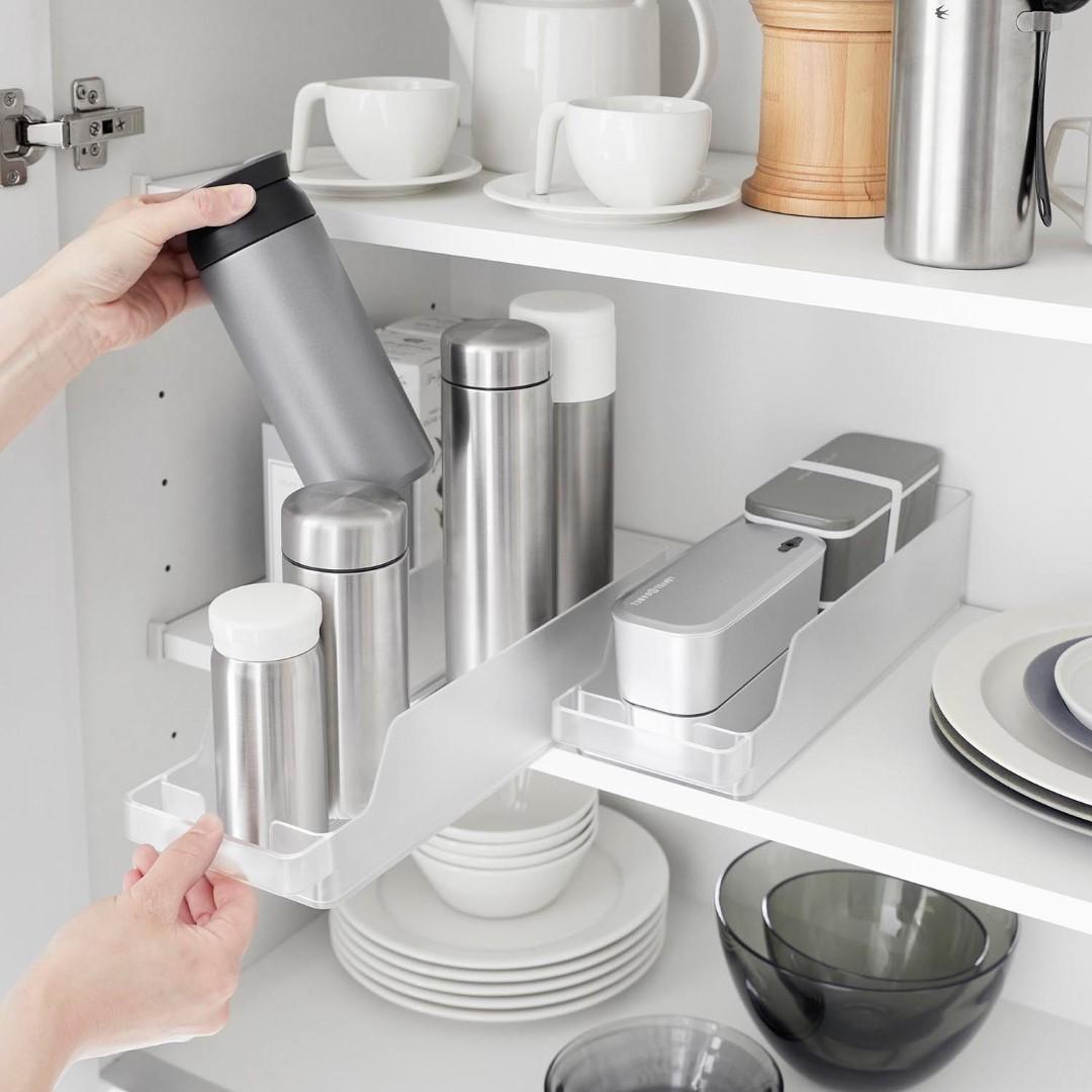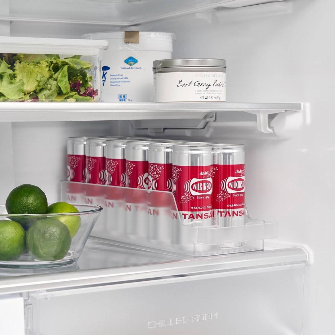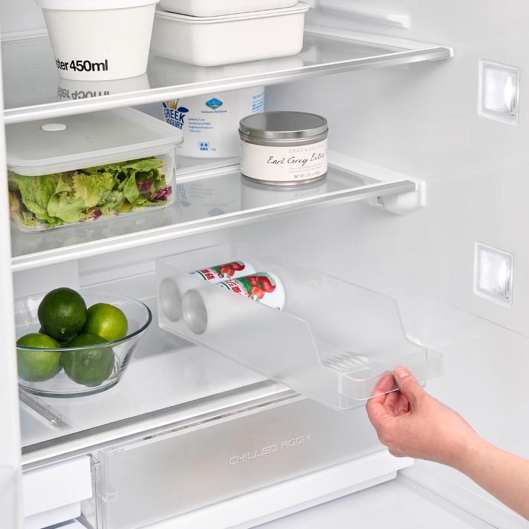 冷蔵庫の中をスッキリと整頓。奥行きのある冷蔵庫の中を無駄なく有効利用できる『冷蔵庫中収納ケースシリーズ』から、ミニ缶やスリム缶をまとめて収納できる缶ストッカーSが登場。 底面に傾斜がついていて、缶を1本取り出すごとに後ろの缶が転がって手前に出てくるミニ缶用のストッカーです。引き出して使えるから冷蔵庫の奥まで無駄なく使えます。シンプルな2種類のカラーバリエーション カラーは、清潔感のあるホワイトと、シックなブラックをご用意しました。シンプルなモノトーンカラーで、冷蔵庫の中でもなじみやすい色味です。冷蔵庫本体のカラーで選んだり、食品ごとにカラーを変えたりなどお好みに合わせてお選びください。いつでも手前からとれる設計 底面に傾斜がついているので缶を1本取り出すごとに後ろの缶が転がってきます。いちいち手前に移動させなくても、常に手前からとれるのはうれしいポイント◎。スリム缶なら立てて12本まで収納でき、10.6cm以内の缶なら横向きに収納できます。冷蔵庫の中だけじゃない。パントリーの使用にも こちらの収納ケースは、冷蔵庫の中だけでなくパントリーや食器棚での使用にもおすすめです。取手付きで棚の奥のものも取り出しやすくなります。缶以外に、マグボトルやお弁当箱などの収納にも。食器棚や吊り下げ戸棚での使用も便利です。シリーズで合わせて使うのがおすすめ◎ 冷蔵庫中収納シリーズと並べて使えば冷蔵庫の中をスッキリ整頓できます。 こちらの缶ストッカーSの他に、仕切り付きの『冷蔵庫中収納ケース』『蓋付き卵ケース』をご用意しております。お好みのサイズを組み合わせてお使いいただくと、より使い勝手も便利に◎。※同シリーズの他サイズにつきましては別ページにてご確認いただけます。