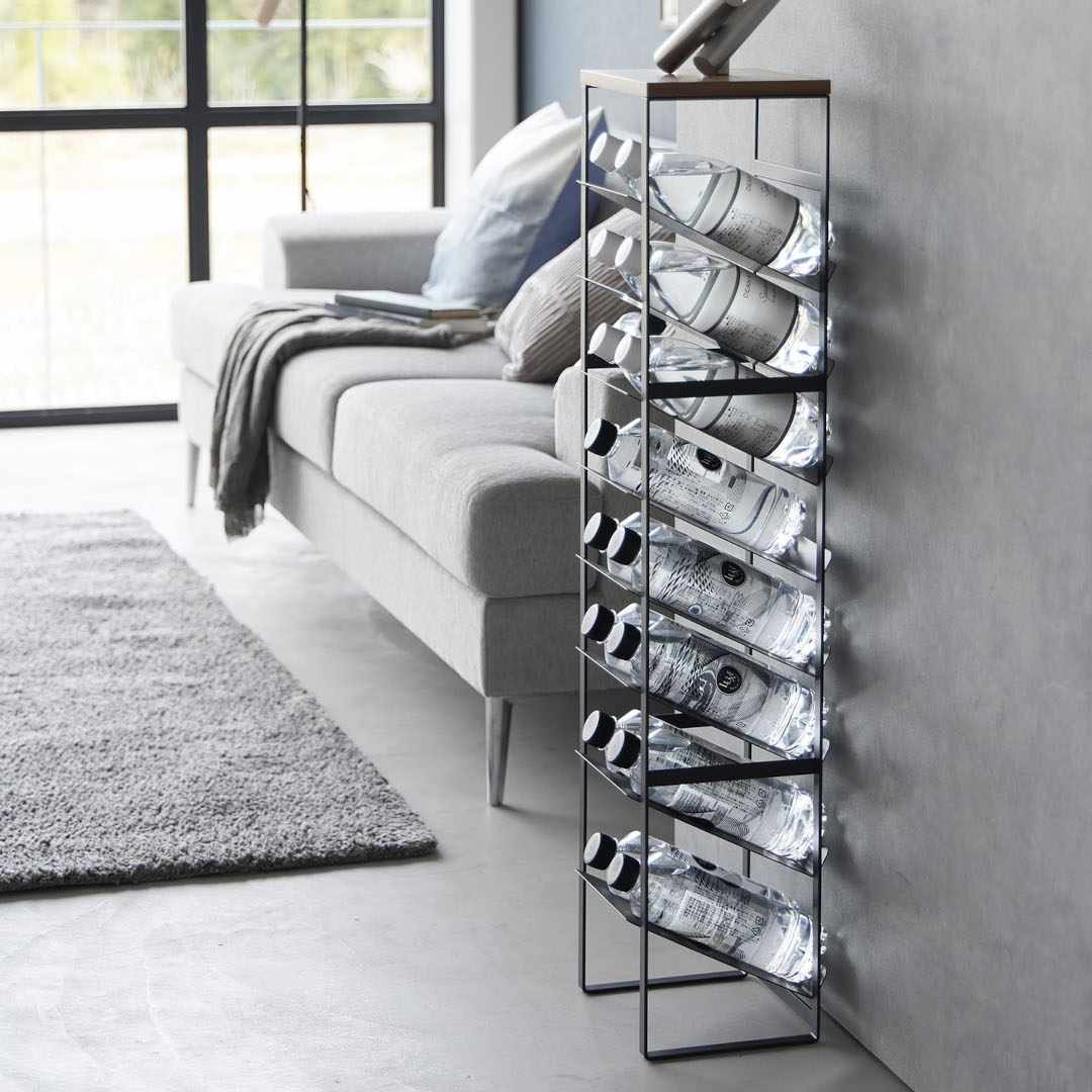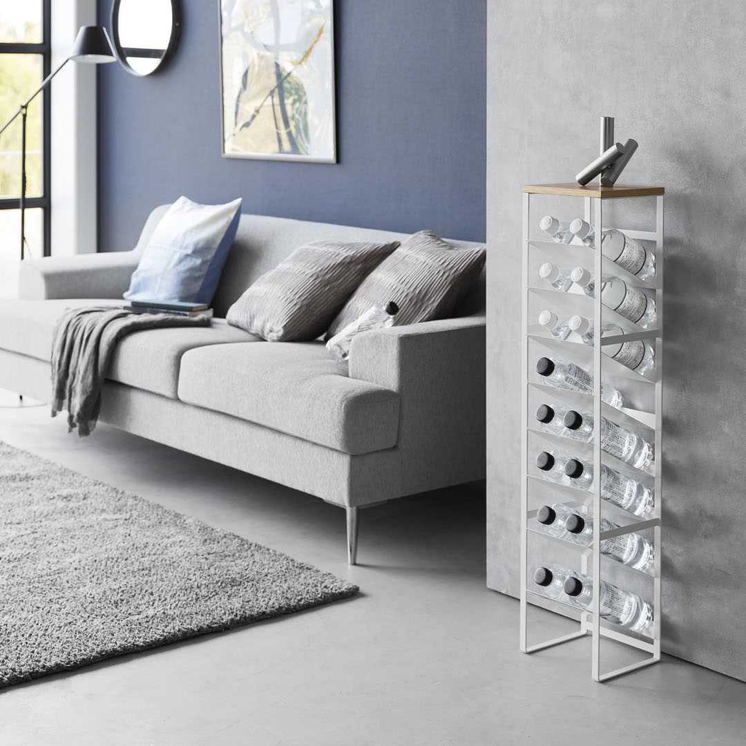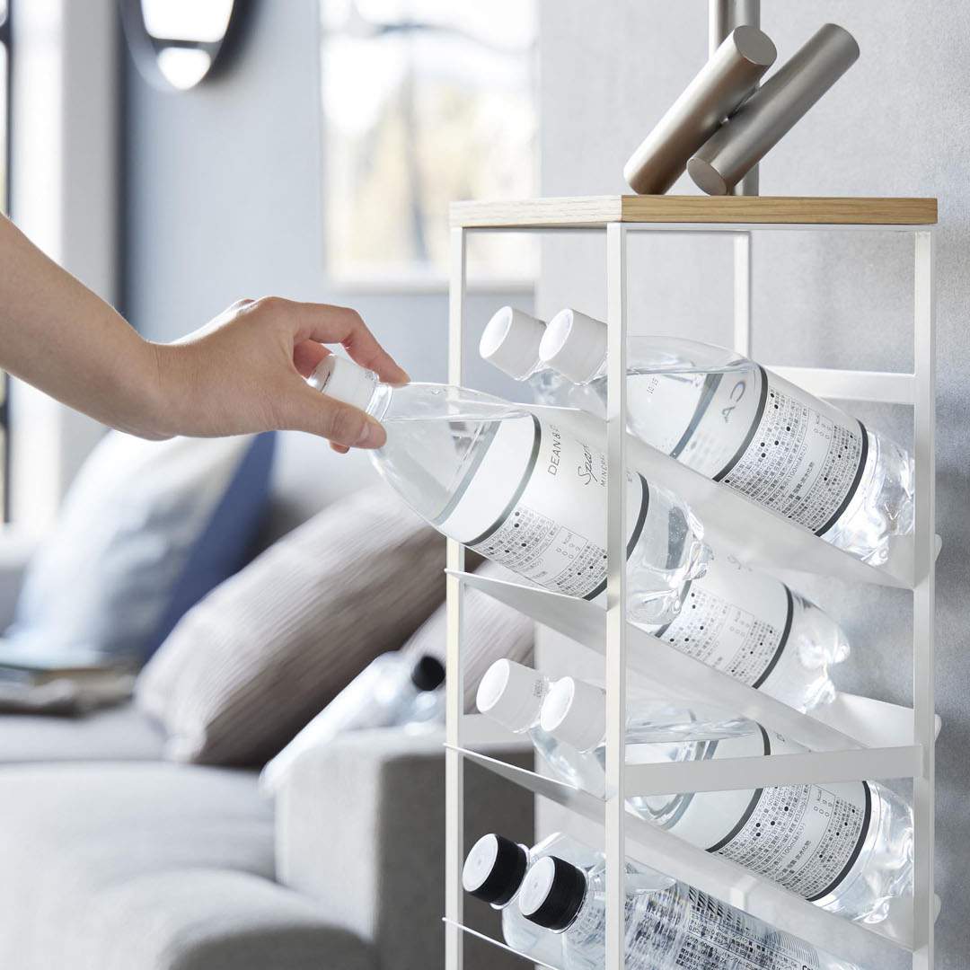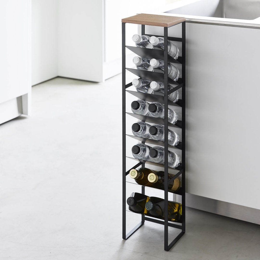 スリムなのに大容量なボトルストッカー収納場所に困って床に直置きしがちなボトル類をまとめて収納できるボトルラックです。ペットボトルや瓶類を最大16本収納できます。天然木の天板は小物置きとしてもご使用いただけます。木目模様が美しい、2色のカラーバリエーションカラーは、明るい印象のホワイト、重厚感のあるブラックをご用意しました。天然木の天板もスチールフレームに合わせたカラーリングになっています。お部屋の雰囲気に合わせてお好みのカラーをお選びください。ちょっとした隙間にスマートに収まる幅20cmのスリム設計なので冷蔵庫横などもったいないスペースを有効活用できます。キッチンでは飲料ペットボトルや調味料ボトル、ラップやアルミホイル、クッキングペーパーやボックス入りのフリーザーバッグの収納にもお使いいただけます。取り出しやすい斜め棚棚が斜めになっているためボトルが取り出しやすい仕様です。ワインボトルと一緒に水や炭酸水、ジュースなどの割り物を収納しておくのも◎箱買いして常備しているペットボトルの水もダンボールから出してストッカーに収納しておくとすっきり片付きます。大型ボトルは下の二段に収納下の二段は上の段よりも高さが少し広くなっているので、しょうゆや料理酒など大容量の調味料ボトルや焼酎を収納するのにちょうど良いスペースです。温かみのある木目模様が魅力の天板とスチールの組み合わせは、北欧風インテリアにもホテルライクなお部屋にもよく合います。