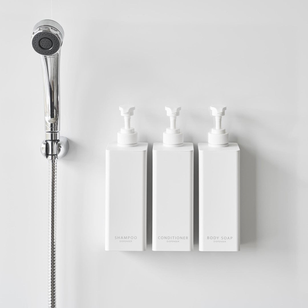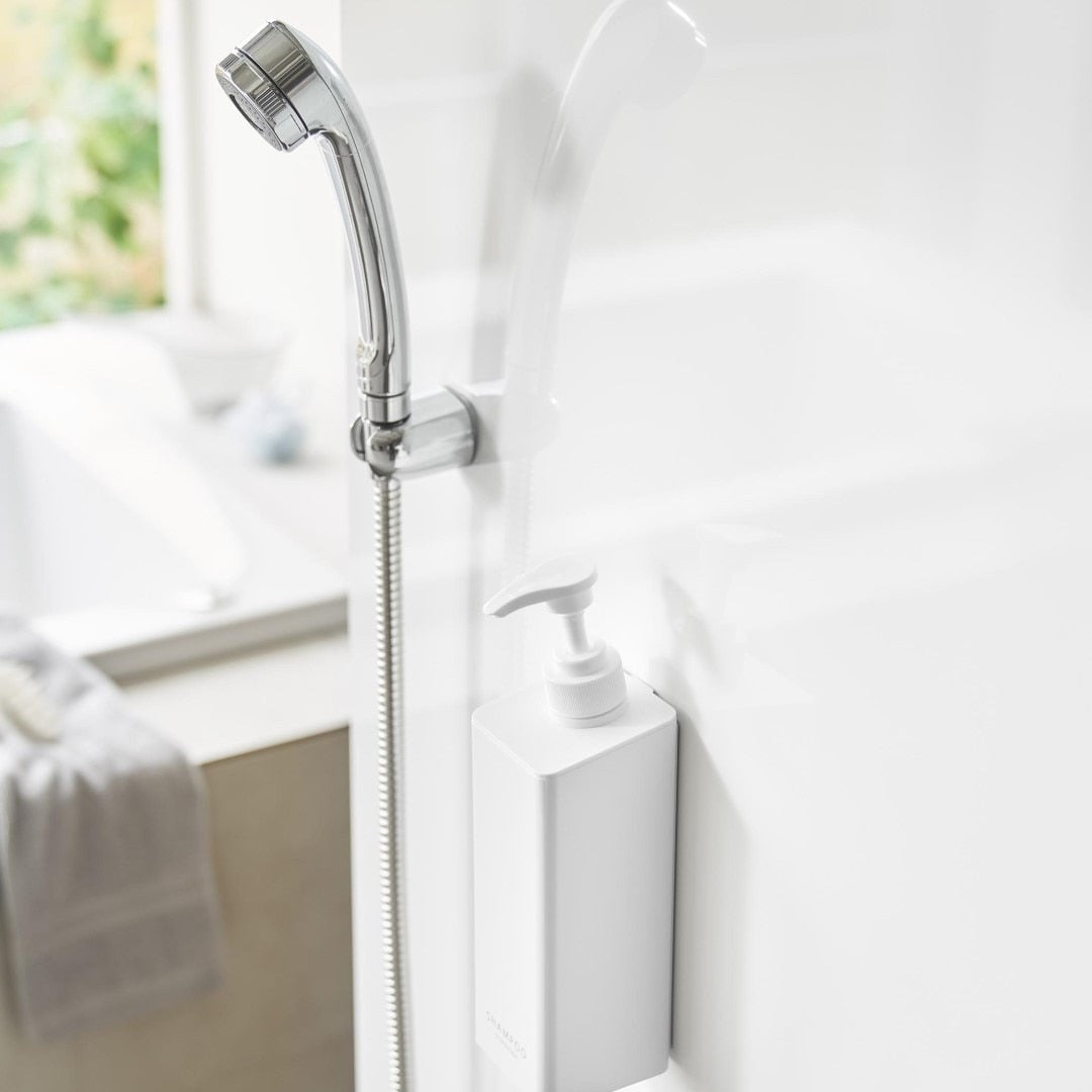 安定性向上。 ワンプッシュでたくさん出せるシャンプーボトル ポンプ位置を奥にすることで当社従来品よりも滑り落ちが改善されたマグネットディスペンサーです。マグネットがつく壁面に簡単取り付け。そのままポンプを押しても滑り落ちづらく、液体を安定して出せます。蓋が大きく外れるのでお手入れや詰め替えが簡単です。バスルームにマッチする、2色のカラーバリエーション カラーは、明るい印象のホワイト、スタイリッシュなブラックをご用意しました。清潔感のあるバスルームに合わせやすいシンプルなモノトーンカラーです。壁面の色やバスチェアなどのアイテムに合わせてお好みのカラーをお選びください。「tower」の従来品よりもたっぷり出せる ワンプッシュで出る量が1.6cc→3.6ccに増量されました。ロングヘアだと一回に使うシャンプーの量も多くなります。これまで必要量を出すのに2~3プッシュしていた方は、一度でたっぷりシャンプーが出せるディスペンサーに切り替えてみるのも◎。詰め替え用パックをそのままIN。 ボトルの上部がパカッと大きく開きます。開口部が広いのでシャンプーの詰め替えがラクちん。詰め替え中に注ぎ口からこぼしてしまう心配がありません。詰め替え用パックの上部を切り開いて、パックごとボトルに入れて使用することもできます。簡単。 マグネットでピタッと密着 マグネット対応の壁面に本体をピタッと密着させれば設置が完了です。底がぬめらず衛生的にご使用いただけます。もちろん貼り直し可能なので、使い続けていくうちに最適な定位置が見つかればその度に移動はOK。 壁面を傷つけずに固定できるので、新築や賃貸のお家でも使いやすい仕様です。別ページでご用意している『コンディショナー』、『ボディソープ』と合わせて使えば統一感も出てバスルームもスッキリ。 ※こちらは『たっぷり洗剤が出るマグネットディスペンサー シャンプー』の商品ページです。