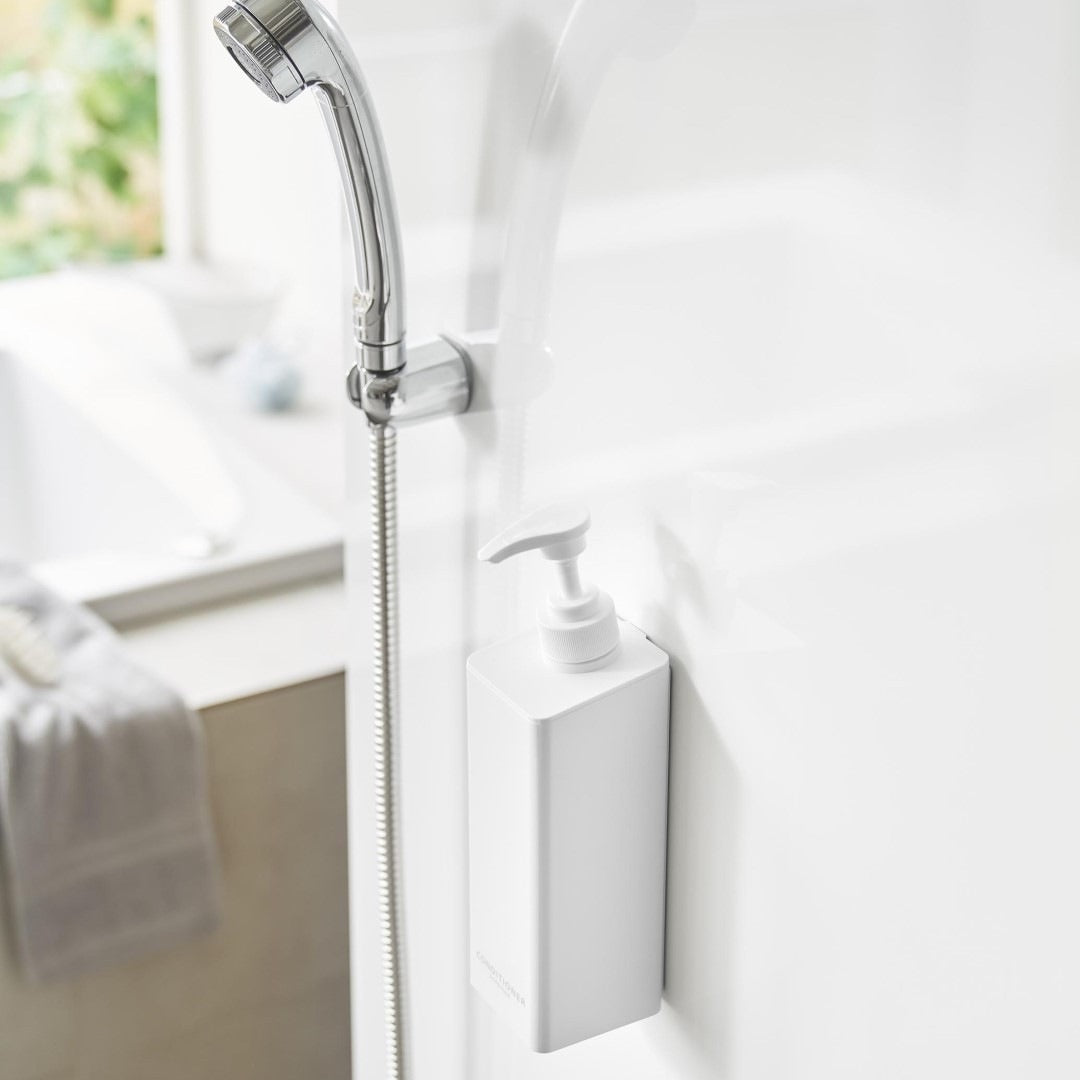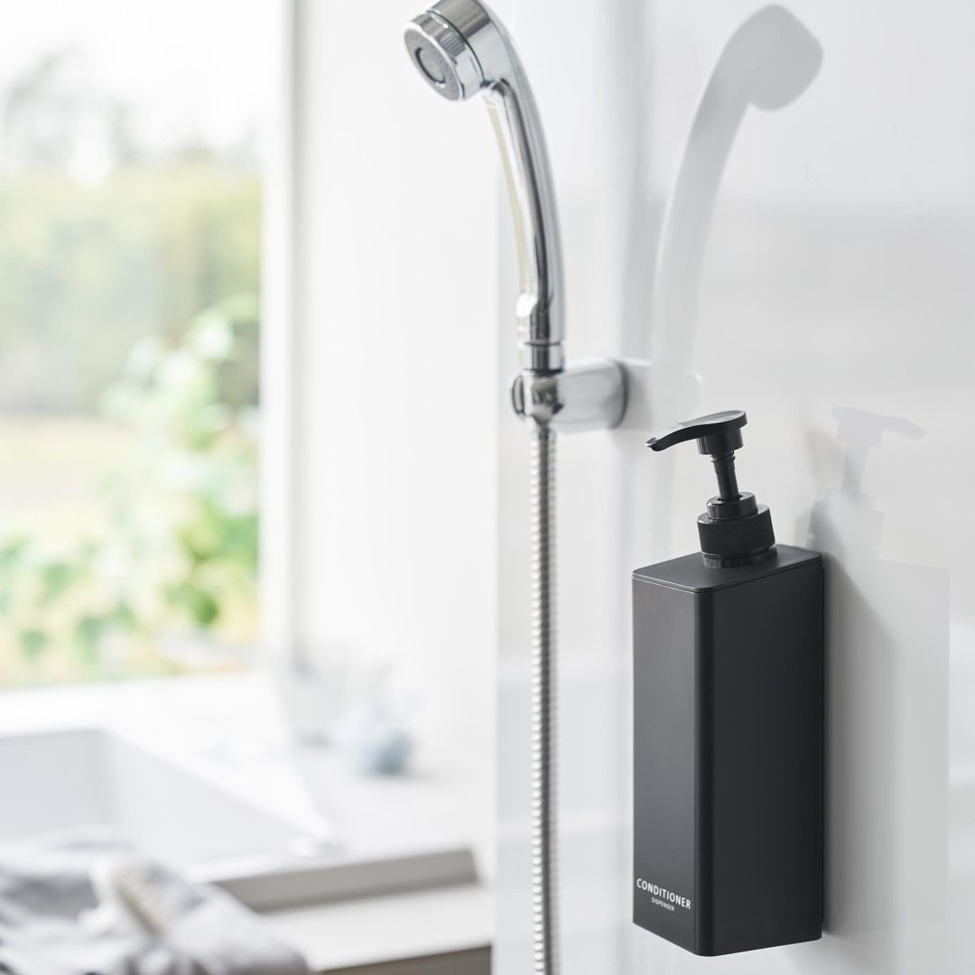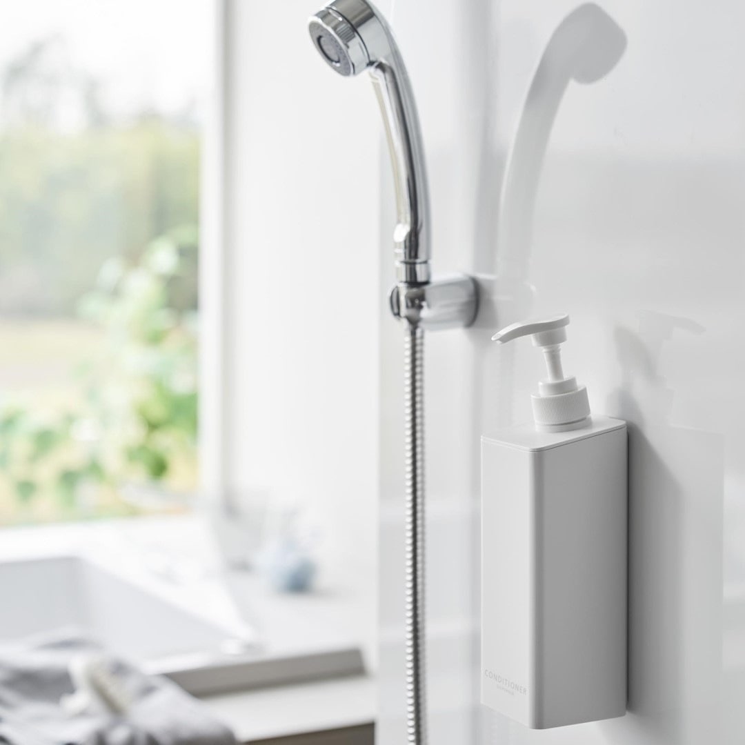安定性向上。 ワンプッシュでたくさん出せるコンディショナーボトル ポンプ位置を奥にすることで当社従来品よりも滑り落ちが改善されたマグネットディスペンサーです。マグネットがつく壁面に簡単取り付け。そのままポンプを押しても滑り落ちづらく、液体を安定して出せます。蓋が大きく外れるのでお手入れや詰め替えが簡単です。バスルームにマッチする、2色のカラーバリエーション カラーは、明るい印象のホワイト、スタイリッシュなブラックをご用意しました。清潔感のあるバスルームに合わせやすいシンプルなモノトーンカラーです。壁面の色やバスチェアなどのアイテムに合わせてお好みのカラーをお選びください。「tower」の従来品よりもたっぷり出せる ワンプッシュで出る量が1.6cc→3.6ccに増量されました。ロングヘアだと一回に使うコンディショナーの量も多くなります。これまで必要量を出すのに2~3プッシュしていた方は、一度でたっぷり出せるディスペンサーに切り替えてみるのも◎。詰め替え用パックをそのままIN。 ボトルの上部がパカッと大きく開きます。開口部が広いのでコンディショナーの詰め替えがラクちん。詰め替え中に注ぎ口からこぼしてしまう心配がありません。詰め替え用パックの上部を切り開いて、パックごとボトルに入れて使用することもできます。簡単。 マグネットでピタッと密着 マグネット対応の壁面に本体をピタッと密着させれば設置が完了です。底がぬめらず衛生的にご使用いただけます。もちろん貼り直し可能なので、使い続けていくうちに最適な定位置が見つかればその度に移動はOK。 壁面を傷つけずに固定できるので、新築や賃貸のお家でも使いやすい仕様です。別ページでご用意している『シャンプー』、『ボディソープ』と合わせて使えば統一感も出てバスルームもスッキリ。 ※こちらは『たっぷり洗剤が出るマグネットディスペンサー コンディショナー』の商品ページです。