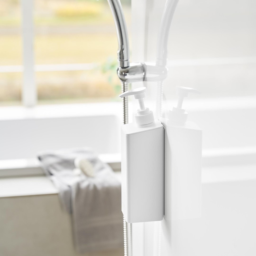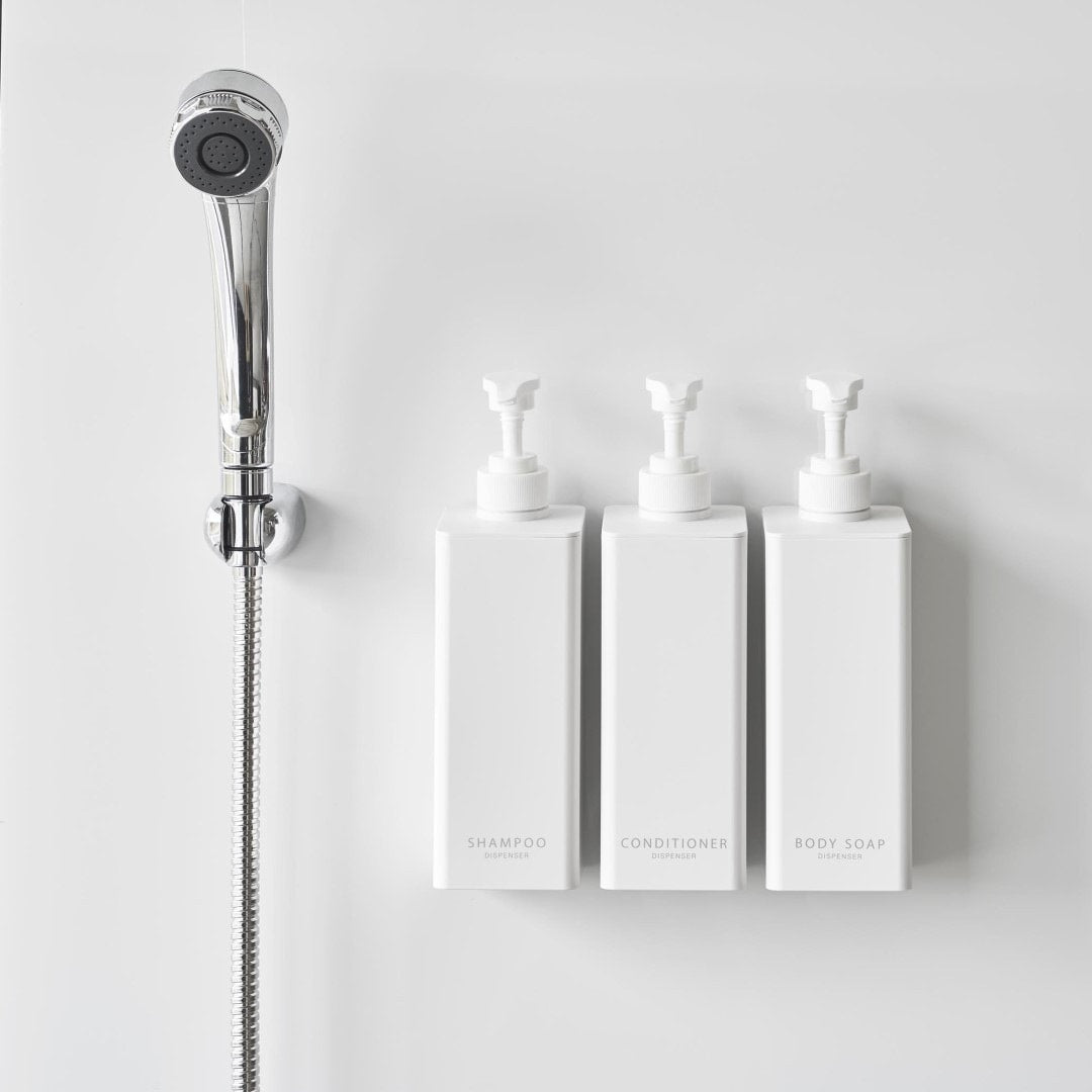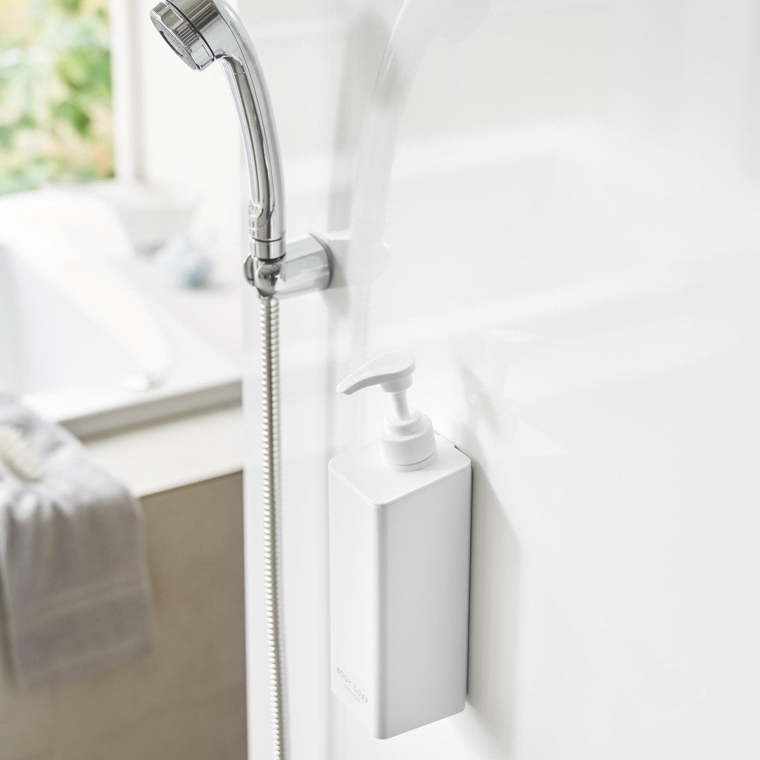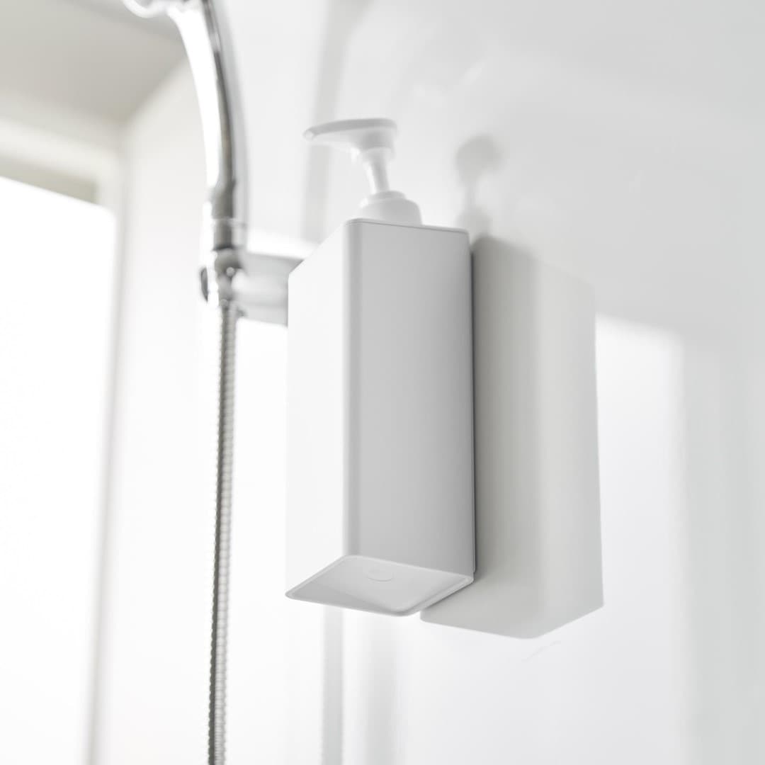 安定性向上。 ワンプッシュでたくさん出せるボディソープボトル ポンプ位置を奥にすることで当社従来品よりも滑り落ちが改善されたマグネットディスペンサーです。マグネットがつく壁面に簡単取り付け。そのままポンプを押しても滑り落ちづらく、液体を安定して出せます。蓋が大きく外れるのでお手入れや詰め替えが簡単です。バスルームにマッチする、2色のカラーバリエーション カラーは、明るい印象のホワイト、スタイリッシュなブラックをご用意しました。清潔感のあるバスルームに合わせやすいシンプルなモノトーンカラーです。壁面の色やバスチェアなどのアイテムに合わせてお好みのカラーをお選びください。「tower」の従来品よりもたっぷり出せる ワンプッシュで出る量が1.6cc→3.6ccに増量されました。これまで必要量を出すのに2~3プッシュしていた方は、一度でたっぷりボディソープが出せるディスペンサーに切り替えてみるのも◎。詰め替え用パックをそのままIN。 ボトルの上部がパカッと大きく開きます。開口部が広いのでボディソープの詰め替えがラクちん。詰め替え中に注ぎ口からこぼしてしまう心配がありません。詰め替え用パックの上部を切り開いて、パックごとボトルに入れて使用することもできます。簡単。 マグネットでピタッと密着 マグネット対応の壁面に本体をピタッと密着させれば設置が完了です。底がぬめらず衛生的にご使用いただけます。もちろん貼り直し可能なので、使い続けていくうちに最適な定位置が見つかればその度に移動はOK。 壁面を傷つけずに固定できるので、新築や賃貸のお家でも使いやすい仕様です。別ページでご用意している『シャンプー』、『コンディショナー』と合わせて使えば統一感も出てバスルームもスッキリ。 ※こちらは『たっぷり洗剤が出るマグネットディスペンサー ボディソープ』の商品ページです。