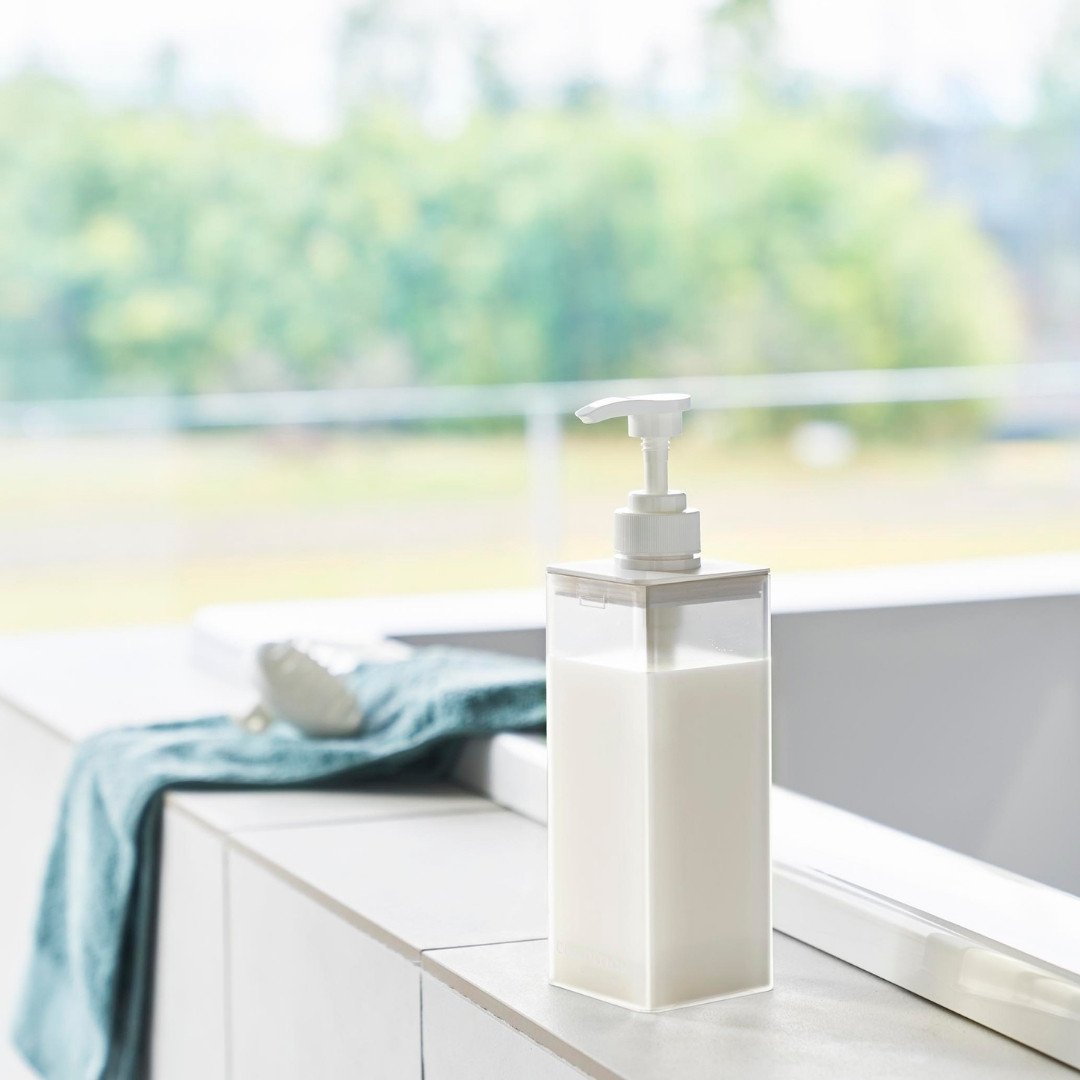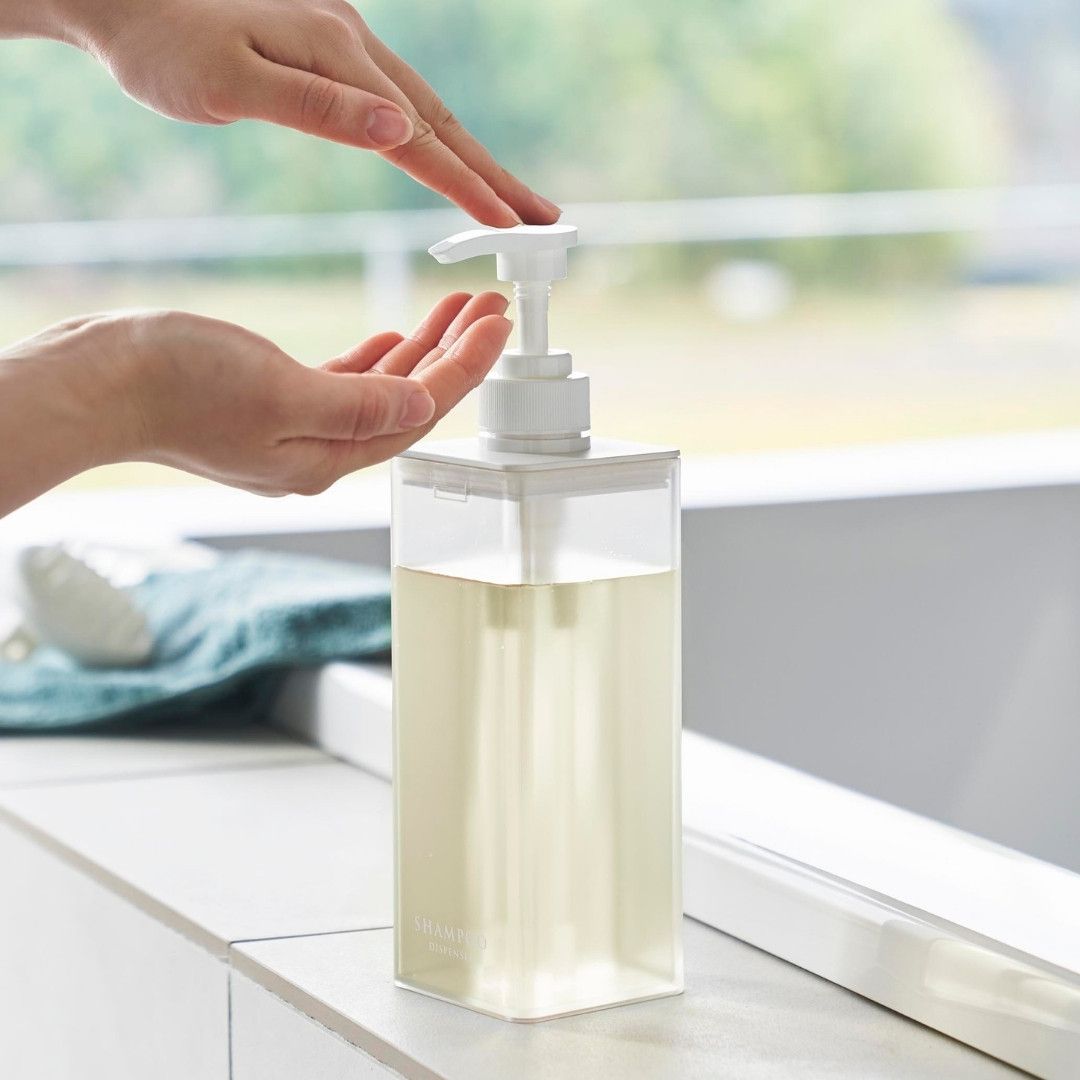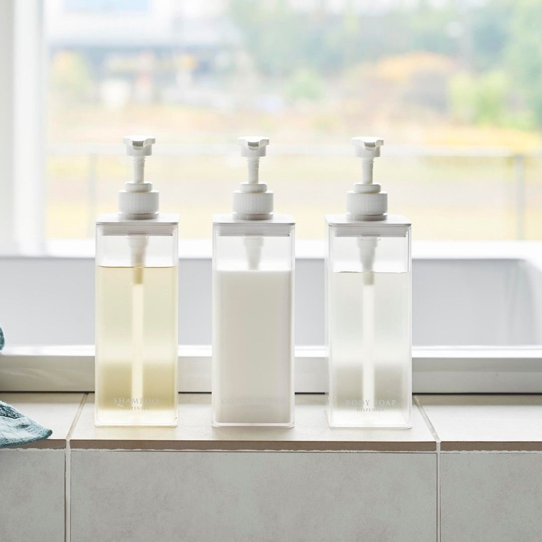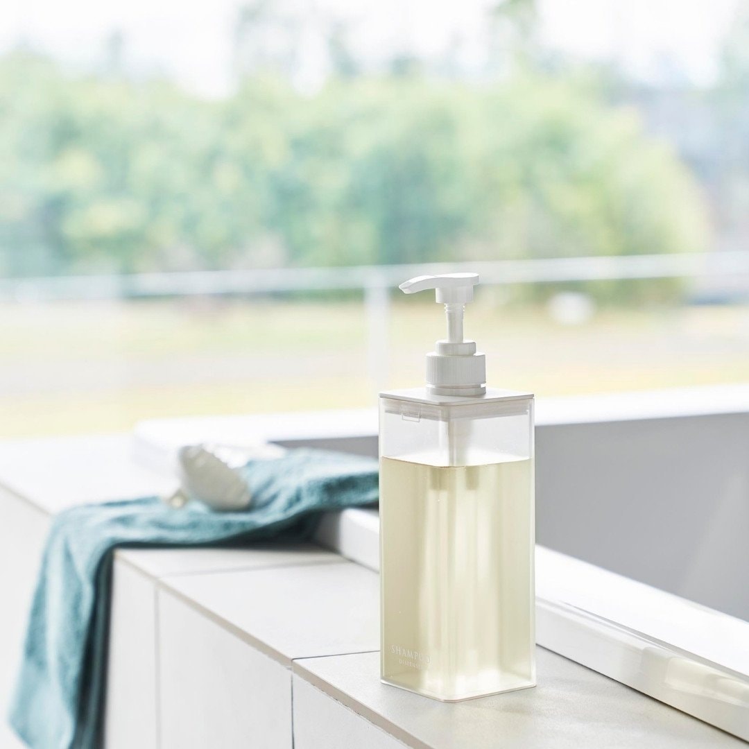 安定性向上。 ワンプッシュでたくさん出せる詰替えボトル ポンプ位置を奥にすることで当社従来品よりも滑り落ちが改善されたディスペンサーです。そのままポンプを押しても滑りづらく、液体を安定して出せます。蓋が大きく外れるのでお手入れや詰め替えが簡単です。シリーズで揃えて スッキリ統一感 ご用意しているのは『シャンプー』『コンディショナー』『ボディソープ』の3種類。合わせて使えば統一感も出てバスルームもスッキリ。 シンプルな見た目のスクエア型で、さりげない印字がポイント。どんなバスルームにも溶け込むデザインです。「tower」の従来品よりもたっぷり出せる ワンプッシュで出る量が1.6cc→3.6ccに増量されました。これまで必要量を出すのに2~3プッシュしていた方は、一度でたっぷり出せるディスペンサーに切り替えてみるのも◎。詰め替え用パックをそのままIN。 ボトルの上部がパカッと大きく開くので詰め替えがラクちん。詰め替え中に注ぎ口からこぼしてしまう心配がありません。詰め替え用パックの上部を切り開いて、パックごとボトルに入れて使用することもできます。中身が見やすい 半透明のボトル 中身が見えて残量がすぐにわかりやすいのもうれしいポイント。急に中身を切らしてあわてることなく、事前に買い置きができますね。※壁面にマグネットでつけられるマグネットタイプも別ページにてご用意しております。