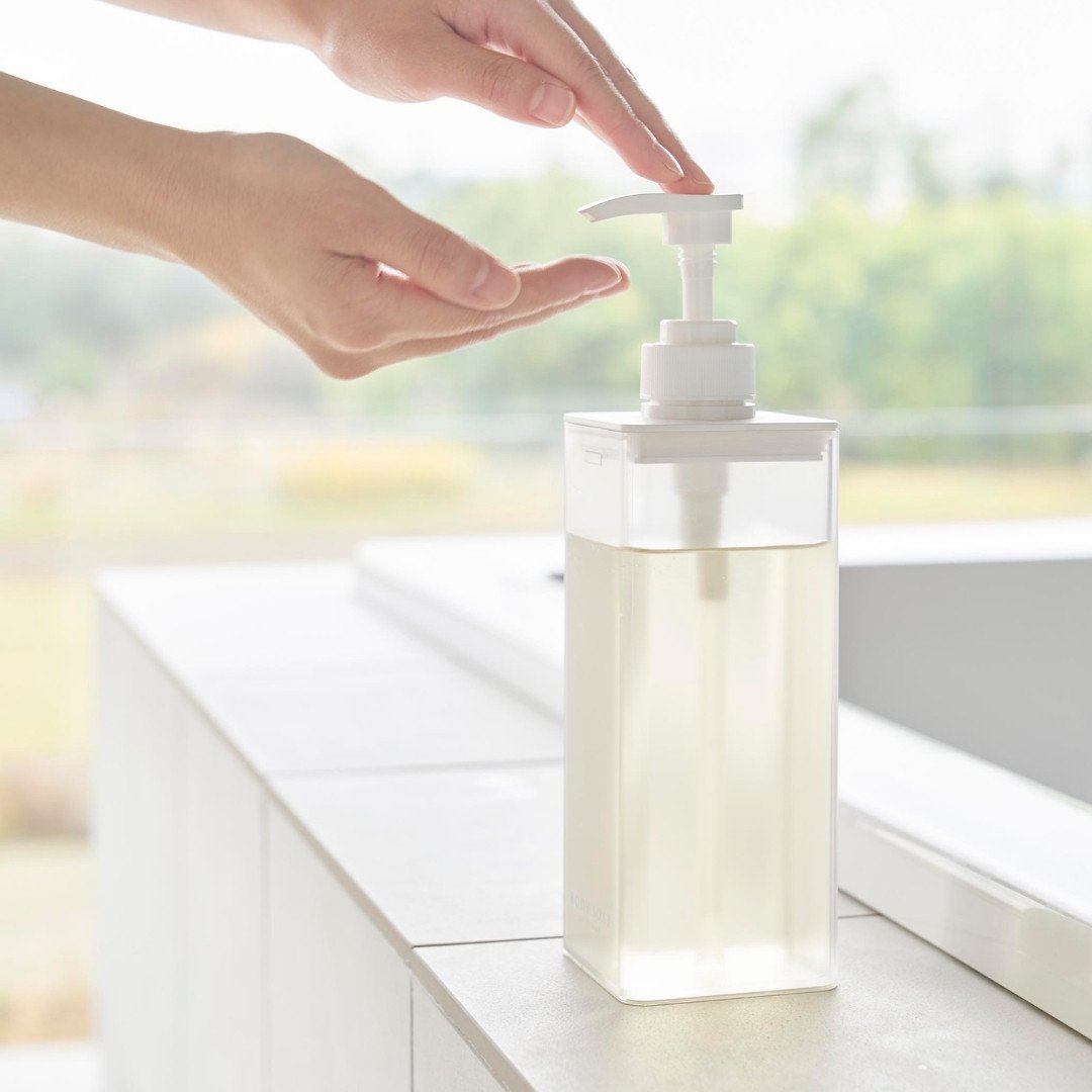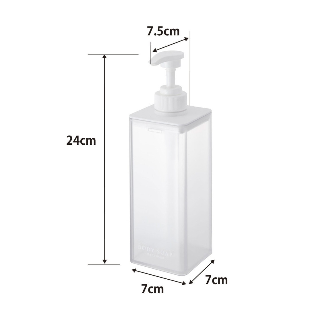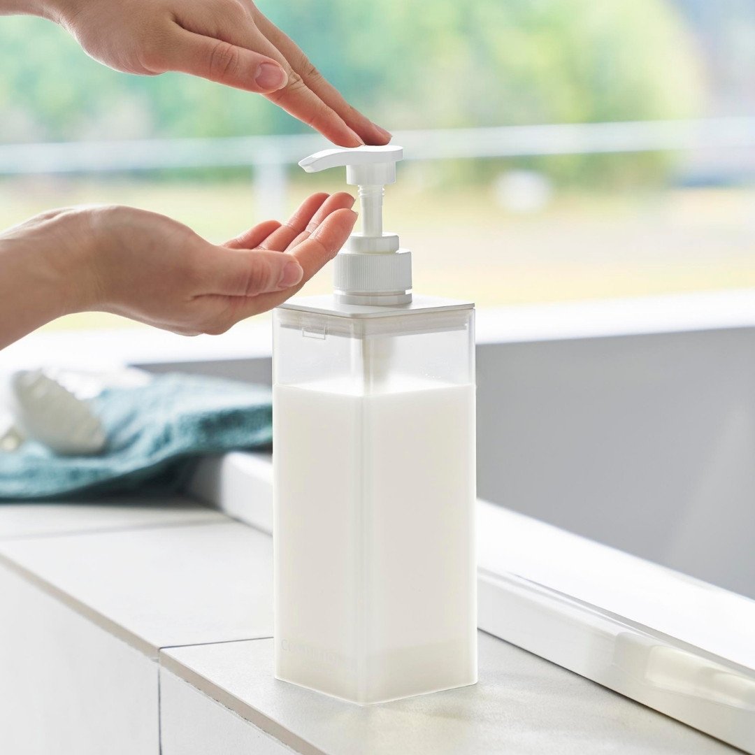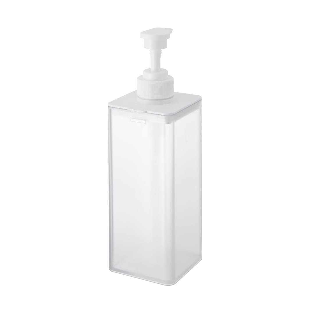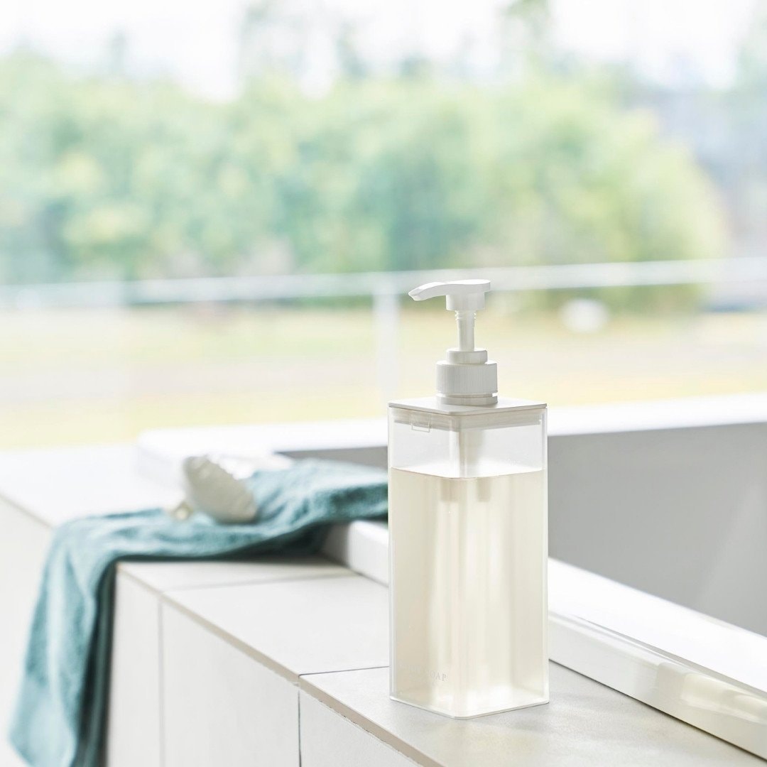 安定性向上。 ワンプッシュでたくさん出せる詰替えボトル ポンプ位置を奥にすることで当社従来品よりも滑り落ちが改善されたディスペンサーです。そのままポンプを押しても滑りづらく、液体を安定して出せます。蓋が大きく外れるのでお手入れや詰め替えが簡単です。シリーズで揃えて スッキリ統一感 ご用意しているのは『シャンプー』『コンディショナー』『ボディソープ』の3種類。合わせて使えば統一感も出てバスルームもスッキリ。 シンプルな見た目のスクエア型で、さりげない印字がポイント。どんなバスルームにも溶け込むデザインです。「tower」の従来品よりもたっぷり出せる ワンプッシュで出る量が1.6cc→3.6ccに増量されました。これまで必要量を出すのに2~3プッシュしていた方は、一度でたっぷり出せるディスペンサーに切り替えてみるのも◎。詰め替え用パックをそのままIN。 ボトルの上部がパカッと大きく開くので詰め替えがラクちん。詰め替え中に注ぎ口からこぼしてしまう心配がありません。詰め替え用パックの上部を切り開いて、パックごとボトルに入れて使用することもできます。中身が見やすい 半透明のボトル 中身が見えて残量がすぐにわかりやすいのもうれしいポイント。急に中身を切らしてあわてることなく、事前に買い置きができますね。※壁面にマグネットでつけられるマグネットタイプも別ページにてご用意しております。