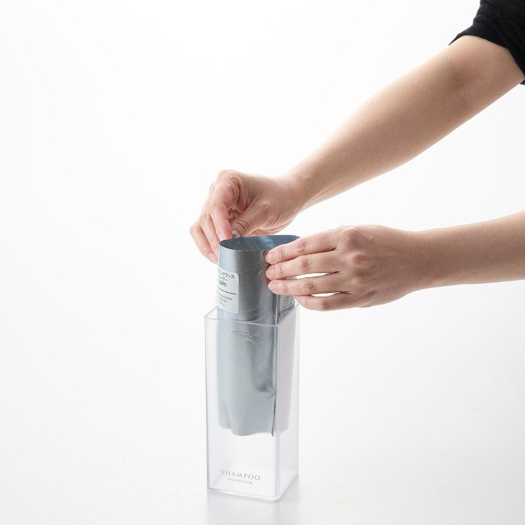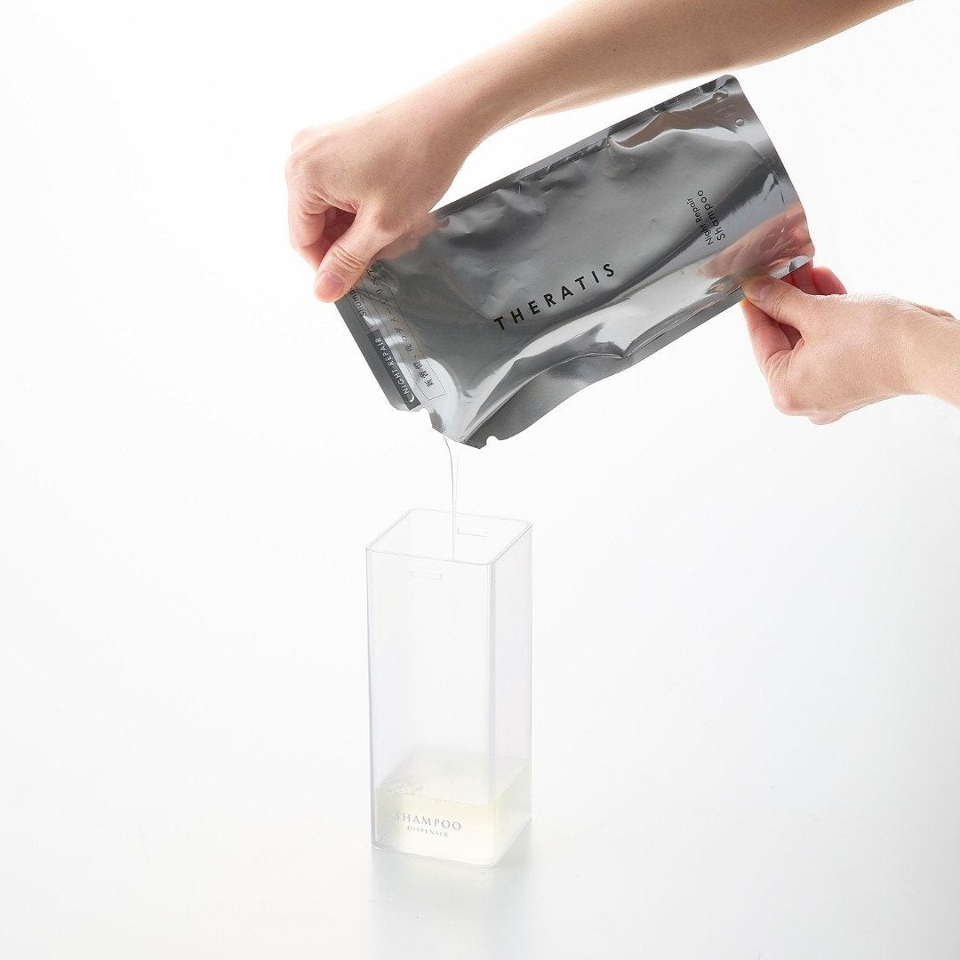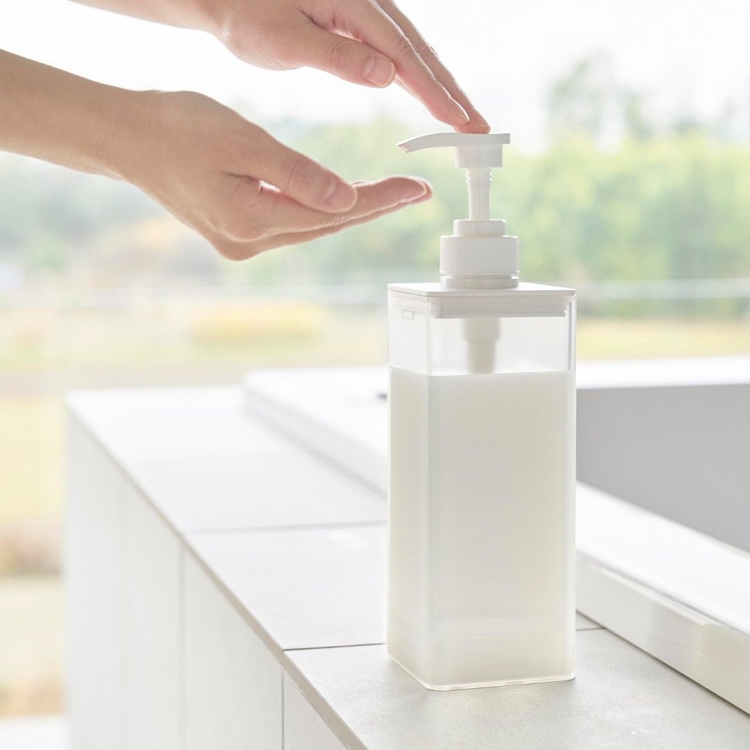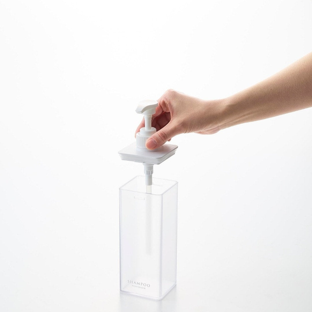 安定性向上。 ワンプッシュでたくさん出せる詰替えボトル ポンプ位置を奥にすることで当社従来品よりも滑り落ちが改善されたディスペンサーです。そのままポンプを押しても滑りづらく、液体を安定して出せます。蓋が大きく外れるのでお手入れや詰め替えが簡単です。シリーズで揃えて スッキリ統一感 ご用意しているのは『シャンプー』『コンディショナー』『ボディソープ』の3種類。合わせて使えば統一感も出てバスルームもスッキリ。 シンプルな見た目のスクエア型で、さりげない印字がポイント。どんなバスルームにも溶け込むデザインです。「tower」の従来品よりもたっぷり出せる ワンプッシュで出る量が1.6cc→3.6ccに増量されました。これまで必要量を出すのに2~3プッシュしていた方は、一度でたっぷり出せるディスペンサーに切り替えてみるのも◎。詰め替え用パックをそのままIN。 ボトルの上部がパカッと大きく開くので詰め替えがラクちん。詰め替え中に注ぎ口からこぼしてしまう心配がありません。詰め替え用パックの上部を切り開いて、パックごとボトルに入れて使用することもできます。中身が見やすい 半透明のボトル 中身が見えて残量がすぐにわかりやすいのもうれしいポイント。急に中身を切らしてあわてることなく、事前に買い置きができますね。※壁面にマグネットでつけられるマグネットタイプも別ページにてご用意しております。