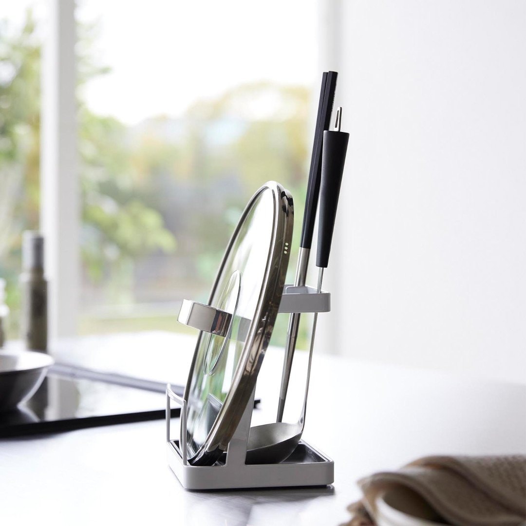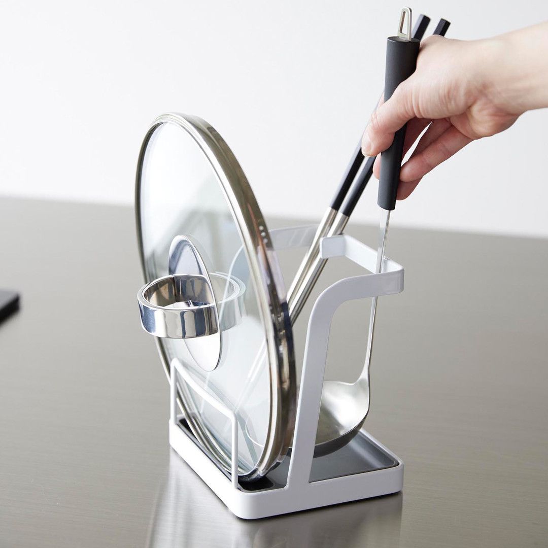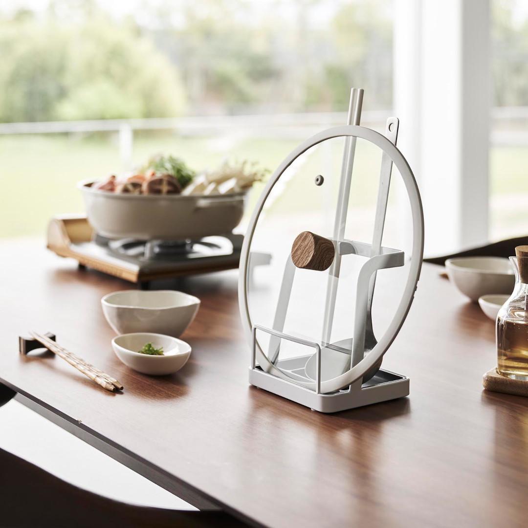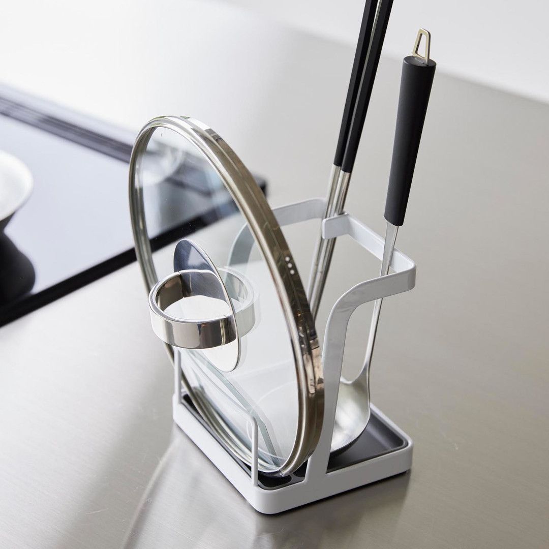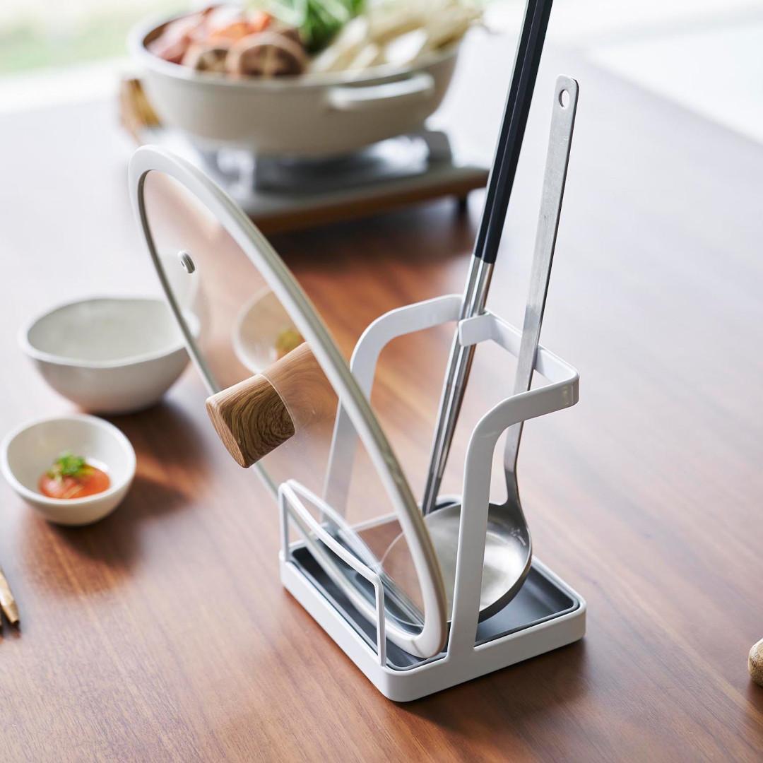 ちょい置きできる調理ツールスタンド鍋ふた・お玉・菜箸を一括で独立して置けるスタンドです。トレー部分は取り外して食器洗浄機でのお手入れが可能です。食事後に調理ツールや食器などと一緒に食洗機に入れるだけなのでお手入れらくちん。キッチンに似合う、2色のカラーバリエーションカラーは、明るい印象のホワイト、スタイリッシュなブラックをご用意しました。キッチンになじみやすいシンプルなモノトーンカラーです。キッチンインテリアやお持ちの調理ツールなどに合わせてお好みのカラーをお選びください。鍋ふたの置き場に困らない。 場所を取らない。鍋ふたはキッチンパネルに立て掛けるようにして置いておいても良いですが、ふたから垂れた水滴や油分でコンロ回りが汚れてしまったり、キッチンパネルが傷つく不安も。お玉&鍋ふたスタンドを使えばコンロ回りを汚さずにすっきりと片付きます。鍋ふたを掛けたまま、お玉・菜箸の出し入れが可能底面のトレーは、お玉・鍋ふた・菜箸のそれぞれで仕切られお互いに干渉しないので安定して立ててられます。フレームの菜箸置きとお玉置きの間には小さな突起が付いていて、菜箸が倒れてもお玉に影響しないよう配慮されたつくりです。家族でお鍋を囲むときにも食卓でお鍋をする際、鍋ふたやお玉の置き場所が無く困った経験は一度や二度じゃないはず。鍋ふた・お玉・菜箸をまとめて置けるスタンドがあれば、スペースの限られた食卓の上でも省スペースに安定して置いておくことができます。