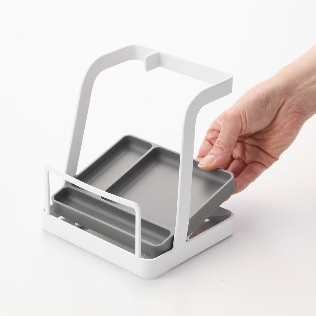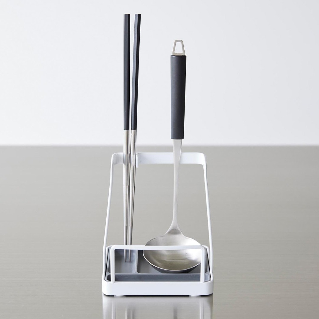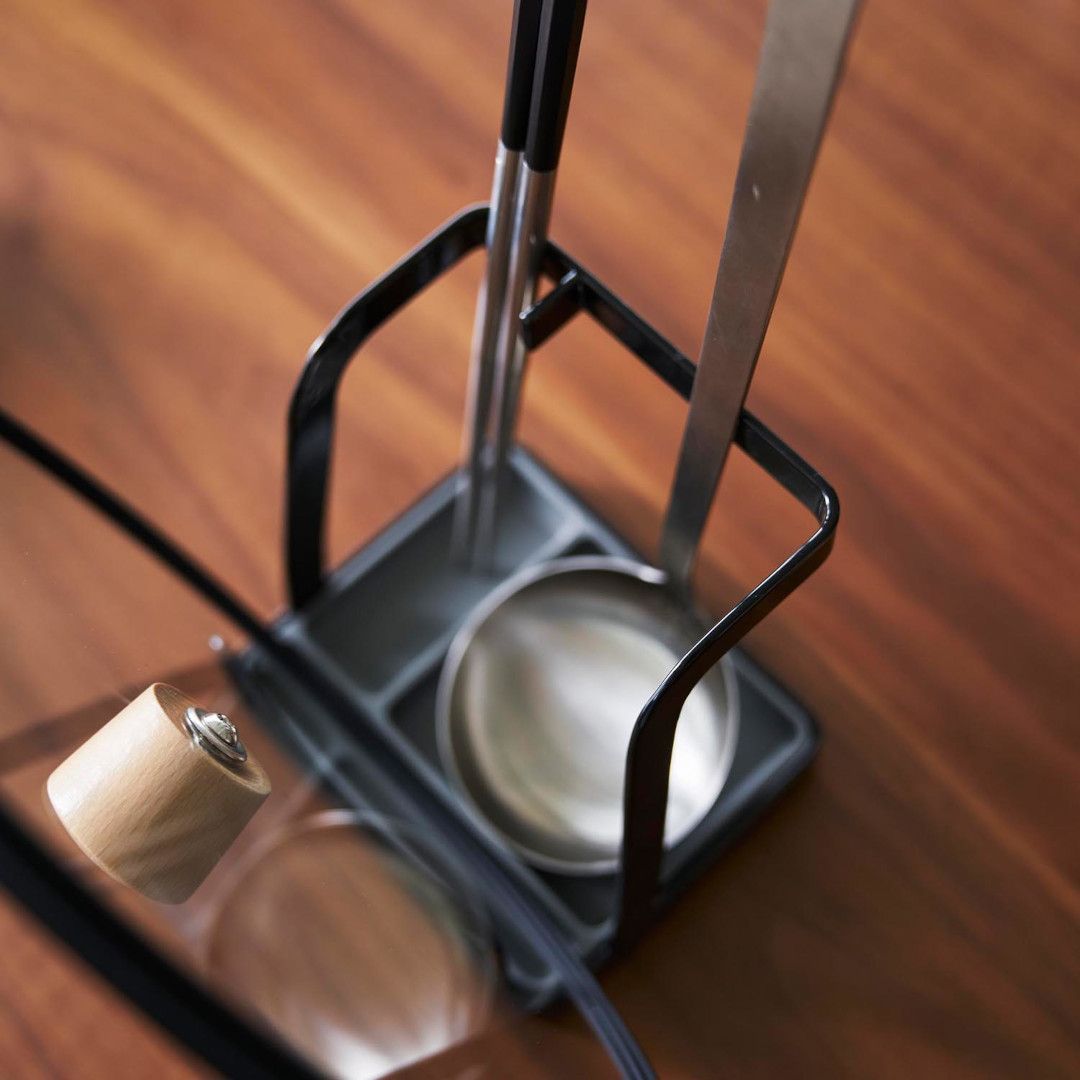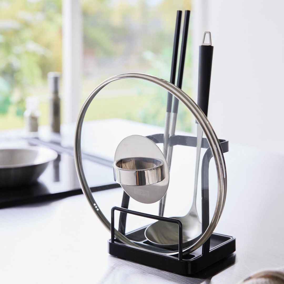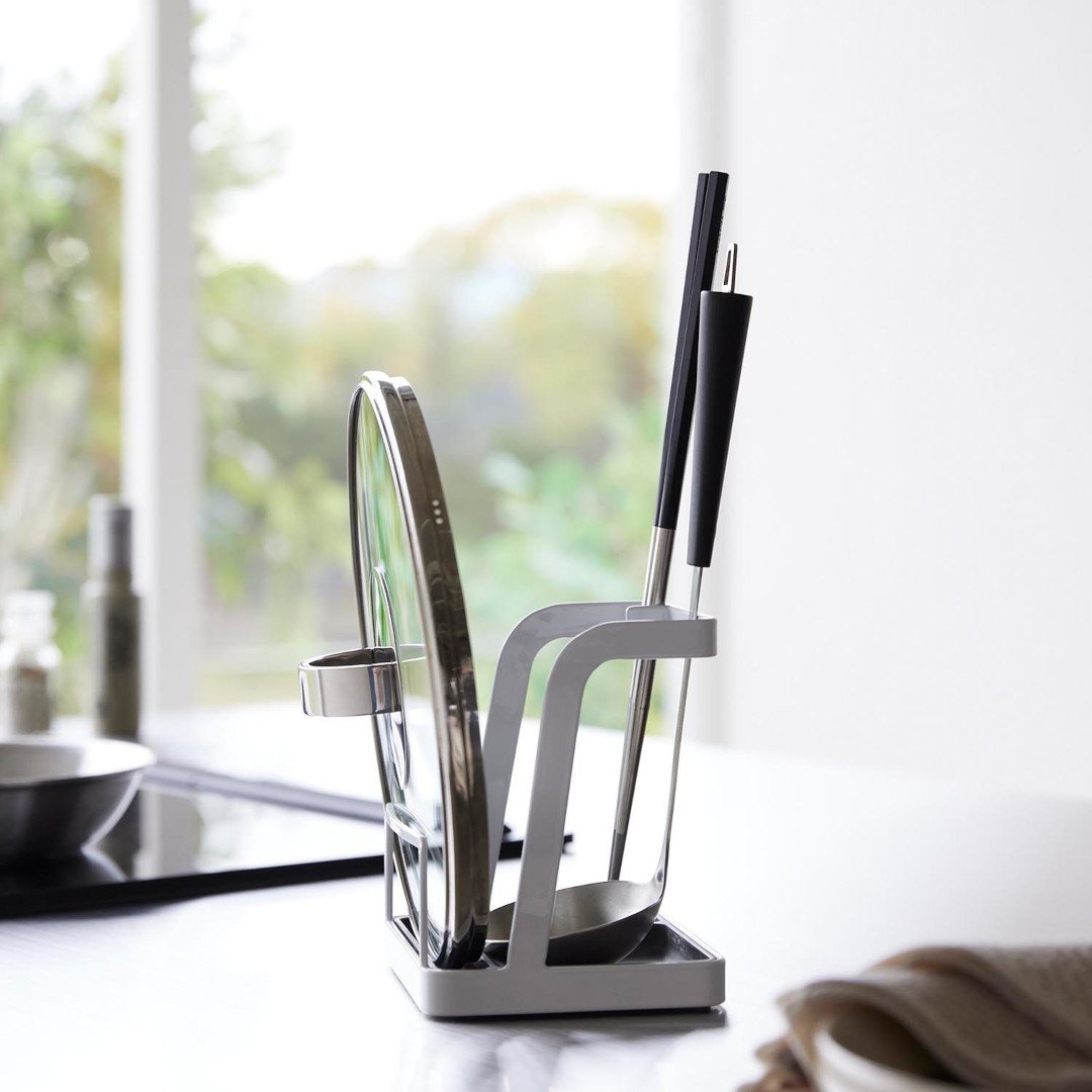 ちょい置きできる調理ツールスタンド鍋ふた・お玉・菜箸を一括で独立して置けるスタンドです。トレー部分は取り外して食器洗浄機でのお手入れが可能です。食事後に調理ツールや食器などと一緒に食洗機に入れるだけなのでお手入れらくちん。キッチンに似合う、2色のカラーバリエーションカラーは、明るい印象のホワイト、スタイリッシュなブラックをご用意しました。キッチンになじみやすいシンプルなモノトーンカラーです。キッチンインテリアやお持ちの調理ツールなどに合わせてお好みのカラーをお選びください。鍋ふたの置き場に困らない。 場所を取らない。鍋ふたはキッチンパネルに立て掛けるようにして置いておいても良いですが、ふたから垂れた水滴や油分でコンロ回りが汚れてしまったり、キッチンパネルが傷つく不安も。お玉&鍋ふたスタンドを使えばコンロ回りを汚さずにすっきりと片付きます。鍋ふたを掛けたまま、お玉・菜箸の出し入れが可能底面のトレーは、お玉・鍋ふた・菜箸のそれぞれで仕切られお互いに干渉しないので安定して立ててられます。フレームの菜箸置きとお玉置きの間には小さな突起が付いていて、菜箸が倒れてもお玉に影響しないよう配慮されたつくりです。家族でお鍋を囲むときにも食卓でお鍋をする際、鍋ふたやお玉の置き場所が無く困った経験は一度や二度じゃないはず。鍋ふた・お玉・菜箸をまとめて置けるスタンドがあれば、スペースの限られた食卓の上でも省スペースに安定して置いておくことができます。