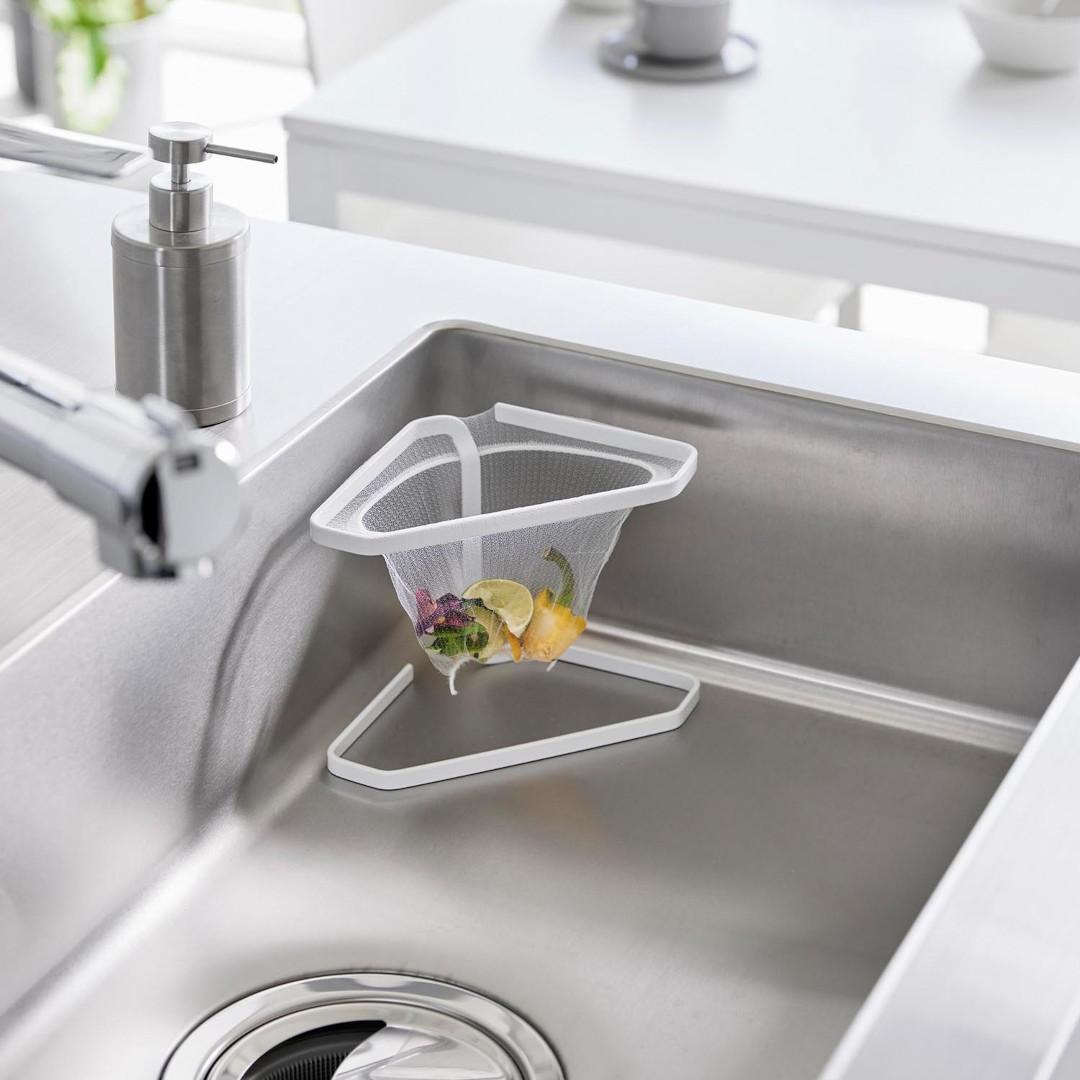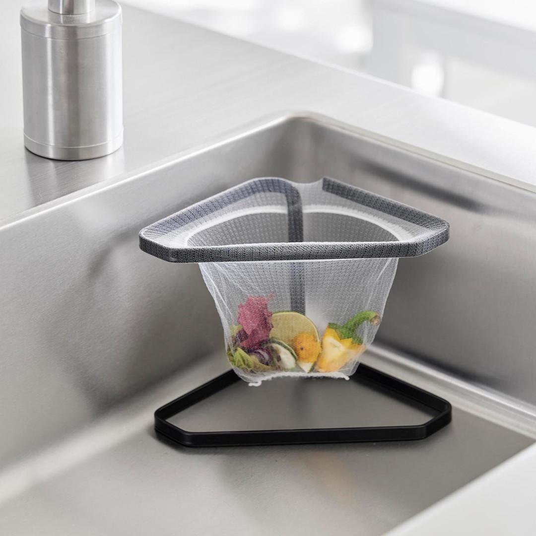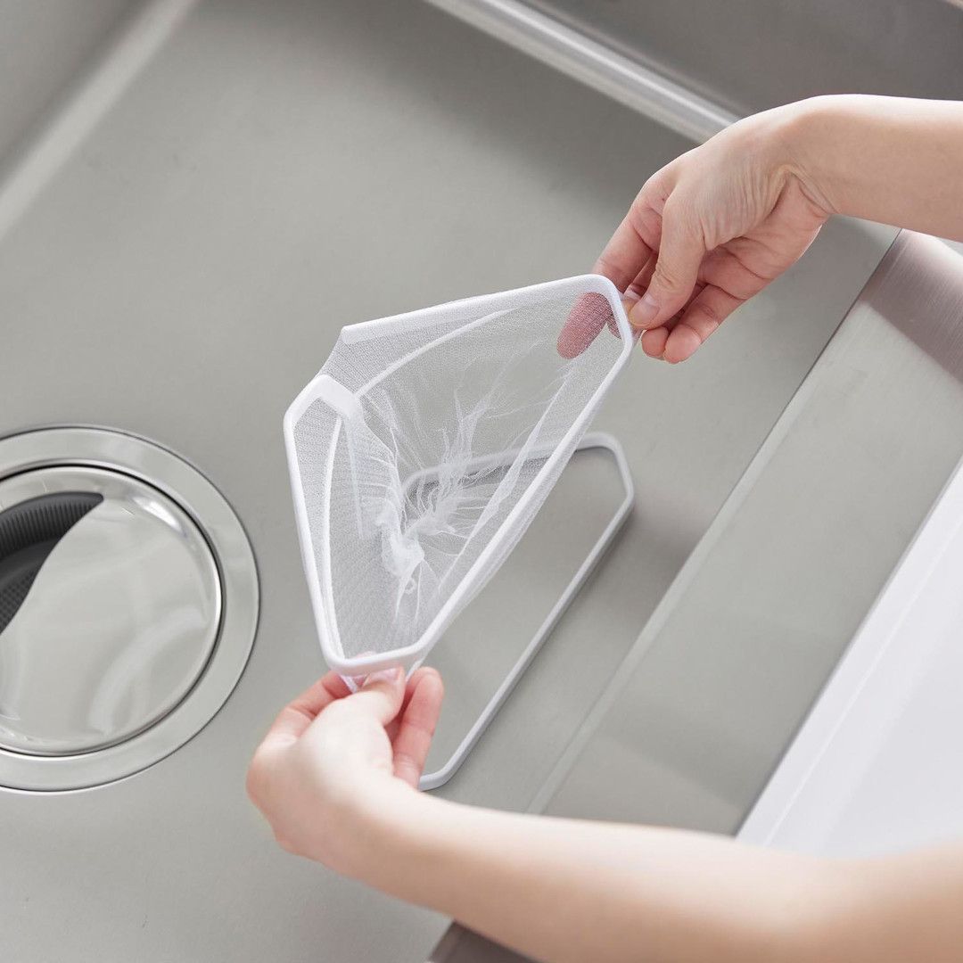 ヌメリ汚れ軽減。 清潔に使える三角コーナー水切りネットが付けられる三角コーナーです。サビにくいステンレス製なうえ、シンプルな構造なのでお手入れが簡単。投入口が大きいため野菜の皮、カットした野菜や果物をこぼさず入れやすいのもうれしいポイントです。キッチンに似合う、2色のカラーバリエーションカラーは、清潔感のあるホワイト、スタイリッシュなブラックをご用意しました。キッチンになじみやすいシンプルなモノトーンカラーです。キッチンインテリアやお持ちの調理ツールなどに合わせてお好みのカラーをお選びください。取り付け3秒。 引っ掛けるだけのお手軽さ枠に水切りネットを引っ掛けるだけで簡単に取り付けられます。シンクの中でもワークトップの上でも作業のしやすい場所など、どこにでも設置してご使用可能です。野菜の皮を捨てたり、飲み残しのお茶を流したりするときにも。ポリ袋&フリーザーバッグで時短調理水切りネットの代わりに食品用ポリ袋やフリーザーバッグをかぶせてもお使いいただけます。使いやすい大きさにカットした野菜をポリ袋に入れて保存しておけば食事がすぐに作れて便利。仕事から帰ってきても下ごしらえがしてあるからパパッと夕飯が作れちゃいます。水切りのタイムロスをカットストッキング製水切りネットの底が設置面に触れにくい絶妙な高さ設計です。ネットが浮いている状態を常にキープできるので、ゴミ捨てのときにはすでにしっかりと水切りができている状態に。わざわざ水がきれるのを待つ必要がありません。