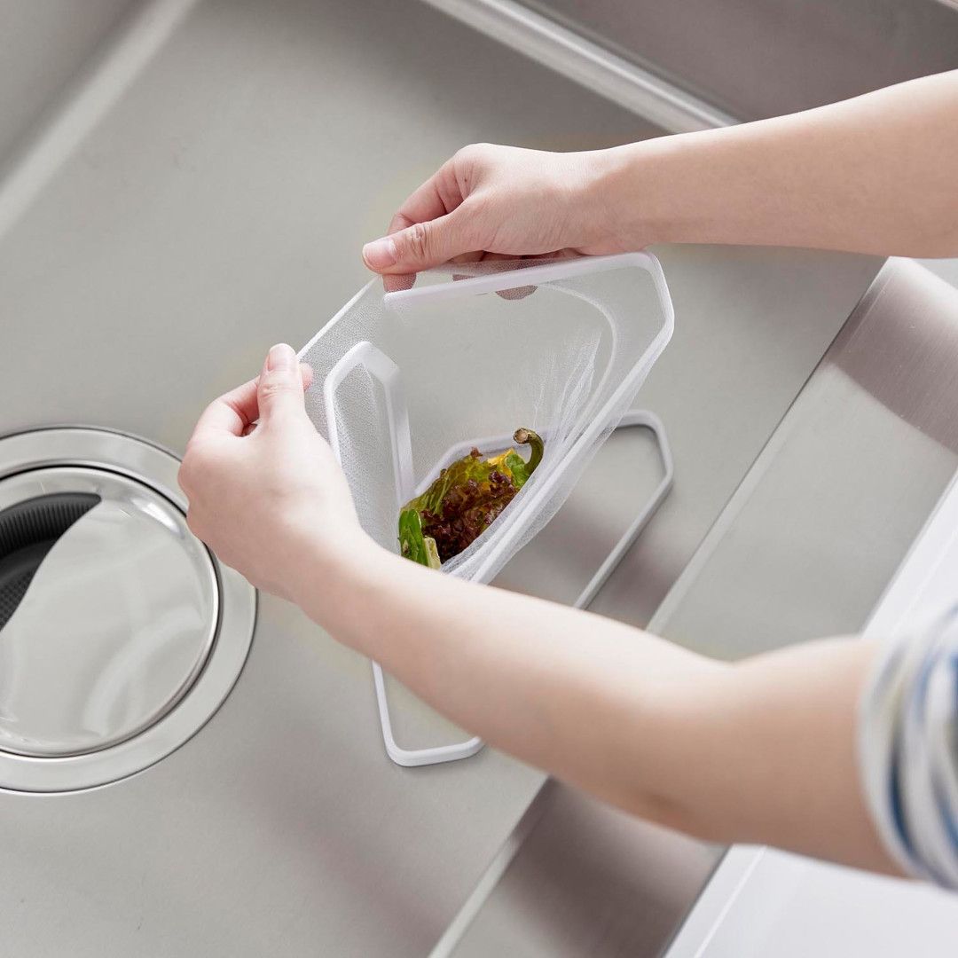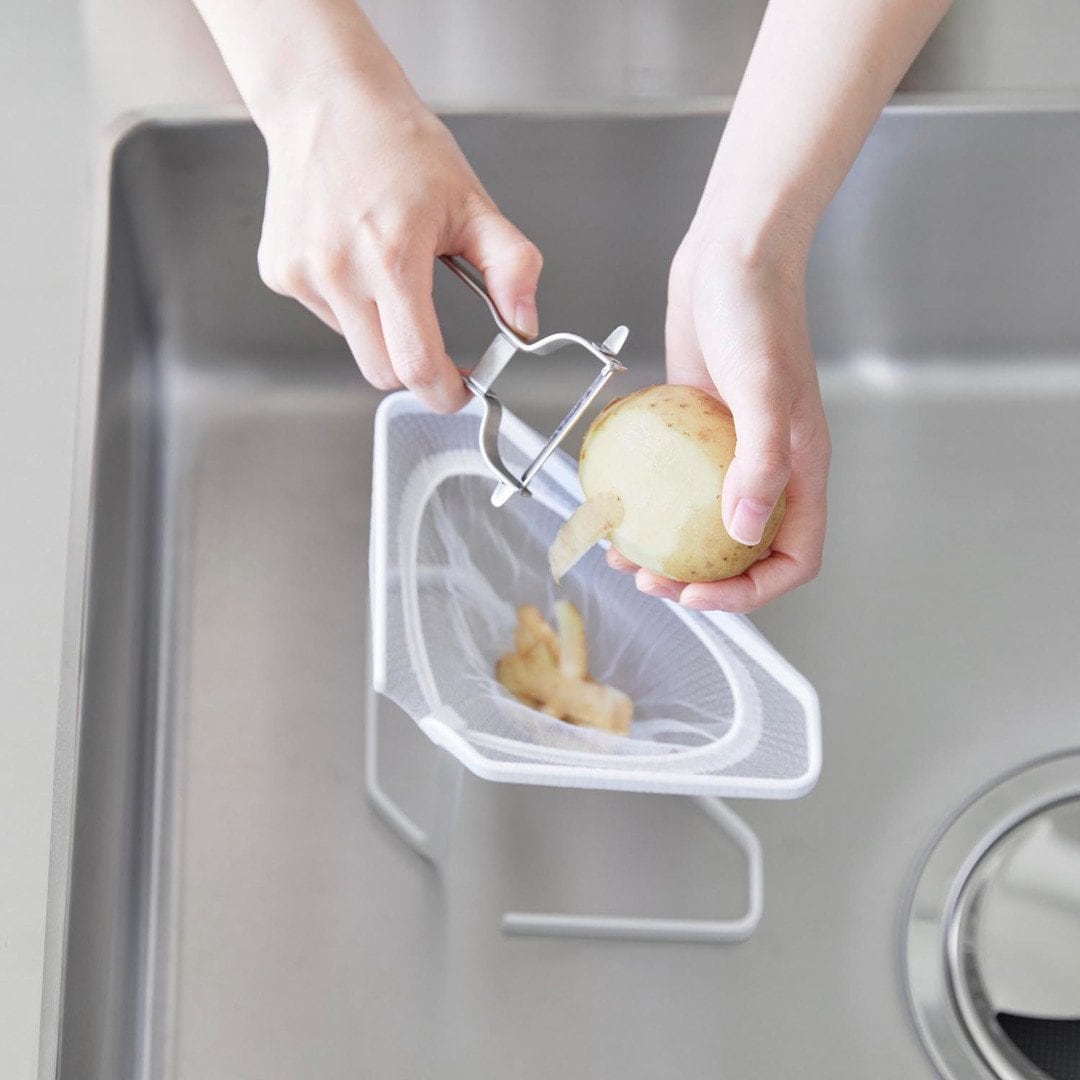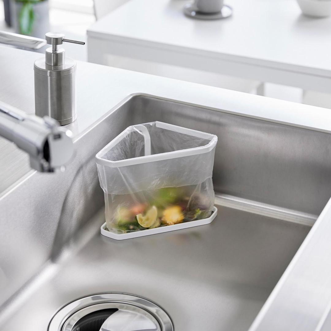 ヌメリ汚れ軽減。 清潔に使える三角コーナー水切りネットが付けられる三角コーナーです。サビにくいステンレス製なうえ、シンプルな構造なのでお手入れが簡単。投入口が大きいため野菜の皮、カットした野菜や果物をこぼさず入れやすいのもうれしいポイントです。キッチンに似合う、2色のカラーバリエーションカラーは、清潔感のあるホワイト、スタイリッシュなブラックをご用意しました。キッチンになじみやすいシンプルなモノトーンカラーです。キッチンインテリアやお持ちの調理ツールなどに合わせてお好みのカラーをお選びください。取り付け3秒。 引っ掛けるだけのお手軽さ枠に水切りネットを引っ掛けるだけで簡単に取り付けられます。シンクの中でもワークトップの上でも作業のしやすい場所など、どこにでも設置してご使用可能です。野菜の皮を捨てたり、飲み残しのお茶を流したりするときにも。ポリ袋&フリーザーバッグで時短調理水切りネットの代わりに食品用ポリ袋やフリーザーバッグをかぶせてもお使いいただけます。使いやすい大きさにカットした野菜をポリ袋に入れて保存しておけば食事がすぐに作れて便利。仕事から帰ってきても下ごしらえがしてあるからパパッと夕飯が作れちゃいます。水切りのタイムロスをカットストッキング製水切りネットの底が設置面に触れにくい絶妙な高さ設計です。ネットが浮いている状態を常にキープできるので、ゴミ捨てのときにはすでにしっかりと水切りができている状態に。わざわざ水がきれるのを待つ必要がありません。