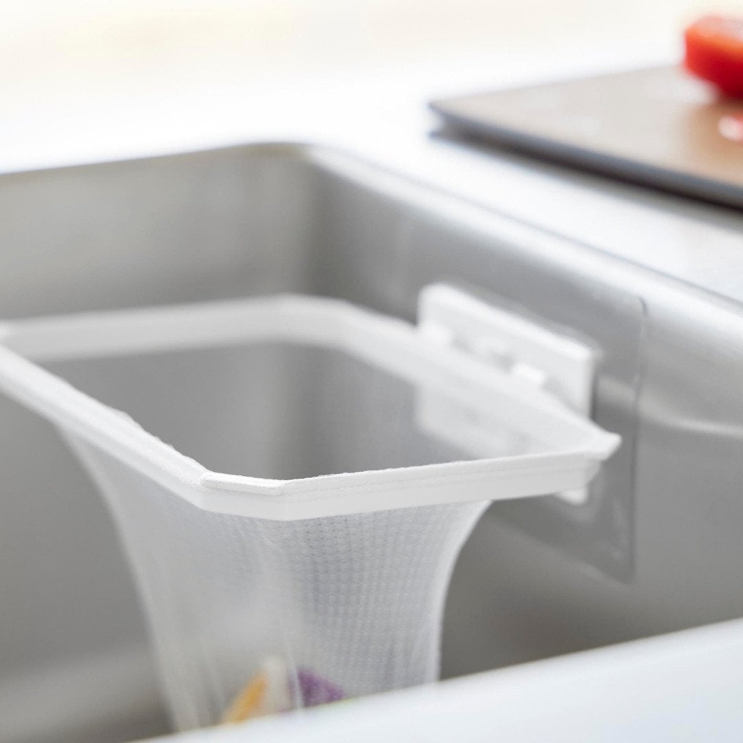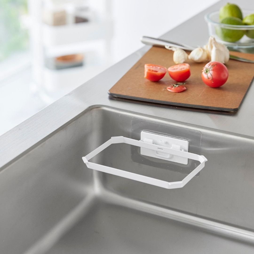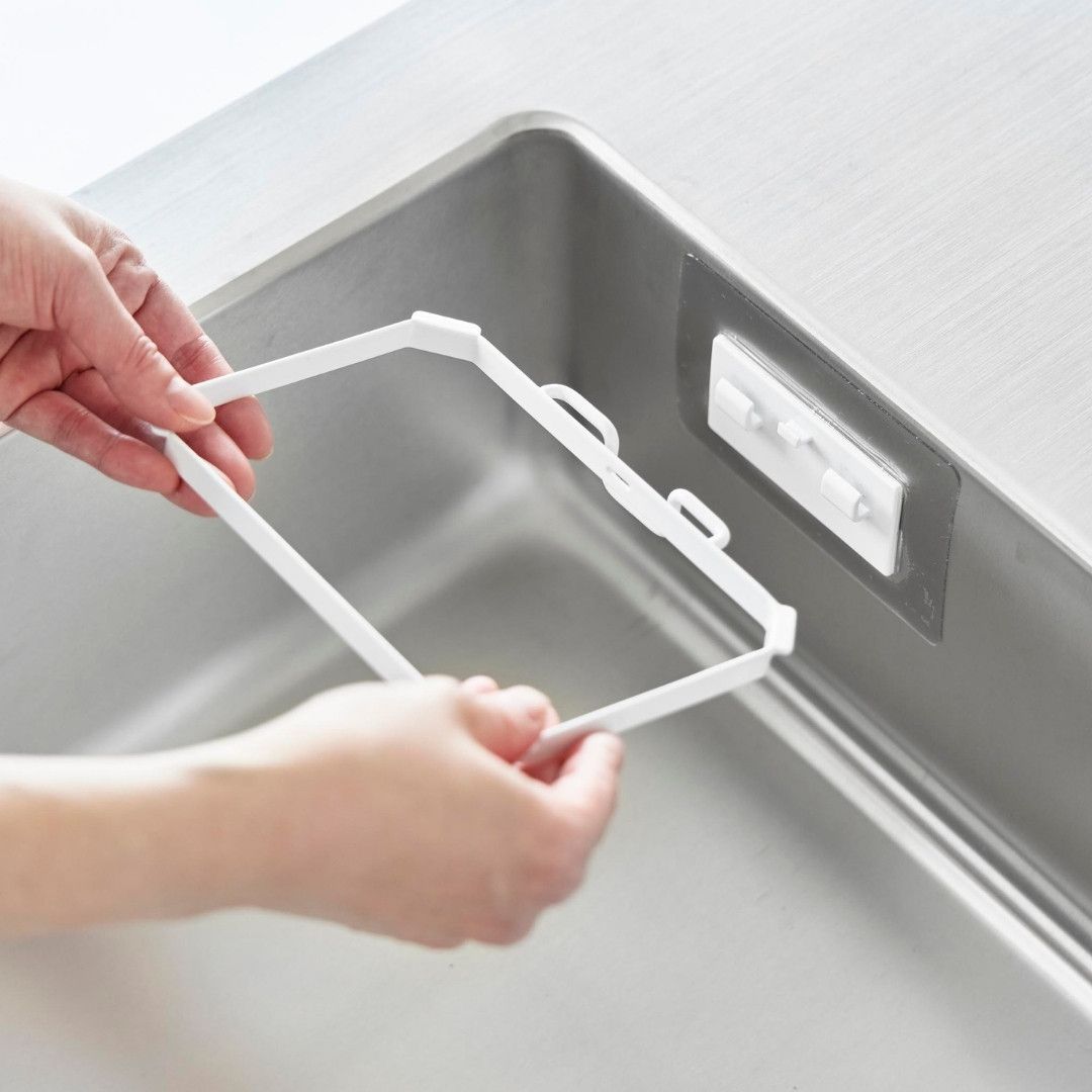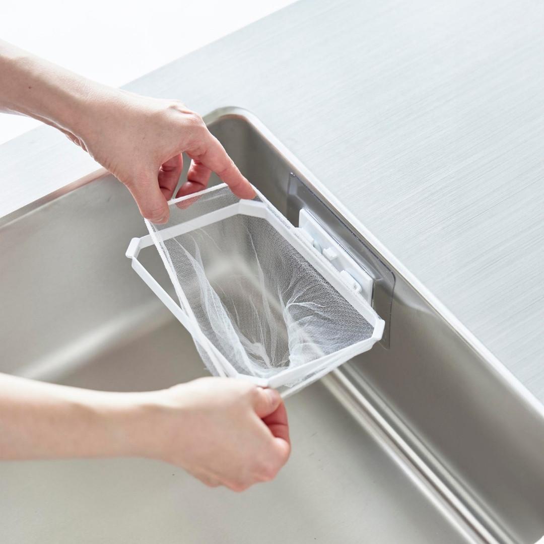 フレーム式が正解。 浮かせて省スペース化 シンク内に浮かせてゴミ捨てを設置できる水切りネットホルダー。お好きな位置にフィルムフックを取り付けてご使用が可能です。ボックス式のように場所を取らないのでシンク内を広くお使いいただけます。キッチンになじむ、2色のカラーバリエーション カラーは、清潔感のあるホワイト、スタイリッシュなブラックをご用意しました。キッチンに似合うシンプルなモノトーンカラーです。キッチン小物やインテリアに合わせてお好きなカラーをお選びください。かぶせるだけの簡単取り付け 市販の水切りネットや水切りポリ袋をフレーム全体に被せるだけでセットが完了します。交換時は下から引き抜くだけなのでゴミ捨ても手間なしです。フレームのみのシンプルな構造だから場所を取らず、ヌメリ汚れも気になりません。折りたたんでコンパクト化。 角型間口が壁面にフィット 使わないときは、フレームを引き上げながら固定して収納が可能です。コンパクトになってシンク内での作業の邪魔になりません。フレームは取り外して丸洗いができるので、汚れを気にすることなく清潔にお使いいただけます。簡単。 貼って、引っ掛けるだけ 壁にフィルムフックを貼り付けたら本体を引っ掛けるだけで取り付けが完了です。カチッと音が鳴ったらしっかり取り付けられた合図。ご使用の壁面はフィルムフックの接着面より大きい面、タイル・ステンレス・人工大理石などの、光沢があり油染みしない面をお選びください。