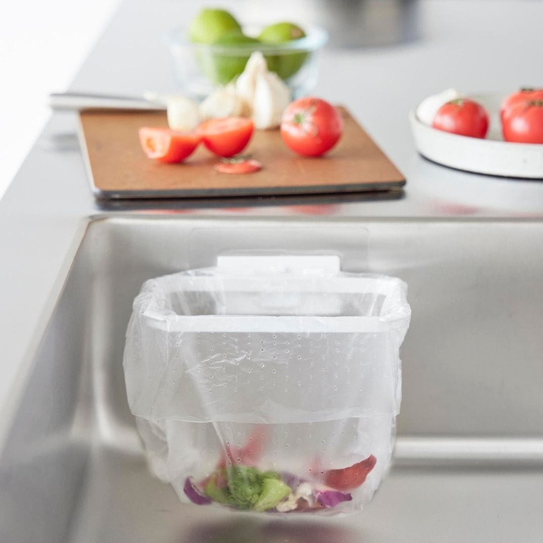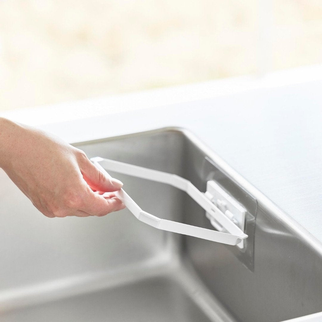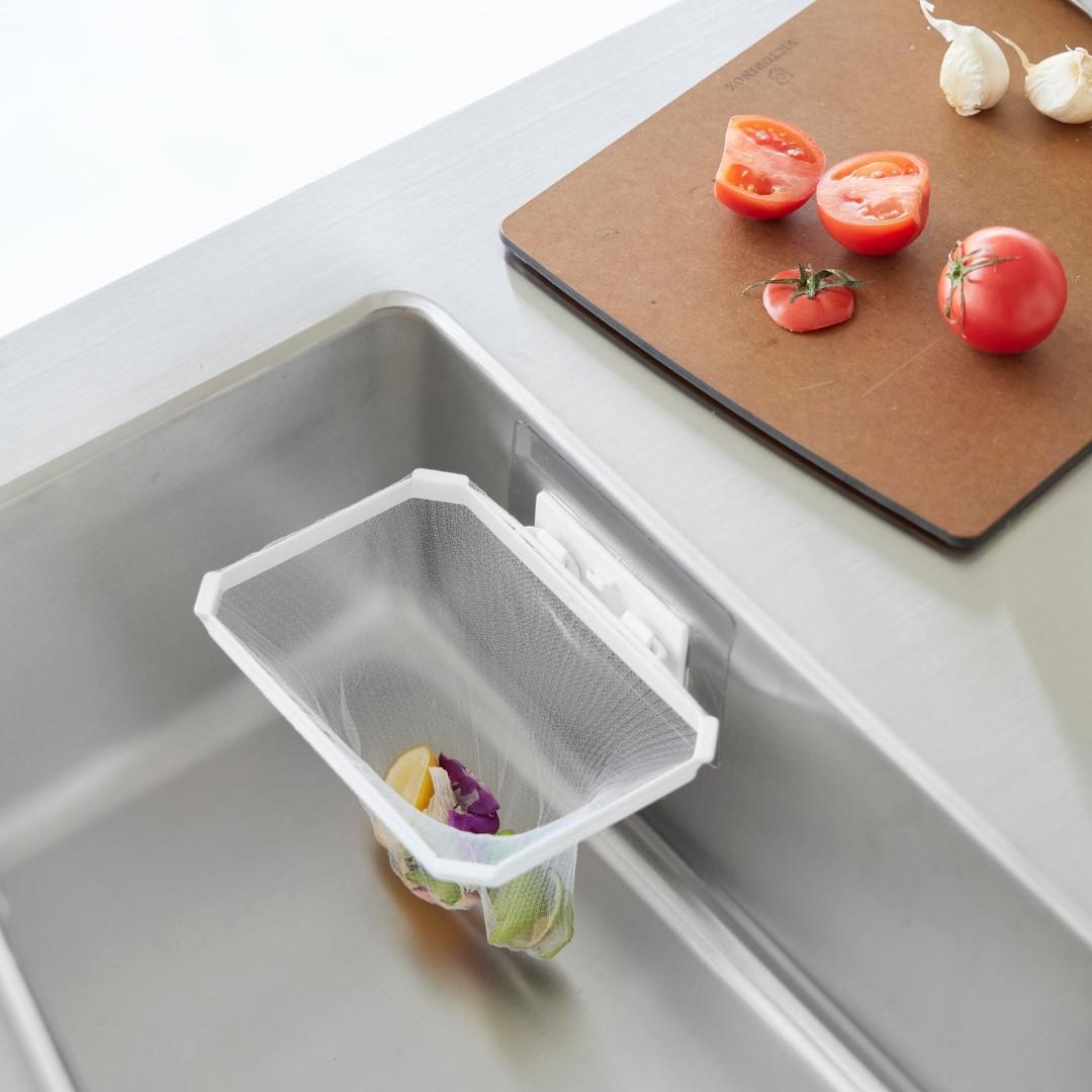 フレーム式が正解。 浮かせて省スペース化 シンク内に浮かせてゴミ捨てを設置できる水切りネットホルダー。お好きな位置にフィルムフックを取り付けてご使用が可能です。ボックス式のように場所を取らないのでシンク内を広くお使いいただけます。キッチンになじむ、2色のカラーバリエーション カラーは、清潔感のあるホワイト、スタイリッシュなブラックをご用意しました。キッチンに似合うシンプルなモノトーンカラーです。キッチン小物やインテリアに合わせてお好きなカラーをお選びください。かぶせるだけの簡単取り付け 市販の水切りネットや水切りポリ袋をフレーム全体に被せるだけでセットが完了します。交換時は下から引き抜くだけなのでゴミ捨ても手間なしです。フレームのみのシンプルな構造だから場所を取らず、ヌメリ汚れも気になりません。折りたたんでコンパクト化。 角型間口が壁面にフィット 使わないときは、フレームを引き上げながら固定して収納が可能です。コンパクトになってシンク内での作業の邪魔になりません。フレームは取り外して丸洗いができるので、汚れを気にすることなく清潔にお使いいただけます。簡単。 貼って、引っ掛けるだけ 壁にフィルムフックを貼り付けたら本体を引っ掛けるだけで取り付けが完了です。カチッと音が鳴ったらしっかり取り付けられた合図。ご使用の壁面はフィルムフックの接着面より大きい面、タイル・ステンレス・人工大理石などの、光沢があり油染みしない面をお選びください。