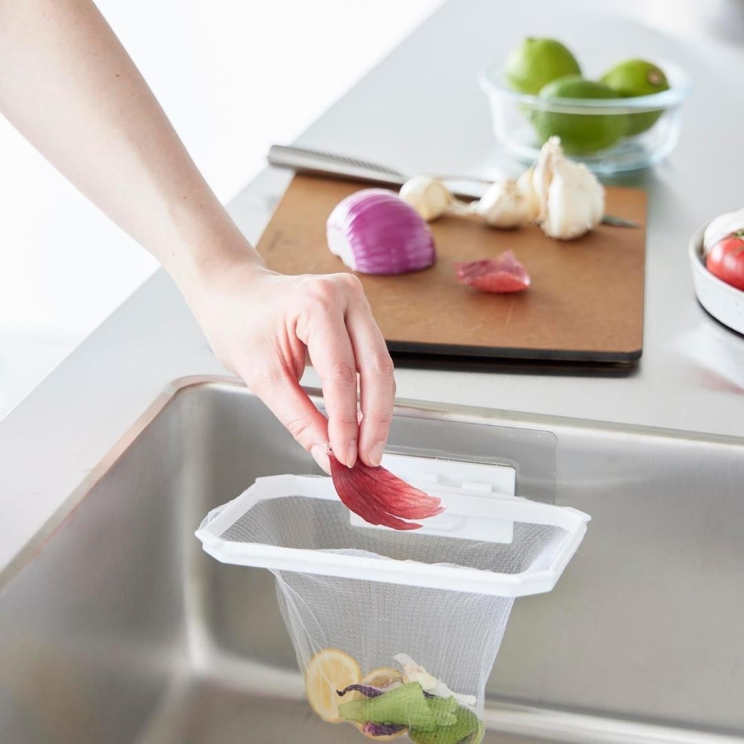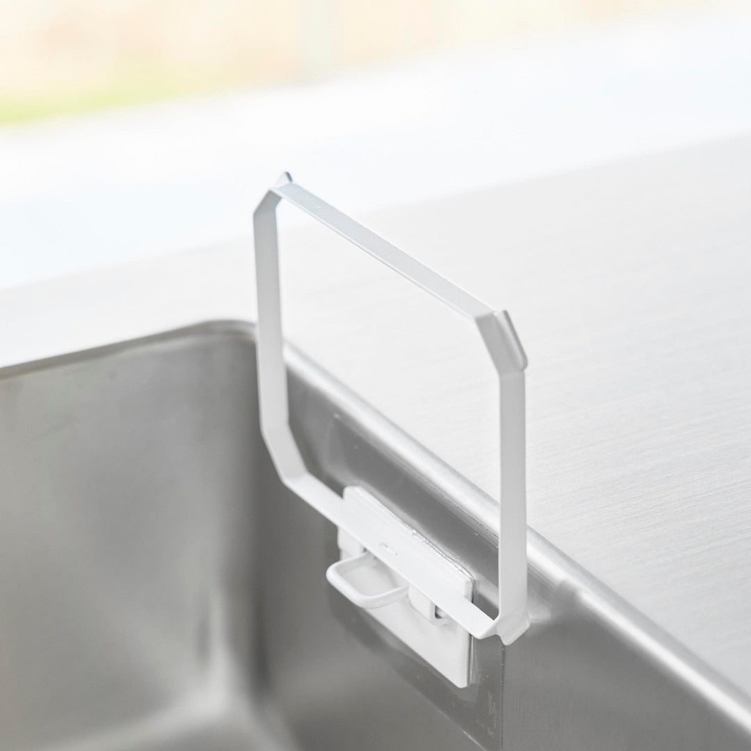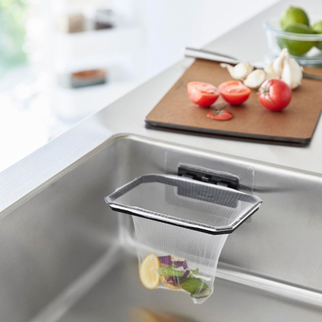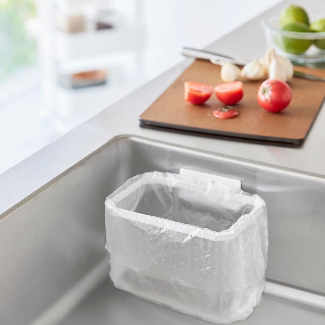フレーム式が正解。 浮かせて省スペース化 シンク内に浮かせてゴミ捨てを設置できる水切りネットホルダー。お好きな位置にフィルムフックを取り付けてご使用が可能です。ボックス式のように場所を取らないのでシンク内を広くお使いいただけます。キッチンになじむ、2色のカラーバリエーション カラーは、清潔感のあるホワイト、スタイリッシュなブラックをご用意しました。キッチンに似合うシンプルなモノトーンカラーです。キッチン小物やインテリアに合わせてお好きなカラーをお選びください。かぶせるだけの簡単取り付け 市販の水切りネットや水切りポリ袋をフレーム全体に被せるだけでセットが完了します。交換時は下から引き抜くだけなのでゴミ捨ても手間なしです。フレームのみのシンプルな構造だから場所を取らず、ヌメリ汚れも気になりません。折りたたんでコンパクト化。 角型間口が壁面にフィット 使わないときは、フレームを引き上げながら固定して収納が可能です。コンパクトになってシンク内での作業の邪魔になりません。フレームは取り外して丸洗いができるので、汚れを気にすることなく清潔にお使いいただけます。簡単。 貼って、引っ掛けるだけ 壁にフィルムフックを貼り付けたら本体を引っ掛けるだけで取り付けが完了です。カチッと音が鳴ったらしっかり取り付けられた合図。ご使用の壁面はフィルムフックの接着面より大きい面、タイル・ステンレス・人工大理石などの、光沢があり油染みしない面をお選びください。