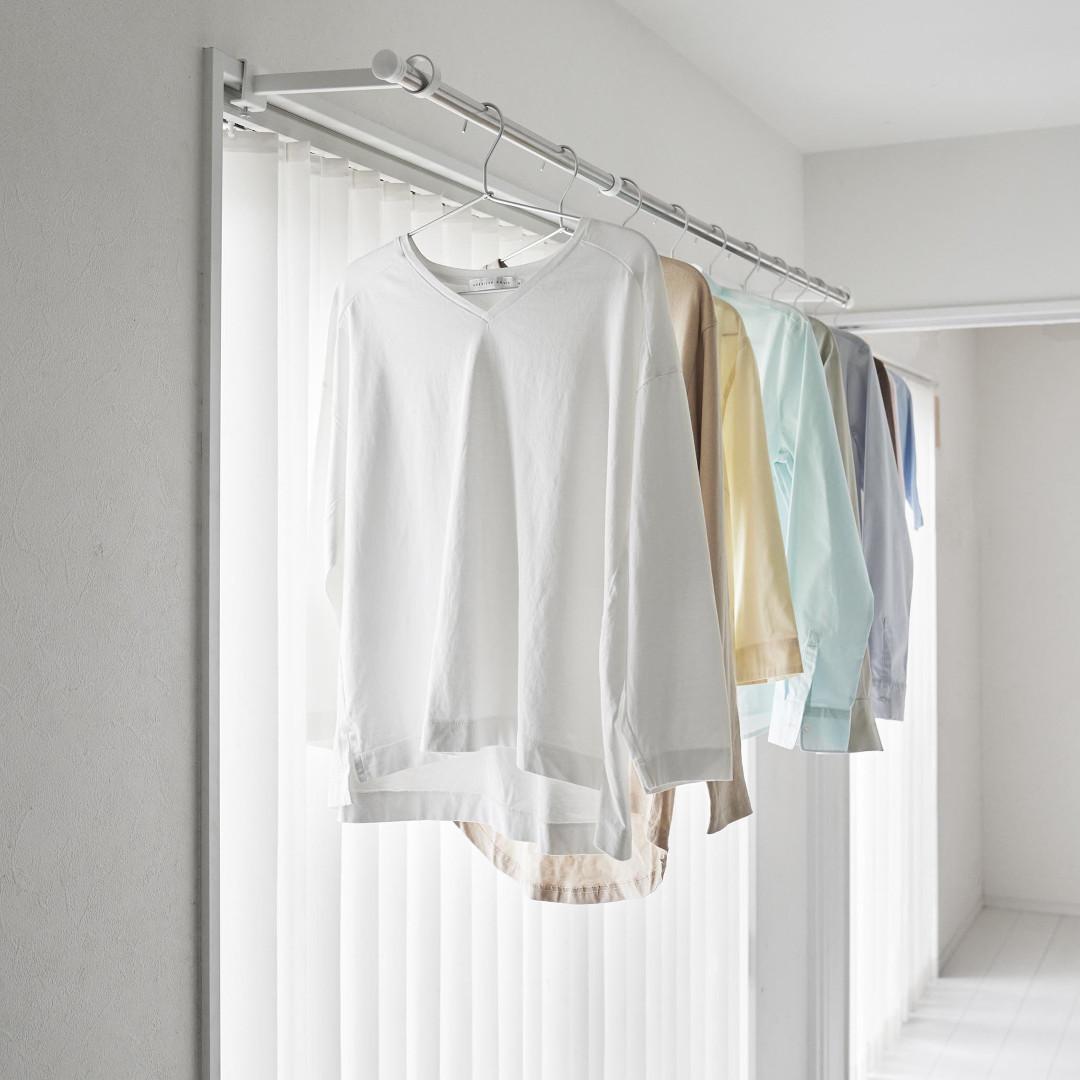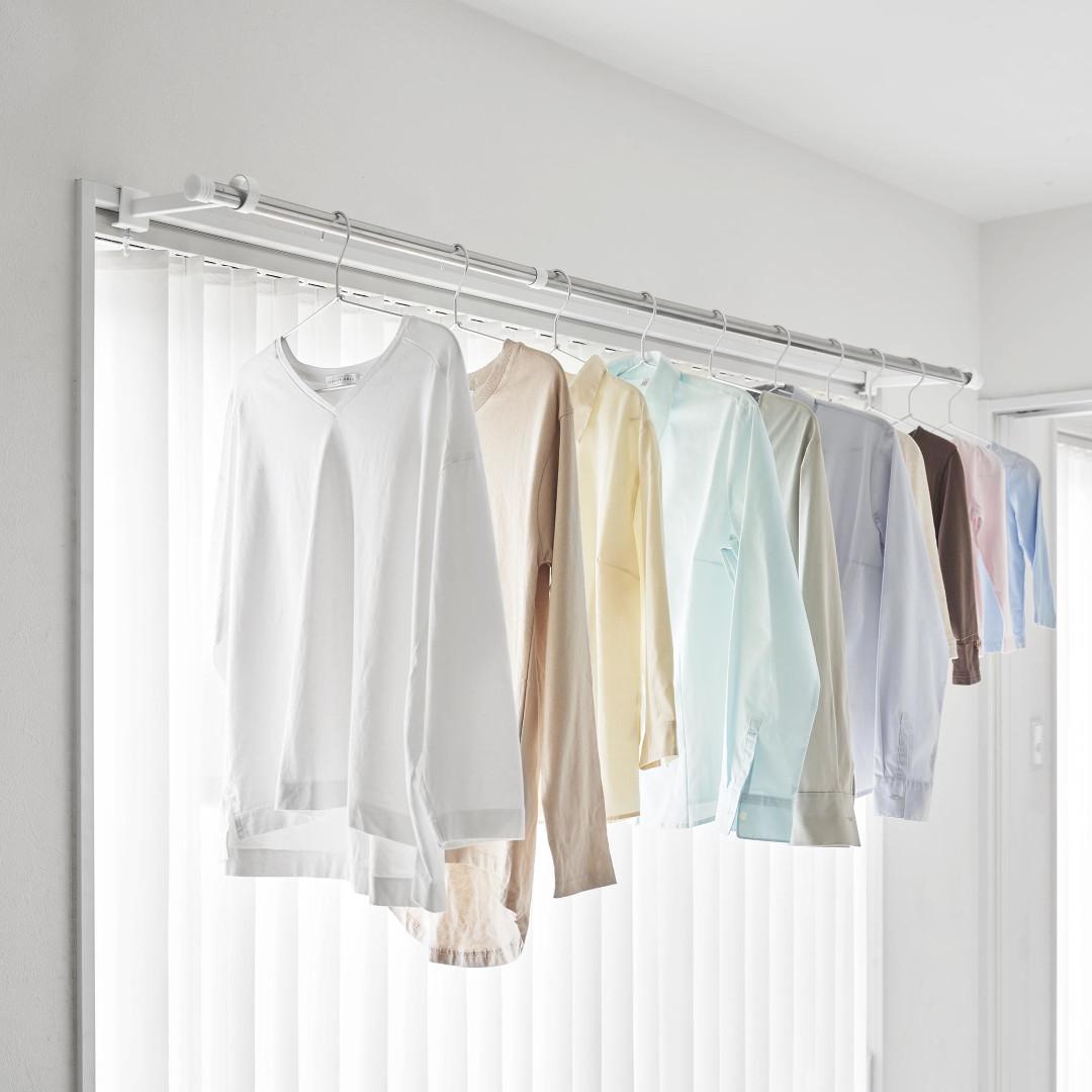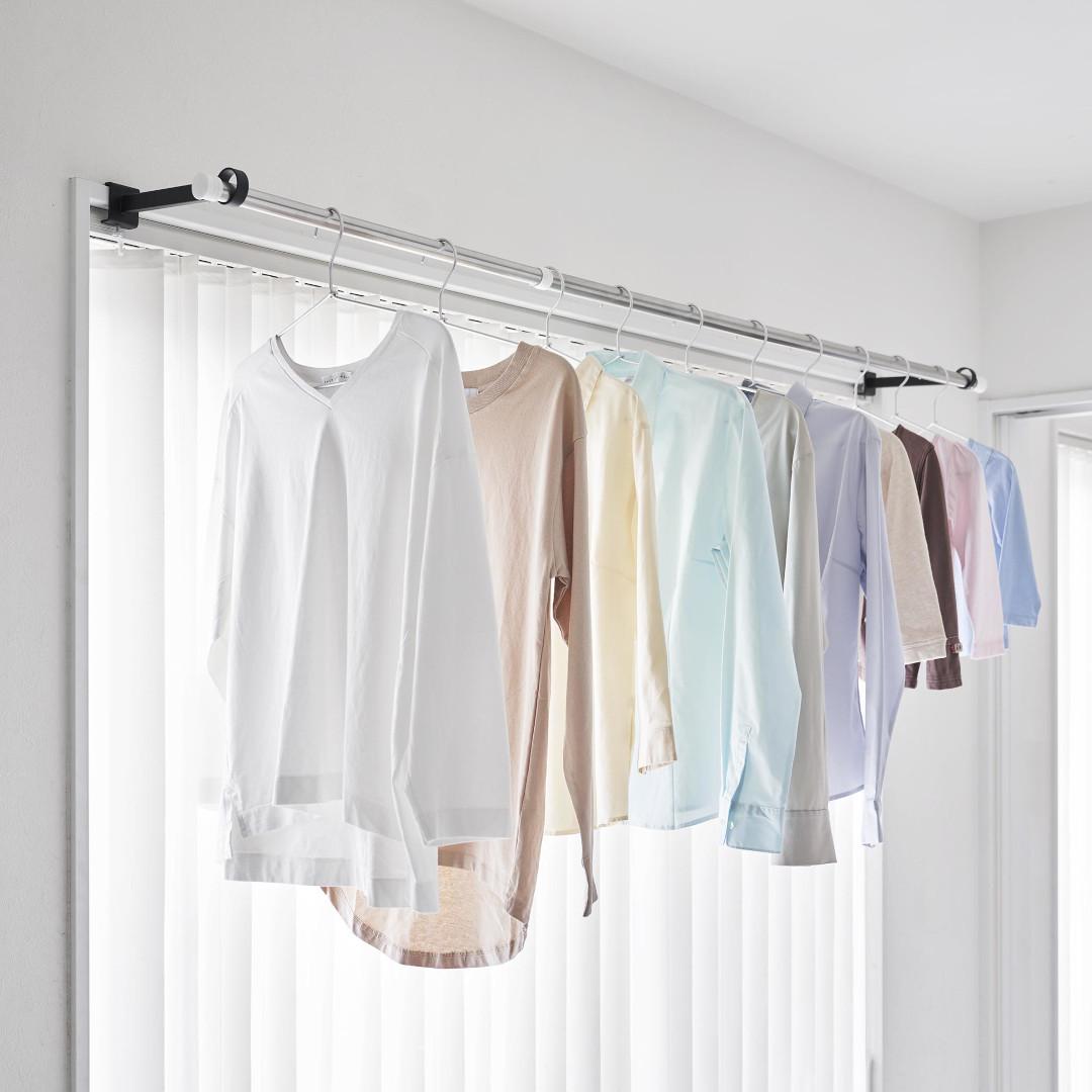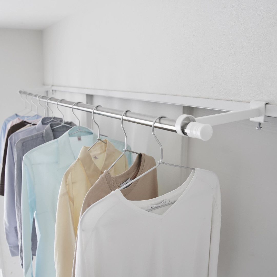 窓枠をランドリースペースにお家の中にある鴨居や窓枠などに取り付けて使える、物干しポールホルダーです。足りない物干しスペースを手軽に増設できます。ピンチハンガーも掛けやすいゆとりある奥行きがGOOD。※こちらの商品にポールは付属しておりません。お部屋になじみやすい、2色のカラーバリエーションカラーは、明るい印象のホワイト、スタイリッシュなブラックをご用意しました。どのお部屋にも合わせやすいシンプルなモノトーンカラーです。壁面や扉など設置場所に合わせてお好みのカラーをお選びください。扉やカーテンに干渉しにくいたっぷりとした奥行き設置面からポールまでの奥行きは18.5cmあるため、ドアやカーテンにハンガーがぶつからずに衣類をムラなく乾燥させられます。カーテンを閉めても干渉しづらいため、お出かけ前や夜にカーテンを閉めたまま干せて防犯面も◎室内干しなら雨でも花粉でも問題なし。梅雨や花粉の時期など、衣類を屋外に干せない時期は部屋干しの機会が多くなります。けれどいざ室内干しをしてみると、予想以上に干せるスペースが少ないことに気が付きます。物干しスペースが増えれば洗濯物が溜まらず、「着るものが無い。」なんて困りごとがなくなります。調節ネジで固定するだけのお手軽さ。 穴をあけずに設置上部にあるピンを枠にはめ込んだら、調節ネジを締めて取り付けが完了です。固定に使用する六角レンチは付属しているのでご自身でご用意いただかなくても大丈夫です。鴨居や窓枠などを上下から挟むように設置するため、しっかりと固定できて安心。