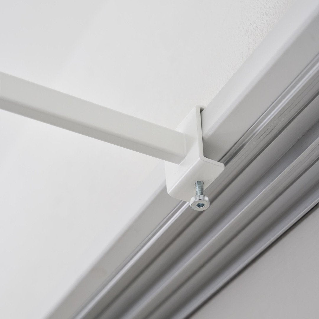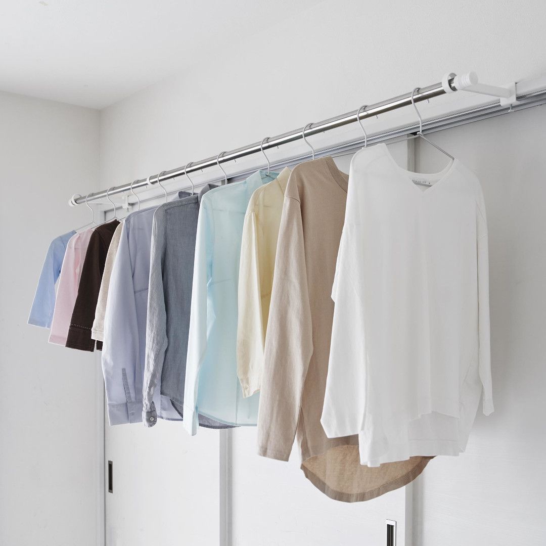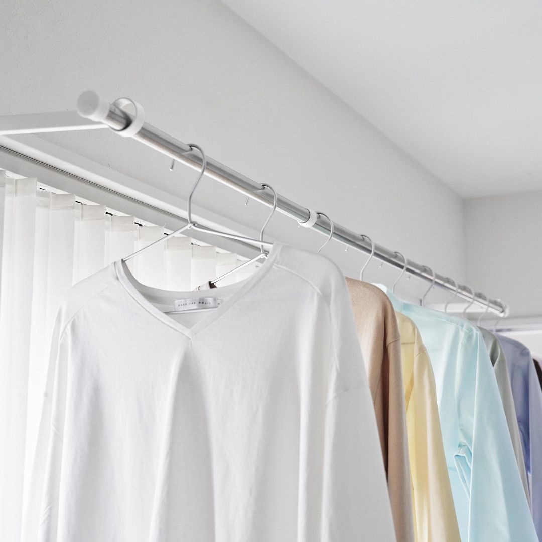 窓枠をランドリースペースにお家の中にある鴨居や窓枠などに取り付けて使える、物干しポールホルダーです。足りない物干しスペースを手軽に増設できます。ピンチハンガーも掛けやすいゆとりある奥行きがGOOD。※こちらの商品にポールは付属しておりません。お部屋になじみやすい、2色のカラーバリエーションカラーは、明るい印象のホワイト、スタイリッシュなブラックをご用意しました。どのお部屋にも合わせやすいシンプルなモノトーンカラーです。壁面や扉など設置場所に合わせてお好みのカラーをお選びください。扉やカーテンに干渉しにくいたっぷりとした奥行き設置面からポールまでの奥行きは18.5cmあるため、ドアやカーテンにハンガーがぶつからずに衣類をムラなく乾燥させられます。カーテンを閉めても干渉しづらいため、お出かけ前や夜にカーテンを閉めたまま干せて防犯面も◎室内干しなら雨でも花粉でも問題なし。梅雨や花粉の時期など、衣類を屋外に干せない時期は部屋干しの機会が多くなります。けれどいざ室内干しをしてみると、予想以上に干せるスペースが少ないことに気が付きます。物干しスペースが増えれば洗濯物が溜まらず、「着るものが無い。」なんて困りごとがなくなります。調節ネジで固定するだけのお手軽さ。 穴をあけずに設置上部にあるピンを枠にはめ込んだら、調節ネジを締めて取り付けが完了です。固定に使用する六角レンチは付属しているのでご自身でご用意いただかなくても大丈夫です。鴨居や窓枠などを上下から挟むように設置するため、しっかりと固定できて安心。