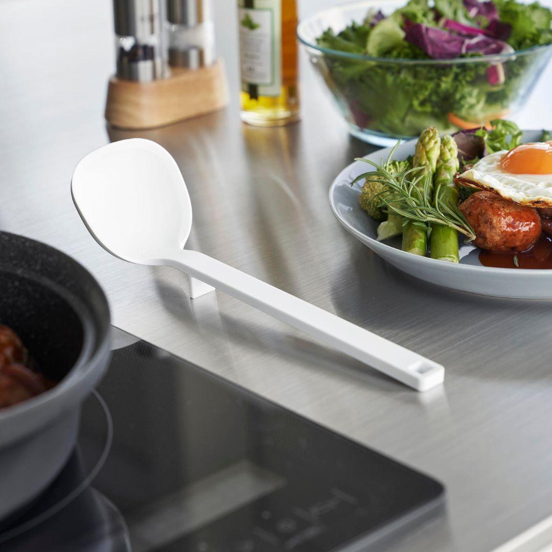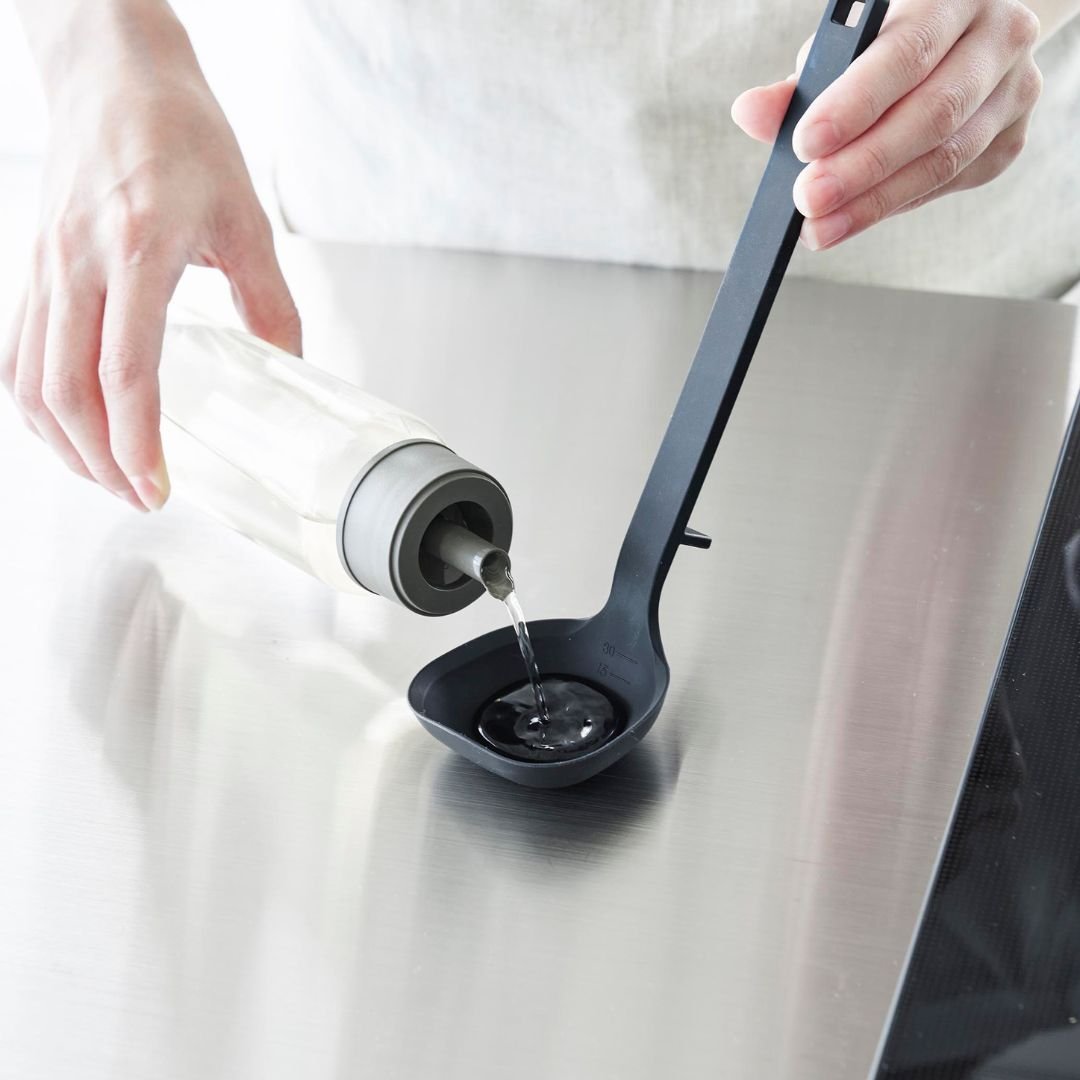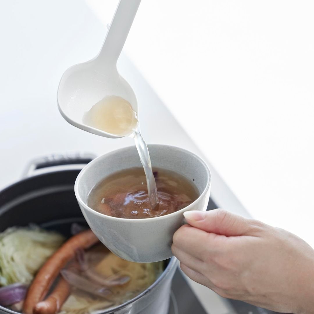 使いやすくオシャレなシリコーンお玉 Sサイズ towerのシリコーンお玉に、ひと回り小さめのSサイズが登場しました。お料理の際、キッチンツールはなくてはならない存在ですが、使いやすくオシャレなものを選びたいと思いませんか? towerのキッチンツールは機能性と見た目どちらも満足できるものばかりです。高いデザイン性とシリコン製で柔軟性の高さが魅力的なお玉は1度使ったら他のものが使えなくなるほどです。キッチンになじみやすい2つのカラー カラーはホワイトとブラックの2種類をご用意しています。どちらもマットな質感でキッチンをオシャレなイメージに。キッチンになじみやすいモノトーンカラーなので、他のキッチングッズやキッチン家電と色を統一することで、おしゃれな空間を演出可能です。アクセントカラーとして取り入れるのも◎。注ぎやすい仕様 素材は柔軟性の高いシリコン素材。お鍋やフライパン、ボウルなどを傷つける心配がないので安心してお使いいただけます。シチューなどをよそう時、お鍋の端にフィットするためよそいやすいのが特徴。お鍋の中に残すことなく全て注ぎきることができるのはうれしいポイント。また、お玉の先端部分に丸みがあるため、どちら側からも注ぎやすくなっています。もちろん、シリコン製なので香りの強い料理でもニオイが付く心配がありません。目盛り付きで便利 調味料を計る時、計量スプーンを使う方が多いと思います。でも、わざわざ用意したり、洗い物が増えるのは面倒ですよね? towerのシリコンお玉なら、30ccと15ccが計れる目盛りが付いているので便利。わざわざ計量スプーンを用意する必要がありません。調味料を入れてそのままお鍋に注げるので、調理の効率アップに役立ちます。調理台の上にそのまま置ける お鍋の中をかき混ぜた後などお玉を置いておきたい時、お皿などを用意しなくてはなりません。でも、towerのシリコンお玉ならその必要はナシ。先端部分が浮くよう作られているので、調理台などの上にそのまま置いておくことができます。直置きにならないのでの衛生的にも安心でき、洗い物の節に役立ちそうです。お料理によって使い分けられるよう、通常サイズと揃えて使うのもおすすめです。