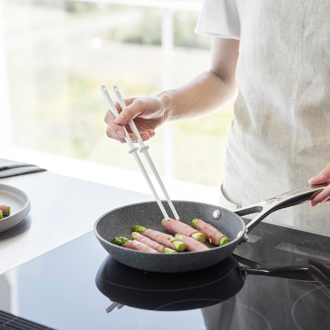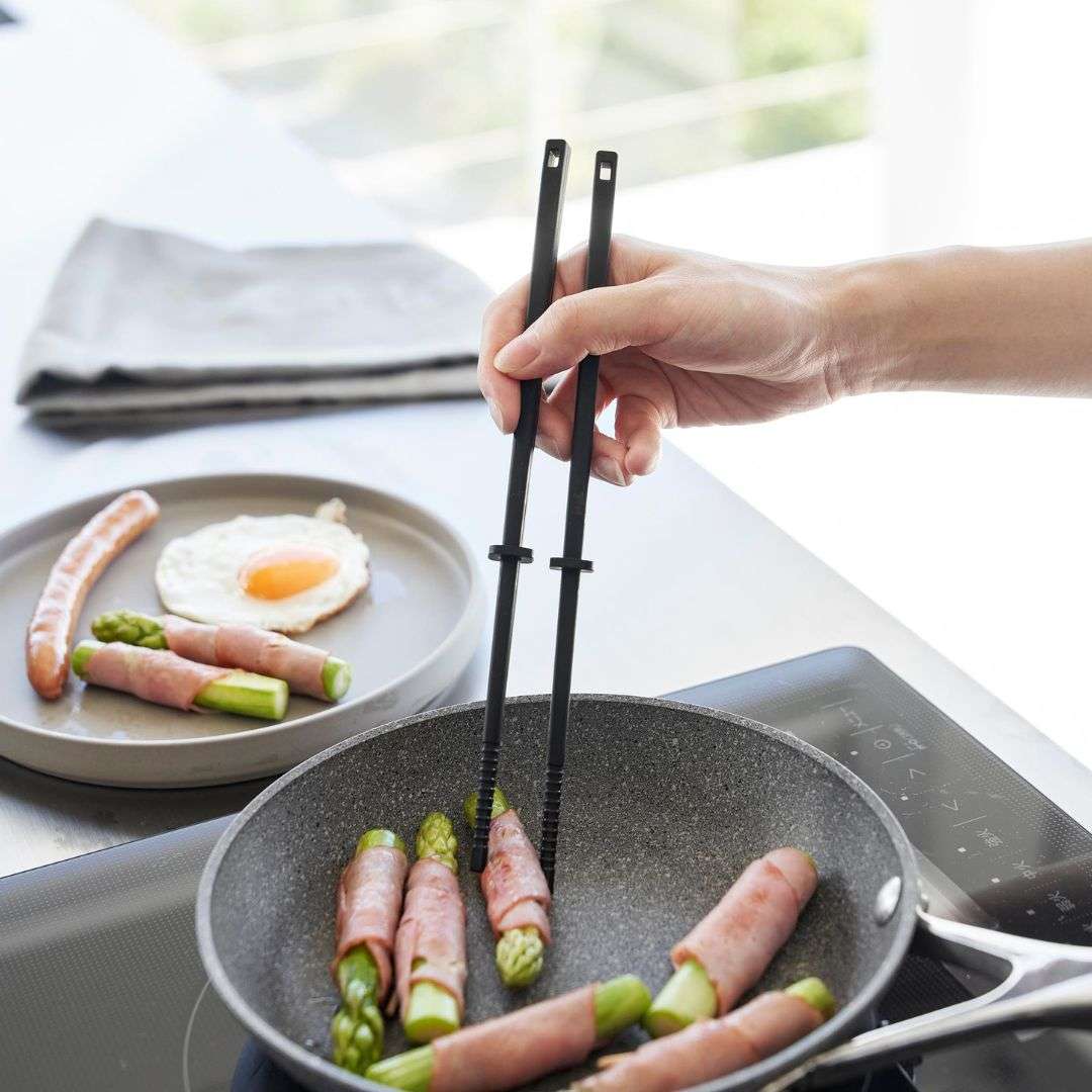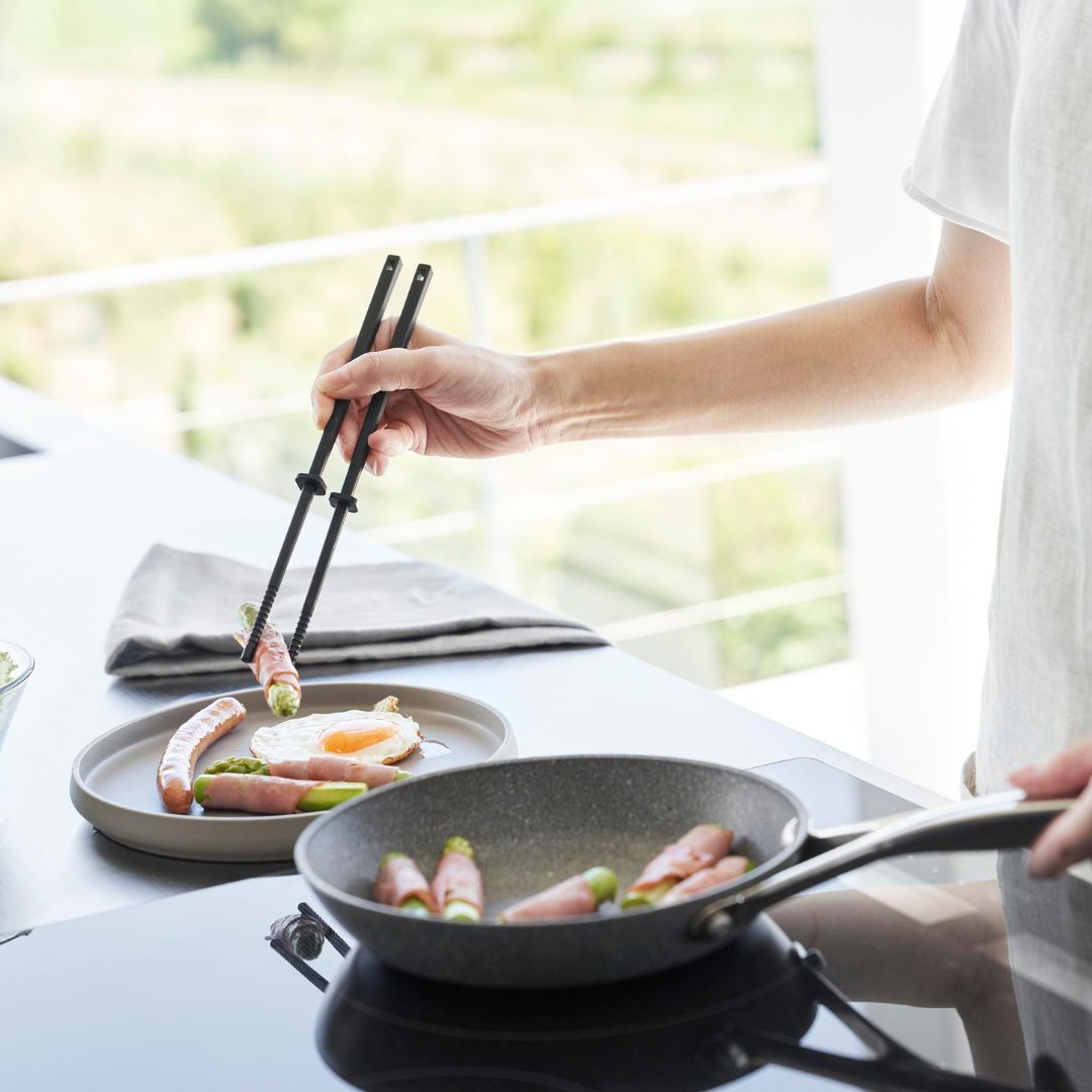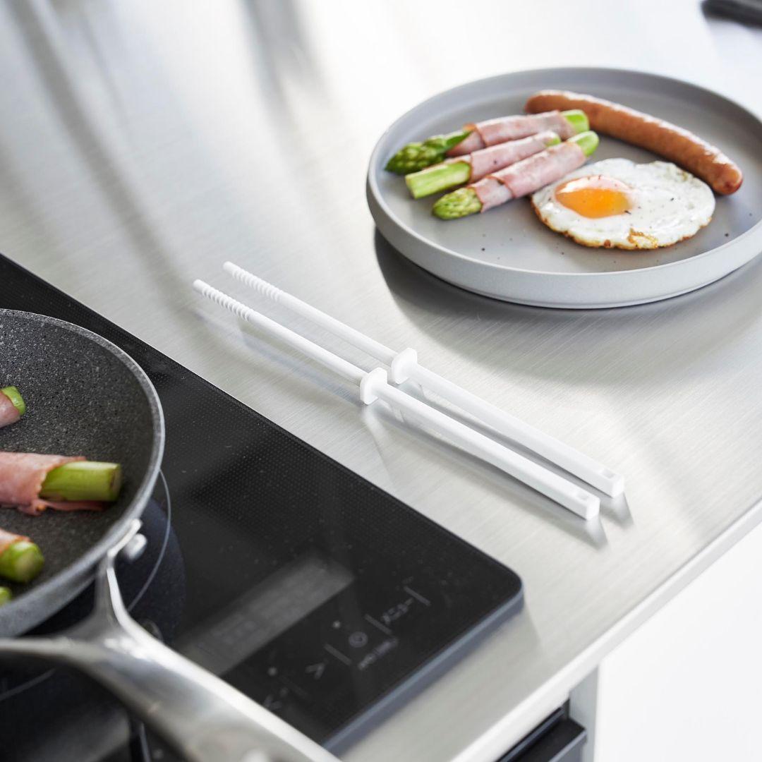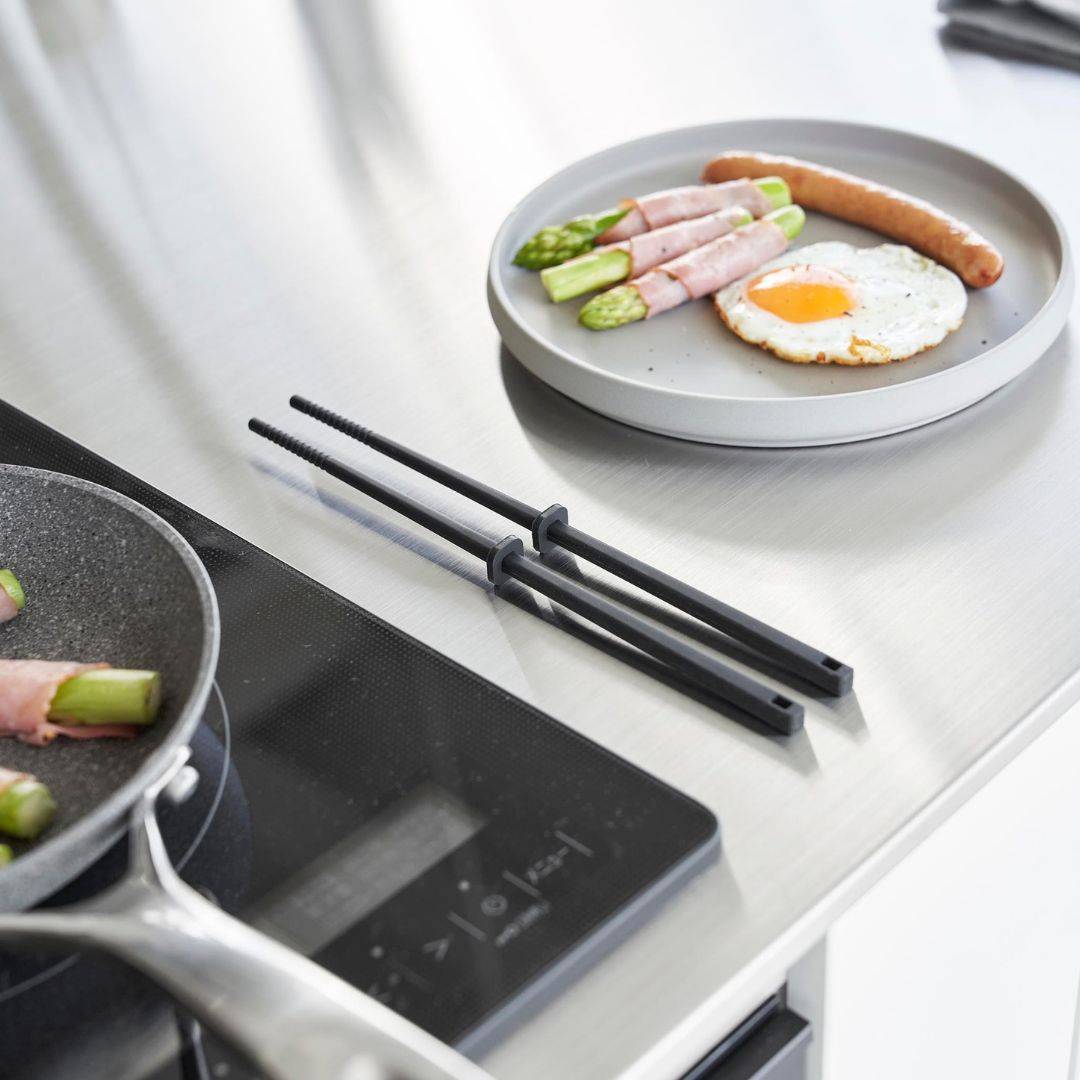 使い勝手を追求したシリコーン菜箸 Sサイズ 熱くならず滑りにくい、towerのシリコーン製の菜箸に、ひと回り小さめのSサイズが登場しました。毎日のご飯作りで欠かせないキッチンツール。どれを使っても同じと思いがちですが、使って納得のシリコーンシリーズは一度使うと手放せなくなるほど調理時間を快適にしてくれます。余分な繋ぎ目のない一体成なので握りやすくお手入れも簡単。スッキリとしたシンプルなデザインでどんなキッチンにも溶け込みます。キッチンになじみやすい2つのカラー カラーはホワイトとブラックの2種類をご用意しています。どちらもマットな質感でキッチンをオシャレなイメージに。キッチンになじみやすいモノトーンカラーなので、他のキッチングッズやキッチン家電と色を統一することで、おしゃれな空間を演出可能です。アクセントカラーとして取り入れるのも◎。食材をしっかりキャッチ シリコーン菜箸は、滑りにくくしっかり手にフィットして食材を摘みやすいのが特徴。先端の凹凸が食材へのかかりをよくしてくれるので、麺類や小さめの食材もしっかりキャッチ。自由に動かせるキーパー 菜箸についたキーパーはストッパーの役目も。キーパーの位置をずらせば、お鍋のフチにかけることができるので、菜箸がお鍋の中に沈んでしまうのを防げ、ちょっと手を放したいときのストッパーとして便利にお使いいただけます。また、熱々の鍋料理の調理中でも箸に熱が伝わりにくく、しっかり持てるのも魅力です。調理台の上にそのまま置ける 直置きにならずに清潔に使える秘密はスクエア型のキーパー。簡単に動かすことができるので、用途に合わせて自由に位置を調節できます。作業台などに置いた時に先端が浮く構造になっているので、別途小皿やスタンドを用意する必要がありません。菜箸の太いところにも細いところにしっかりとフィットしてくれるので使いやすさもUPします。シンクやテーブルを汚したくないときも安心で、調理の邪魔にもならないのでとっても便利なんです。調理中のちょい置きができて作業がスムーズになり、毎日のお料理がもっと楽しく、もっと楽になりそうですね。