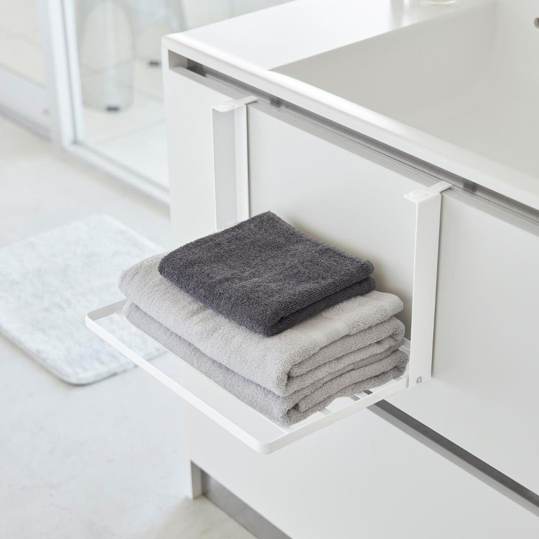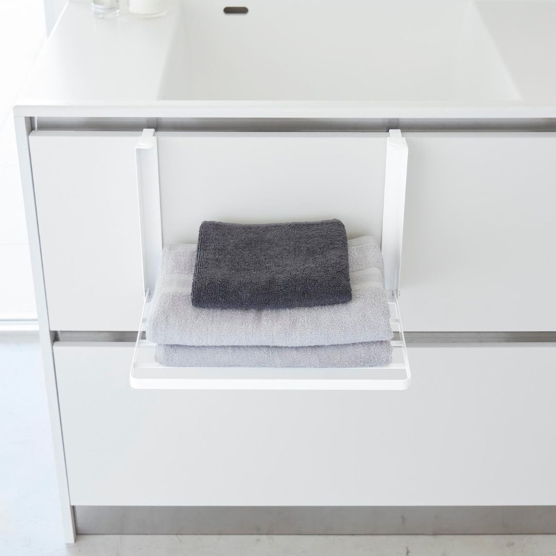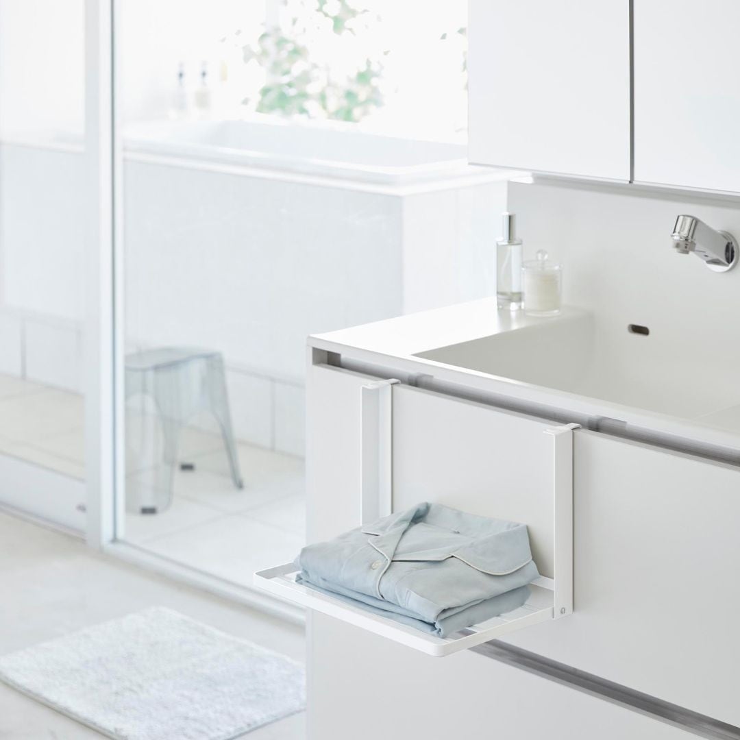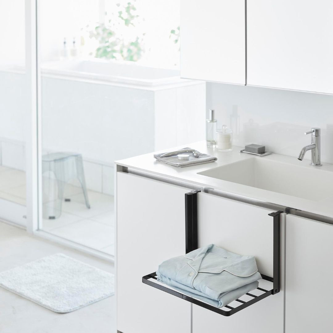 シンプルモダンなデザインの折り畳みラック 洗面台の扉や引き出し上部に引っ掛けるだけで設置できる折り畳み棚です。使わないときは折り畳んでスリムに収納できるので、狭いランドリールームや洗面所でも場所を取らず、空間を有効活用。棚が欲しいけどスペースがなくて付けられないと諦めていた場所に、必要な時にだけ使える折り畳みのラックです。洗濯カゴや洗剤置きにも使う事ができますよ。デザインもシンプルモダンで見た目もバッチリです♪ どんなお部屋にもマッチする、2色のカラーバリエーション カラーは、明るい印象のホワイト、スタイリッシュなブラックをご用意しました。どのお家の空間にもなじみやすいシンプルなモノトーンカラーです。洗面所や戸棚の色などに合わせてお好みのカラーをお選びください。洗面扉に着替えやタオル置きが設置できる 洗面扉に設置しておけば、お風呂上がりの着替えやタオルなどもサッと開いて置くことができます。耐荷重は2kgあるので、ランドリーバスケットの一時置きとしても。見た目もオシャレなので雰囲気を大事にする方にもおすすめです。畳めば奥行4cm、邪魔にならないスリム設計 通常時は棚として大活躍しますが、使わない時には畳むことが出来ます。 畳んだ時の奥行きはわずか4cmのスリム設計。使う時だけ引き出せばいいので狭いスペースを有効活用できますね。 使わない時は畳むことでスペースができ動線確保もでき快適です。畳んだらマグネットで固定 収納時は上部のマグネットでしっかり固定できるので、勝手に開いてしまう心配もありません。開く際は途中で手を離さず、完全に開くまで手を添えてください。