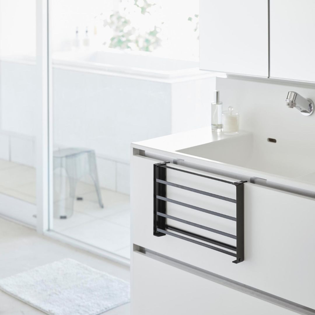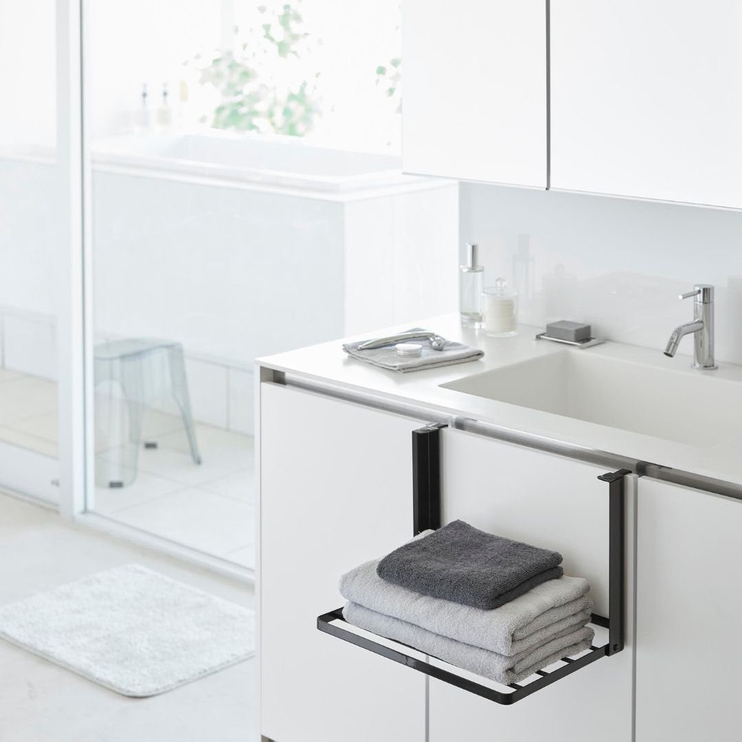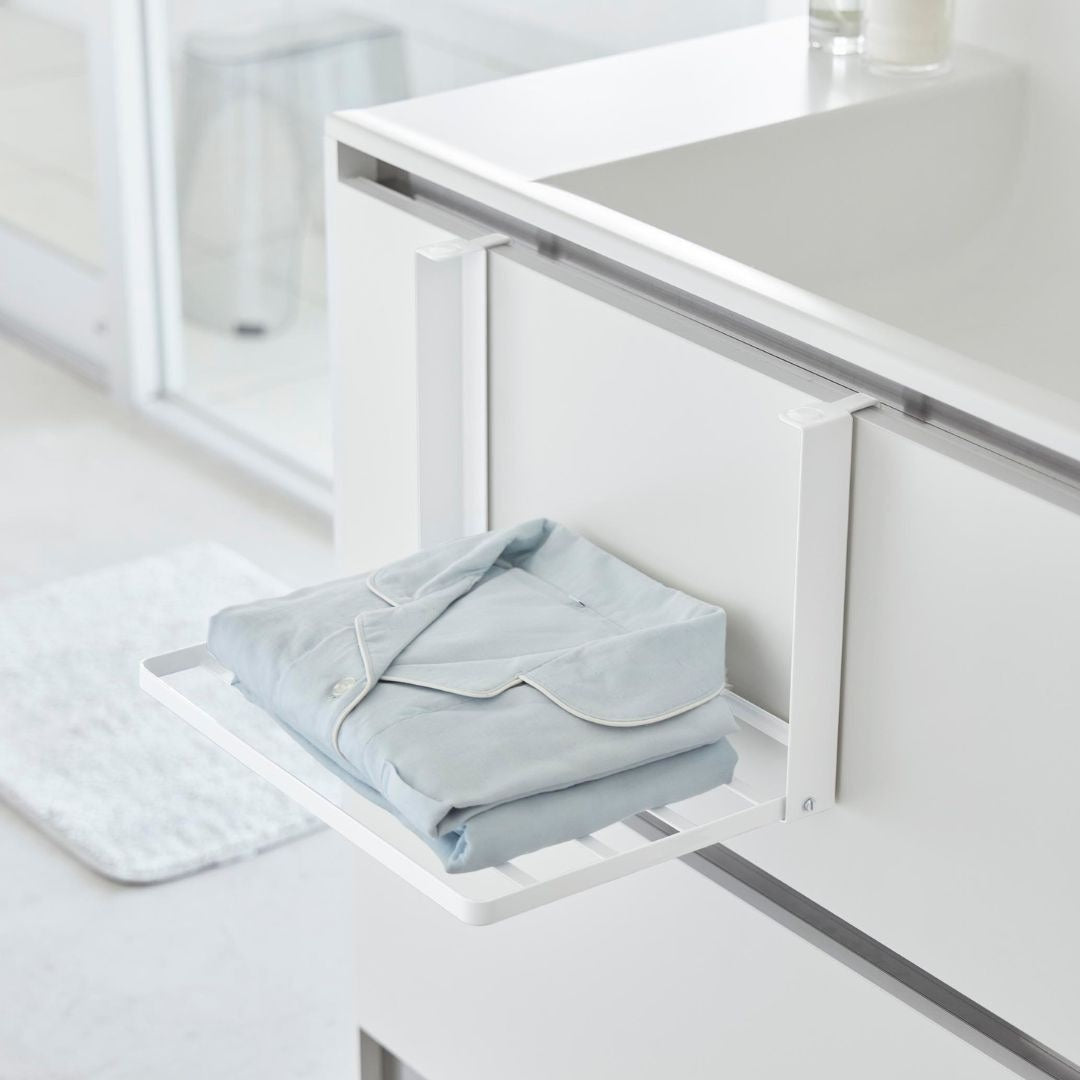シンプルモダンなデザインの折り畳みラック 洗面台の扉や引き出し上部に引っ掛けるだけで設置できる折り畳み棚です。使わないときは折り畳んでスリムに収納できるので、狭いランドリールームや洗面所でも場所を取らず、空間を有効活用。棚が欲しいけどスペースがなくて付けられないと諦めていた場所に、必要な時にだけ使える折り畳みのラックです。洗濯カゴや洗剤置きにも使う事ができますよ。デザインもシンプルモダンで見た目もバッチリです♪ どんなお部屋にもマッチする、2色のカラーバリエーション カラーは、明るい印象のホワイト、スタイリッシュなブラックをご用意しました。どのお家の空間にもなじみやすいシンプルなモノトーンカラーです。洗面所や戸棚の色などに合わせてお好みのカラーをお選びください。洗面扉に着替えやタオル置きが設置できる 洗面扉に設置しておけば、お風呂上がりの着替えやタオルなどもサッと開いて置くことができます。耐荷重は2kgあるので、ランドリーバスケットの一時置きとしても。見た目もオシャレなので雰囲気を大事にする方にもおすすめです。畳めば奥行4cm、邪魔にならないスリム設計 通常時は棚として大活躍しますが、使わない時には畳むことが出来ます。 畳んだ時の奥行きはわずか4cmのスリム設計。使う時だけ引き出せばいいので狭いスペースを有効活用できますね。 使わない時は畳むことでスペースができ動線確保もでき快適です。畳んだらマグネットで固定 収納時は上部のマグネットでしっかり固定できるので、勝手に開いてしまう心配もありません。開く際は途中で手を離さず、完全に開くまで手を添えてください。