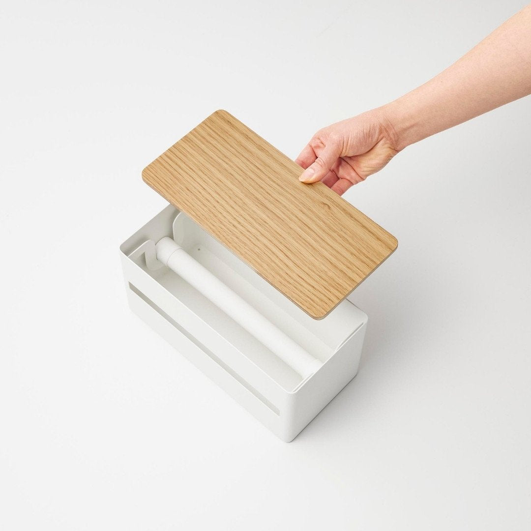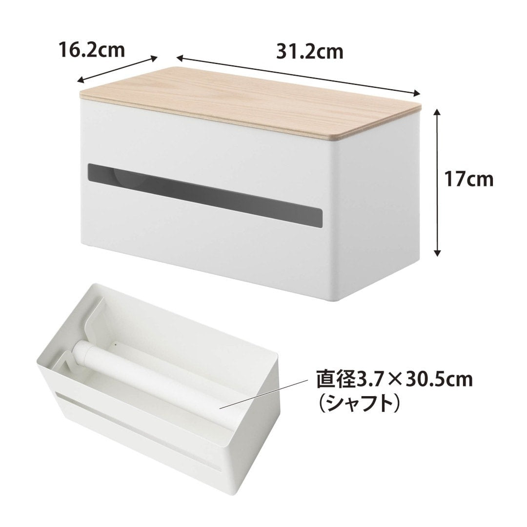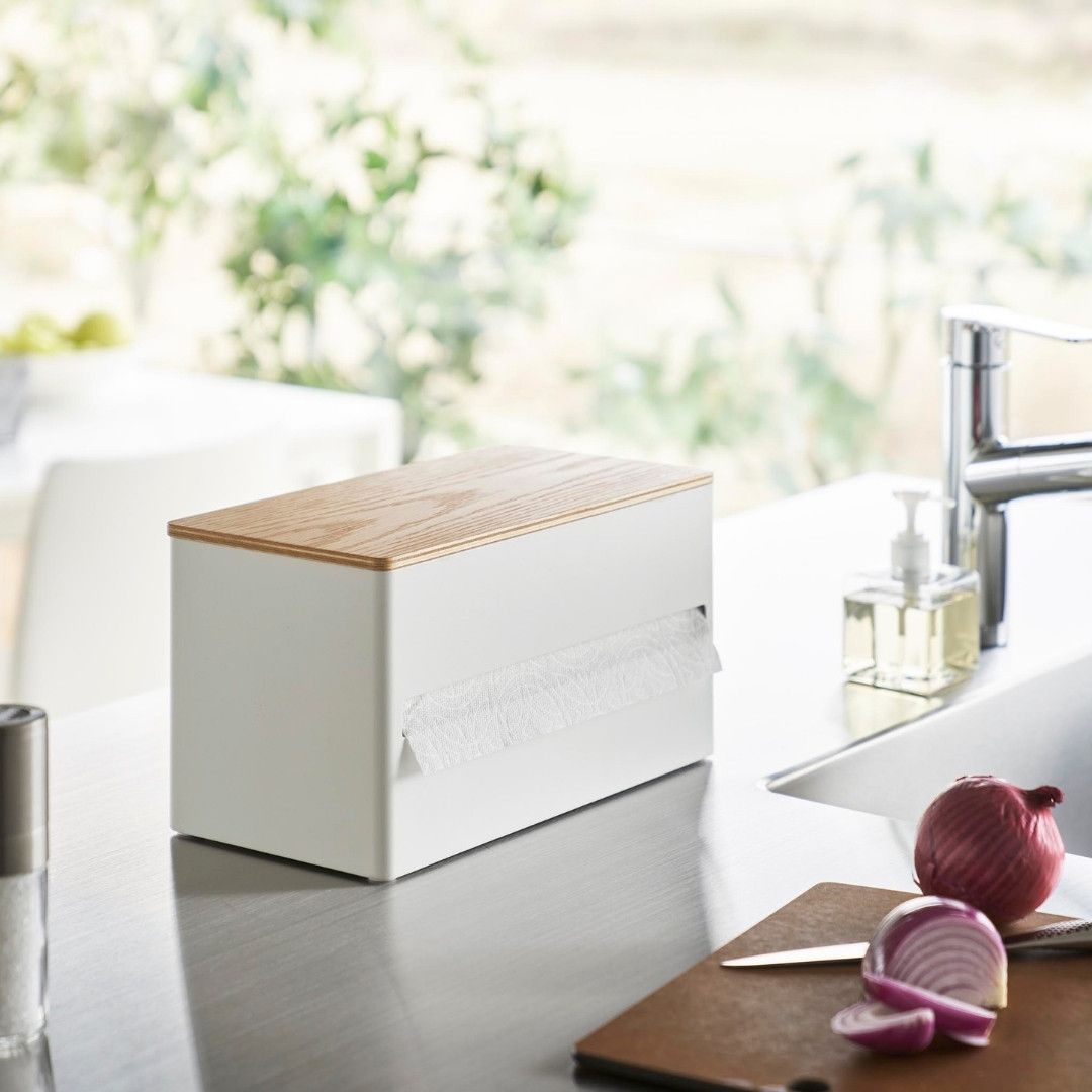 スムーズに取り出せる置き型ホルダー ロールタイプのキッチンペーパーを片手でサッと取り出して切り取れる蓋つきホルダーです。ケースに収納することでほこりの付着を防いで清潔に保管できます。ロールをシャフトに差し込んで使用するため、回転がスムーズで取り出しやすいです。天然木×スチールの組み合わせが光る、2色のカラーバリエーション カラーは、重厚感のあるブラウン、明るい印象のナチュラルをご用意しました。天然木の蓋にスチール製の本体という異素材の組み合わせは、互いの魅力を引き立てています。片手でもスムーズにカットできる 2.2kgある丈夫なスチール製だから安定感は抜群です。ケースを押さえることなくペーパーを切り取れるので、急いでいるときや調理で片手がふさがっているときも便利です。※ペーパーの厚みや硬さによってはカットしにくい場合があります。洗面所ではペーパータオルケースとして ペーパータオルホルダーとしてもお使いいただけるので、洗面台に設置して手拭きや洗顔時に顔を拭くのにも◎。フタの上には眼鏡や化粧品を並べたりと小物置きとしてもご活用いただけます。お使いのキッチンペーパーに合わせて選べる2サイズ展開 国産の一般的なキッチンペーパーロールにはSサイズ、海外製の大判キッチンペーパーロールに対応したLサイズの2種類をご用意しました。※こちらの商品は『片手でカット隠せるキッチンペーパーホルダー L』の商品となり、Sサイズの『片手でカット隠せるキッチンペーパーホルダー S』の商品は別売です。