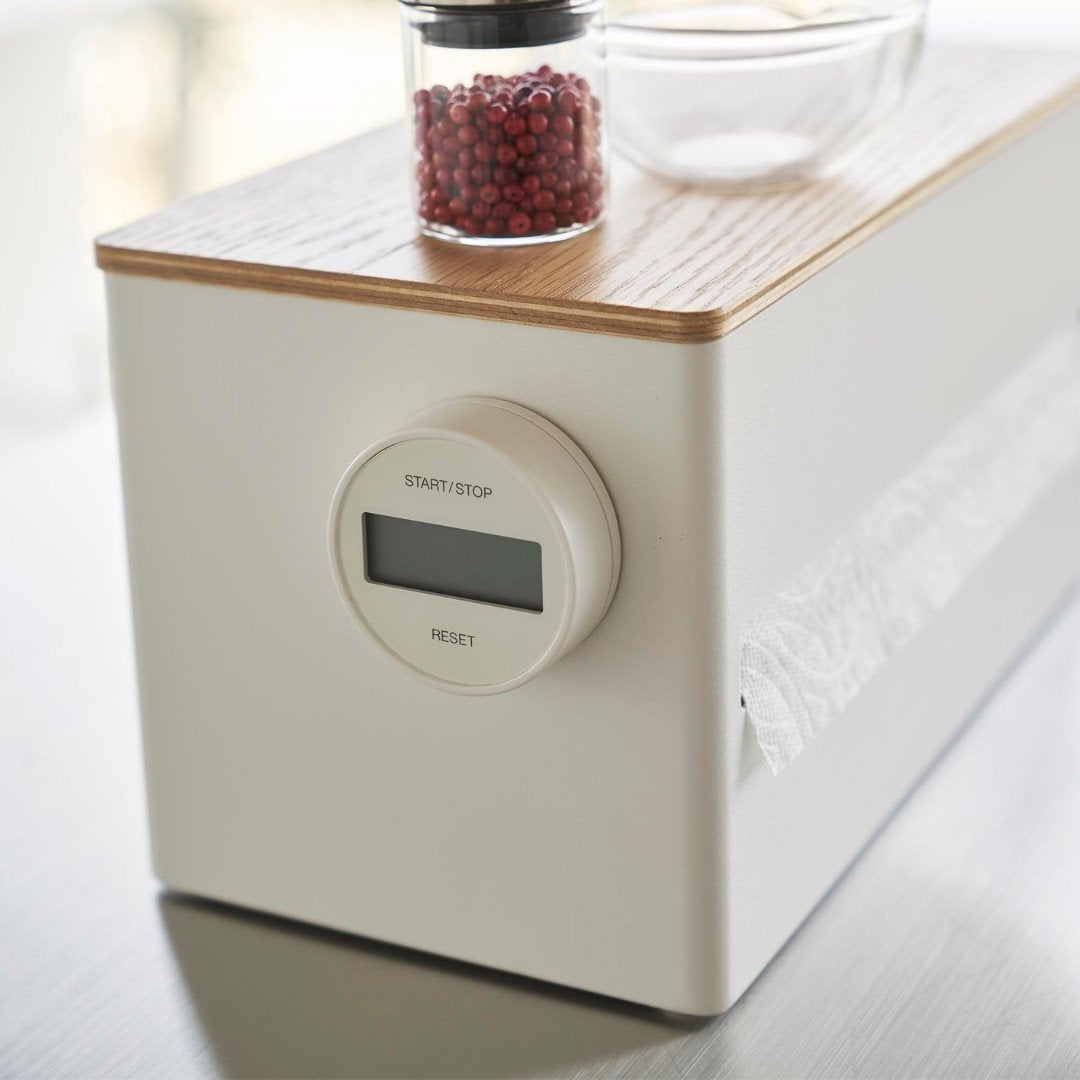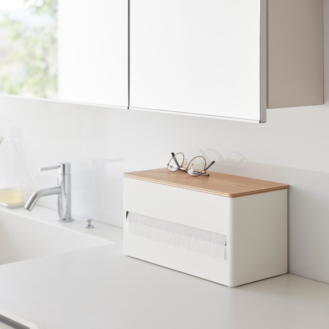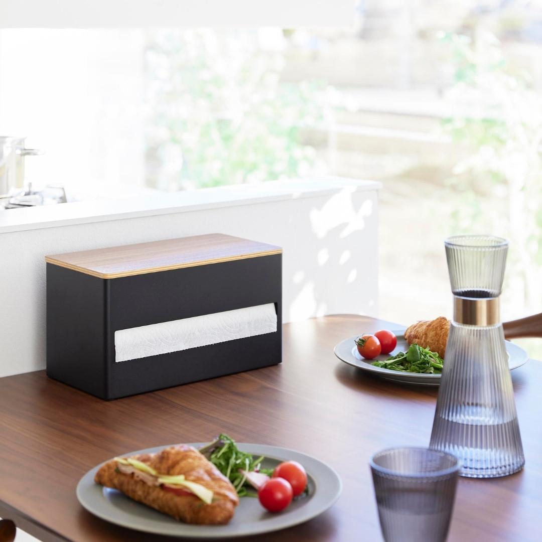 スムーズに取り出せる置き型ホルダー ロールタイプのキッチンペーパーを片手でサッと取り出して切り取れる蓋つきホルダーです。ケースに収納することでほこりの付着を防いで清潔に保管できます。ロールをシャフトに差し込んで使用するため、回転がスムーズで取り出しやすいです。天然木×スチールの組み合わせが光る、2色のカラーバリエーション カラーは、重厚感のあるブラウン、明るい印象のナチュラルをご用意しました。天然木の蓋にスチール製の本体という異素材の組み合わせは、互いの魅力を引き立てています。片手でもスムーズにカットできる 2.2kgある丈夫なスチール製だから安定感は抜群です。ケースを押さえることなくペーパーを切り取れるので、急いでいるときや調理で片手がふさがっているときも便利です。※ペーパーの厚みや硬さによってはカットしにくい場合があります。洗面所ではペーパータオルケースとして ペーパータオルホルダーとしてもお使いいただけるので、洗面台に設置して手拭きや洗顔時に顔を拭くのにも◎。フタの上には眼鏡や化粧品を並べたりと小物置きとしてもご活用いただけます。お使いのキッチンペーパーに合わせて選べる2サイズ展開 国産の一般的なキッチンペーパーロールにはSサイズ、海外製の大判キッチンペーパーロールに対応したLサイズの2種類をご用意しました。※こちらの商品は『片手でカット隠せるキッチンペーパーホルダー L』の商品となり、Sサイズの『片手でカット隠せるキッチンペーパーホルダー S』の商品は別売です。