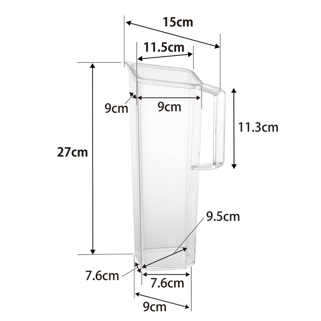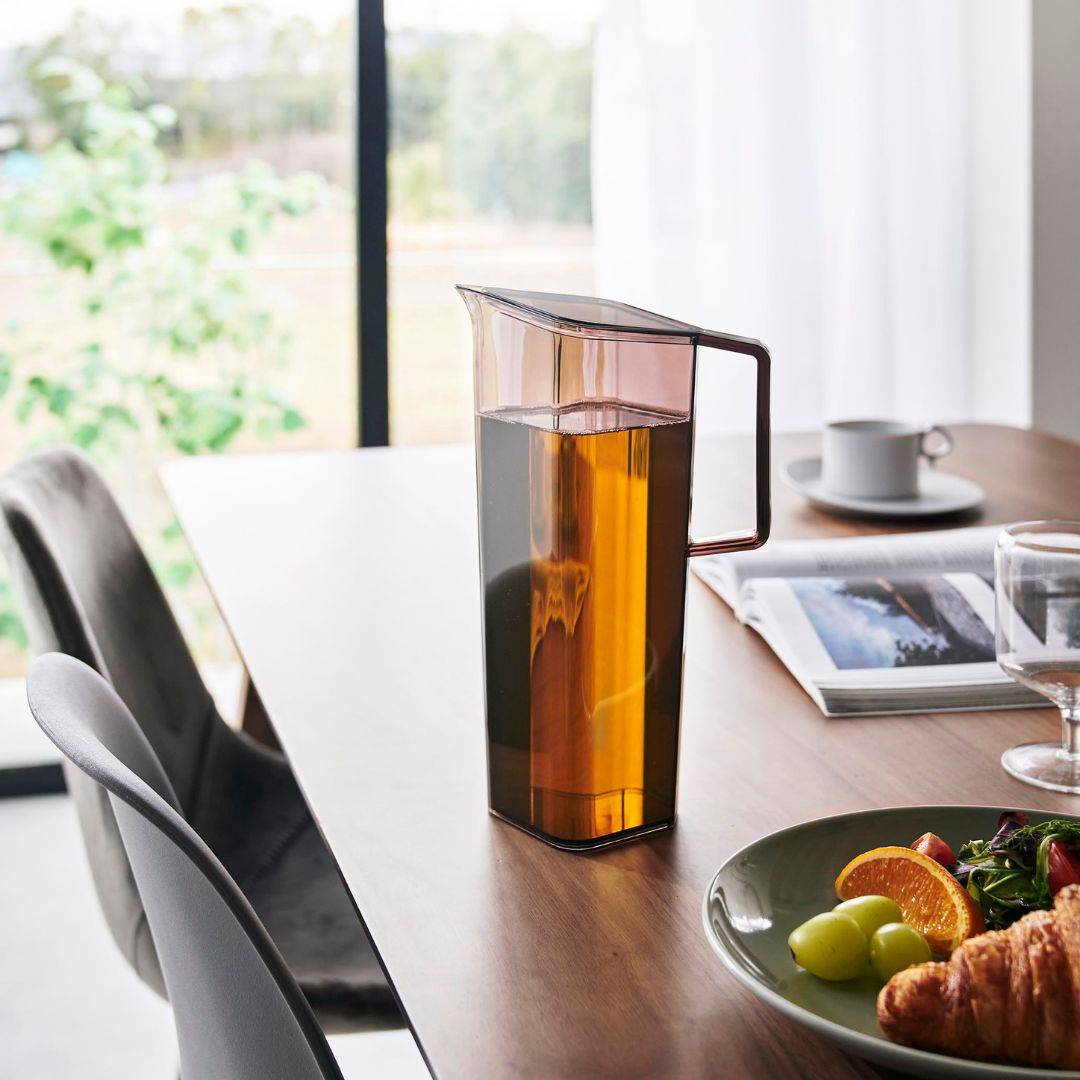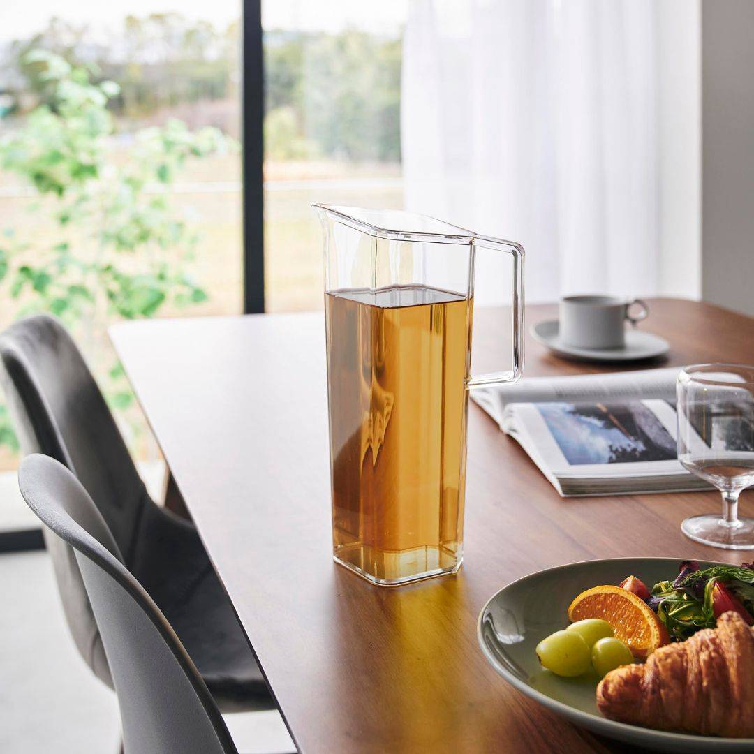 持ちやすく、注ぎやすく、収まりが良いスリムさ 安定して持ち運びやすい取っ手付きの冷水筒です。薄型設計ボトルは冷蔵庫の手前ドアポケットにもスッキリと収まりやすいスリムさです。ハンドル付きなので片手でも注ぎやすく、冷蔵庫への出し入れもスムーズ。キッチンや食卓に似合う、2色のカラーバリエーション カラーは、明るい印象のホワイト、スタイリッシュなブラックをご用意しました。キッチンや冷蔵庫、食卓にマッチし、ドリンクの色を邪魔しないシンプルなカラーリングです。お手持ちのテーブルウェアなどに合わせてお好みのカラーをお選びください。中が見やすく涼やかなクリアボトル 飲み物の色がよく見えるクリアなボトルは、2種類以上のドリンクをストックしていても欲しいドリンクがパッと一目でわかります。カットしたレモンやオレンジ、ミントを入れたフレーバーウォーターも、ボトルの見た目から楽しめます。液だれしにくい 斜め形状の注ぎ口 スリムなデザインで容量1.2Lと、食卓においておいても邪魔にならないサイズ感。注ぎ口が角に付いているので注ぎやすく、ゆるやかな斜め形状になっているから液だれしにくいのもうれしいポイント◎。少ないパーツで、お手入れしやすい工夫 フタと本体だけのシンプルな構造です。余計なパーツが無いからお手入れがラクちんです。手が奥まで入りやすい広口デザイン。食洗機もお使いいただけます。