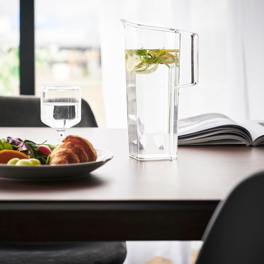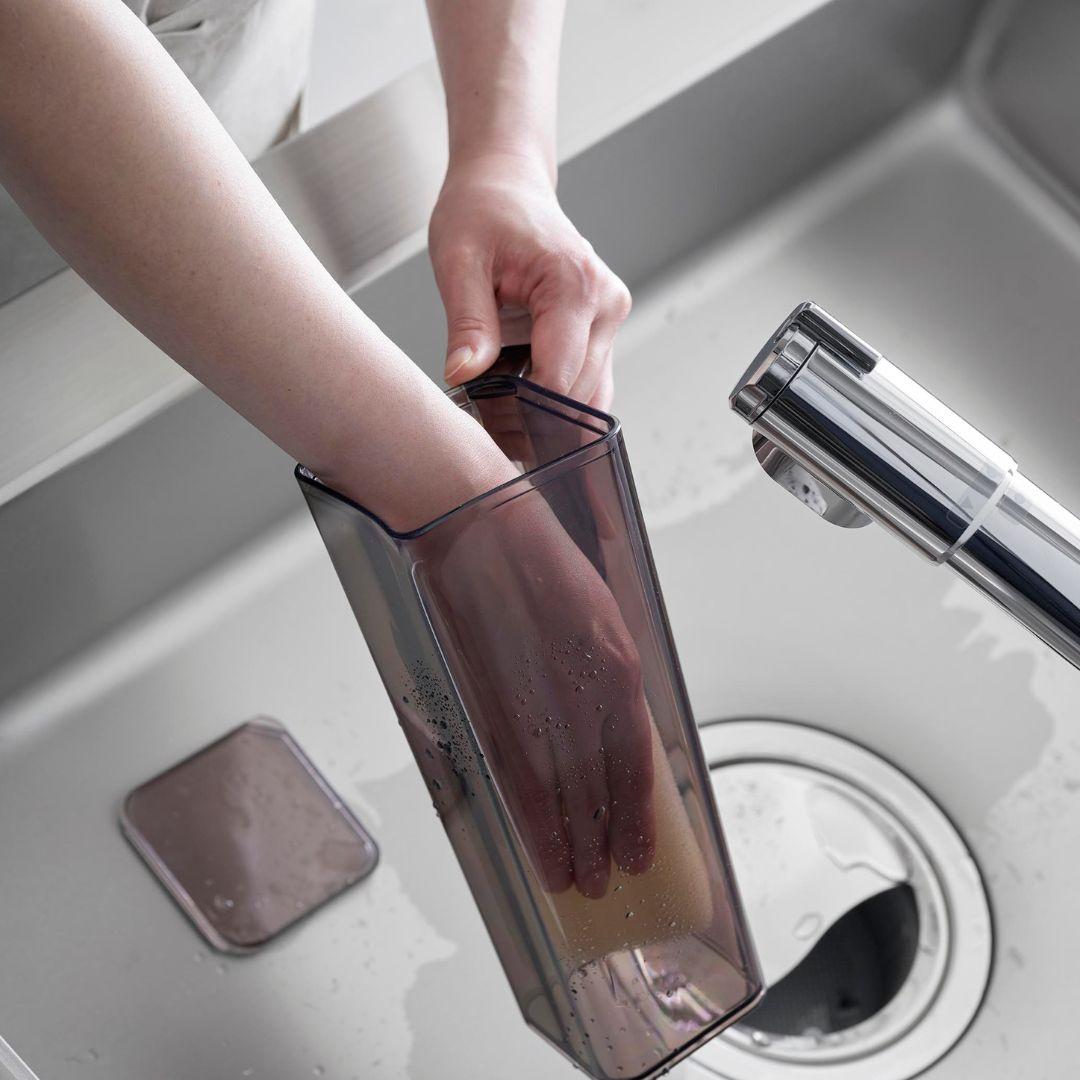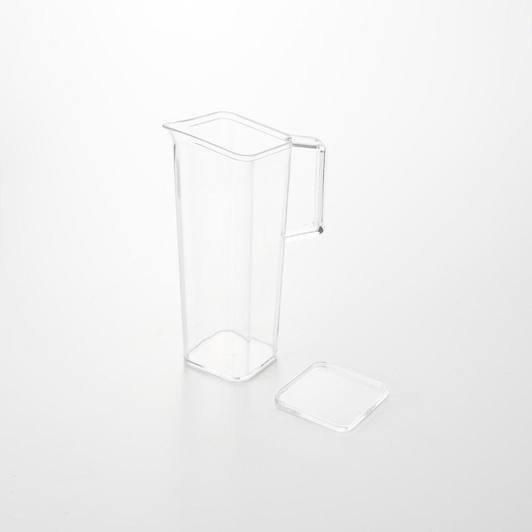 持ちやすく、注ぎやすく、収まりが良いスリムさ 安定して持ち運びやすい取っ手付きの冷水筒です。薄型設計ボトルは冷蔵庫の手前ドアポケットにもスッキリと収まりやすいスリムさです。ハンドル付きなので片手でも注ぎやすく、冷蔵庫への出し入れもスムーズ。キッチンや食卓に似合う、2色のカラーバリエーション カラーは、明るい印象のホワイト、スタイリッシュなブラックをご用意しました。キッチンや冷蔵庫、食卓にマッチし、ドリンクの色を邪魔しないシンプルなカラーリングです。お手持ちのテーブルウェアなどに合わせてお好みのカラーをお選びください。中が見やすく涼やかなクリアボトル 飲み物の色がよく見えるクリアなボトルは、2種類以上のドリンクをストックしていても欲しいドリンクがパッと一目でわかります。カットしたレモンやオレンジ、ミントを入れたフレーバーウォーターも、ボトルの見た目から楽しめます。液だれしにくい 斜め形状の注ぎ口 スリムなデザインで容量1.2Lと、食卓においておいても邪魔にならないサイズ感。注ぎ口が角に付いているので注ぎやすく、ゆるやかな斜め形状になっているから液だれしにくいのもうれしいポイント◎。少ないパーツで、お手入れしやすい工夫 フタと本体だけのシンプルな構造です。余計なパーツが無いからお手入れがラクちんです。手が奥まで入りやすい広口デザイン。食洗機もお使いいただけます。