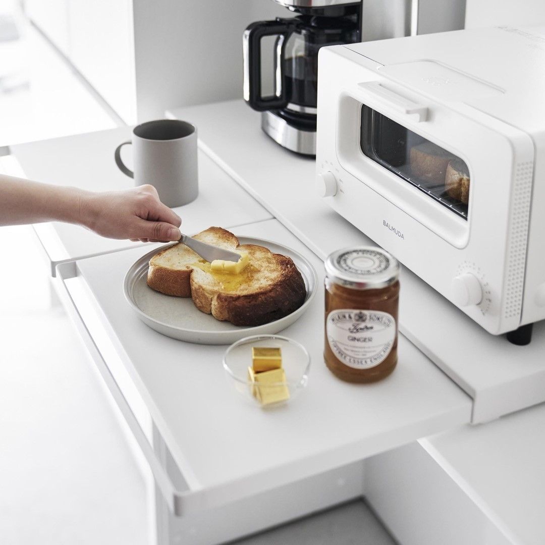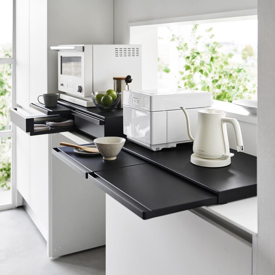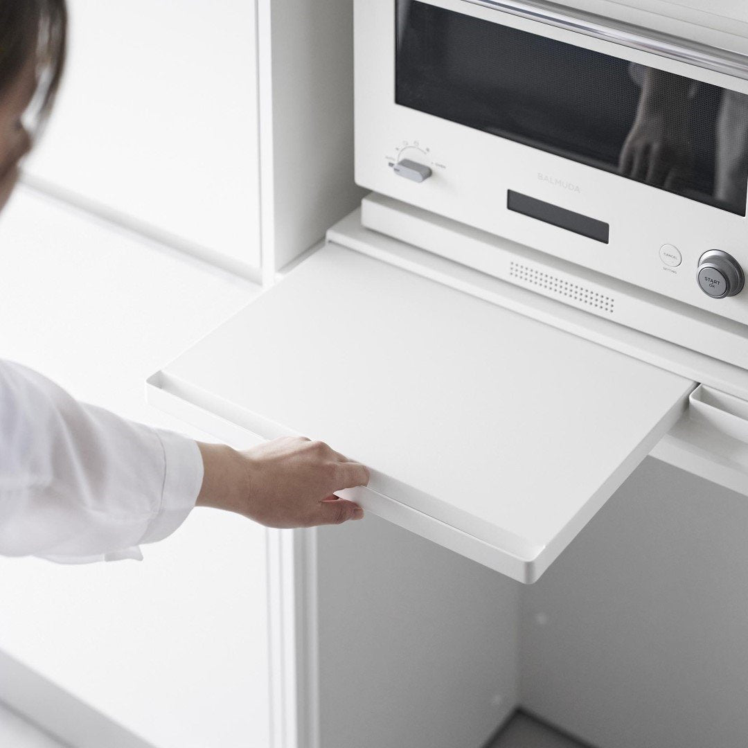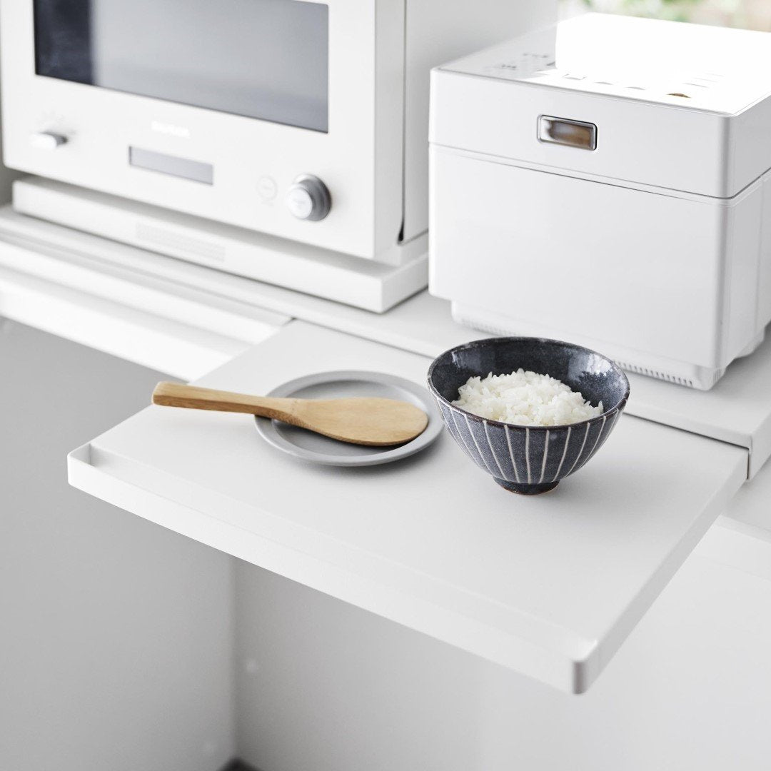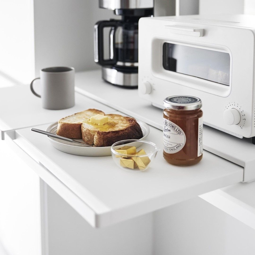 使うときだけ現れるスライドテーブルキッチン家電の下に設置することで、作業スペースが増設できるキッチンスライドテーブルです。必要なときだけ引き出して、使わないときはしまっておけるから作業効率が上がり邪魔になりません。キッチン空間にマッチする、2色のカラーバリエーションカラーは、清潔感のあるホワイト、スタイリッシュなブラックをご用意しました。キッチンの雰囲気に気に合わせてお好みのカラーをお選びください。炊飯器と電子レンジの下に設置炊飯器下に設置して、お茶碗に家族全員分のごはんをよそうときに作業台があると便利です。しゃもじ入れも一緒に置けて◎焼きあがったトーストにその場でバターを塗れば、熱々のパンがバターをじゅわーっと溶かして最高においしい状態が完成。パパッと食事を済ませちゃう。 簡易食卓に早変わりたまにはキッチンでササッと食事を済ませることも。そんなときはキッチン家電下スライドテーブルが簡易テーブルになるから、食べる場所に困りません。家事が忙しくて一息つきたいときも、スライドテーブルを引き出してドリンクのちょい置きに。横に広いテーブルで調理台代わりにも80cmのワイドサイズで、炊飯器と電子レンジを横に並べられるだけの広さがあります。スライドテーブルは最大25cm引き出せるから奥行きとしても十分です。手前のハンドルを引けばスムーズにテーブルを出し入れできます。時間とスペースを広くとる餃子づくりも、作業台が増やせれば作りやすくなります。