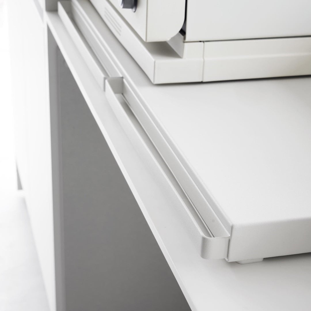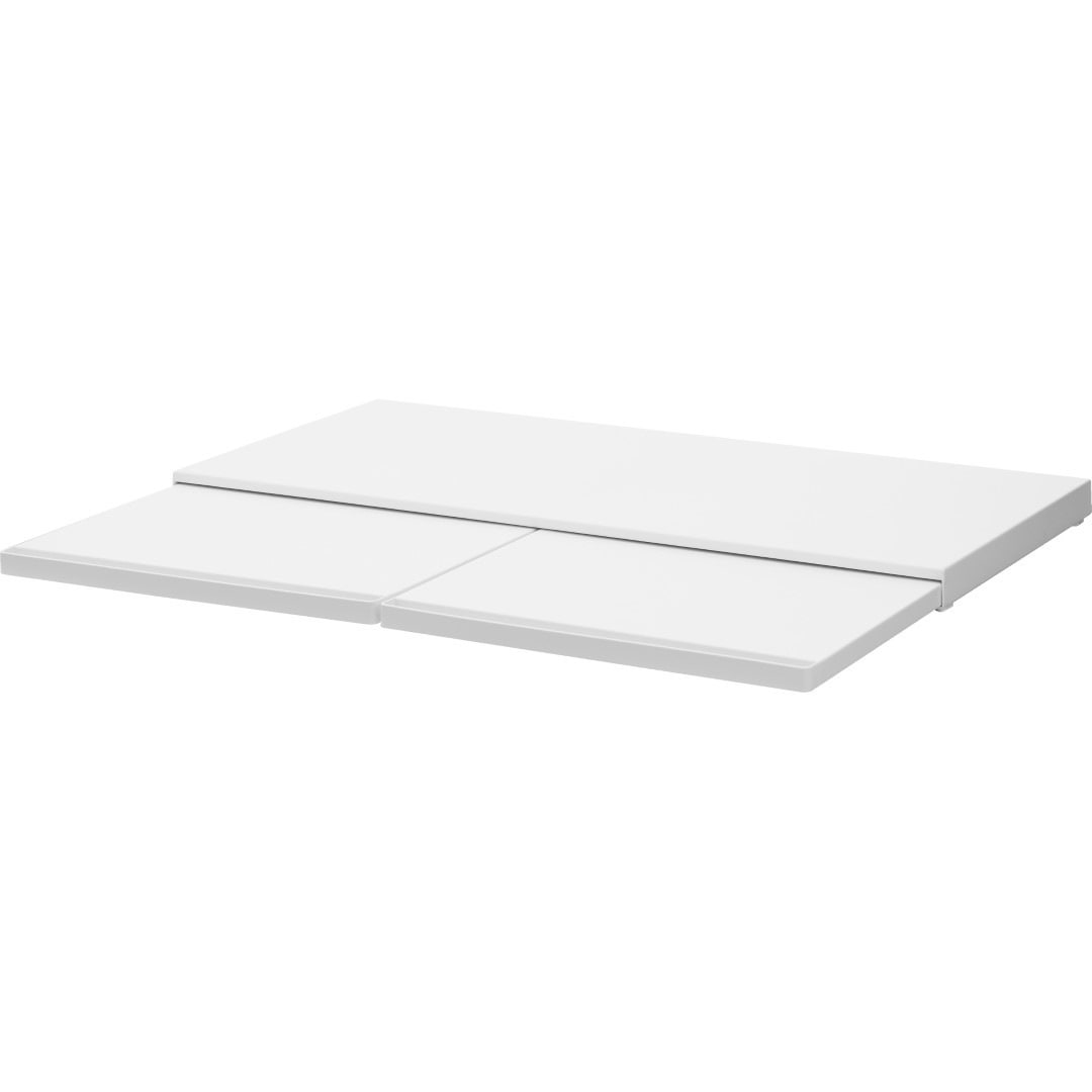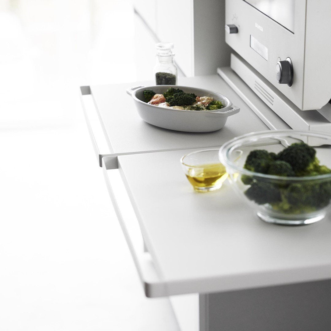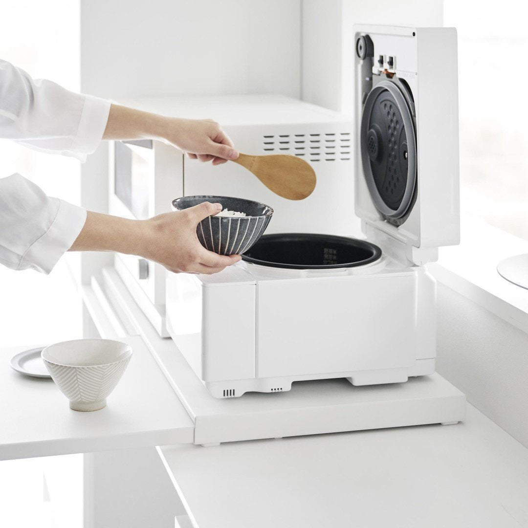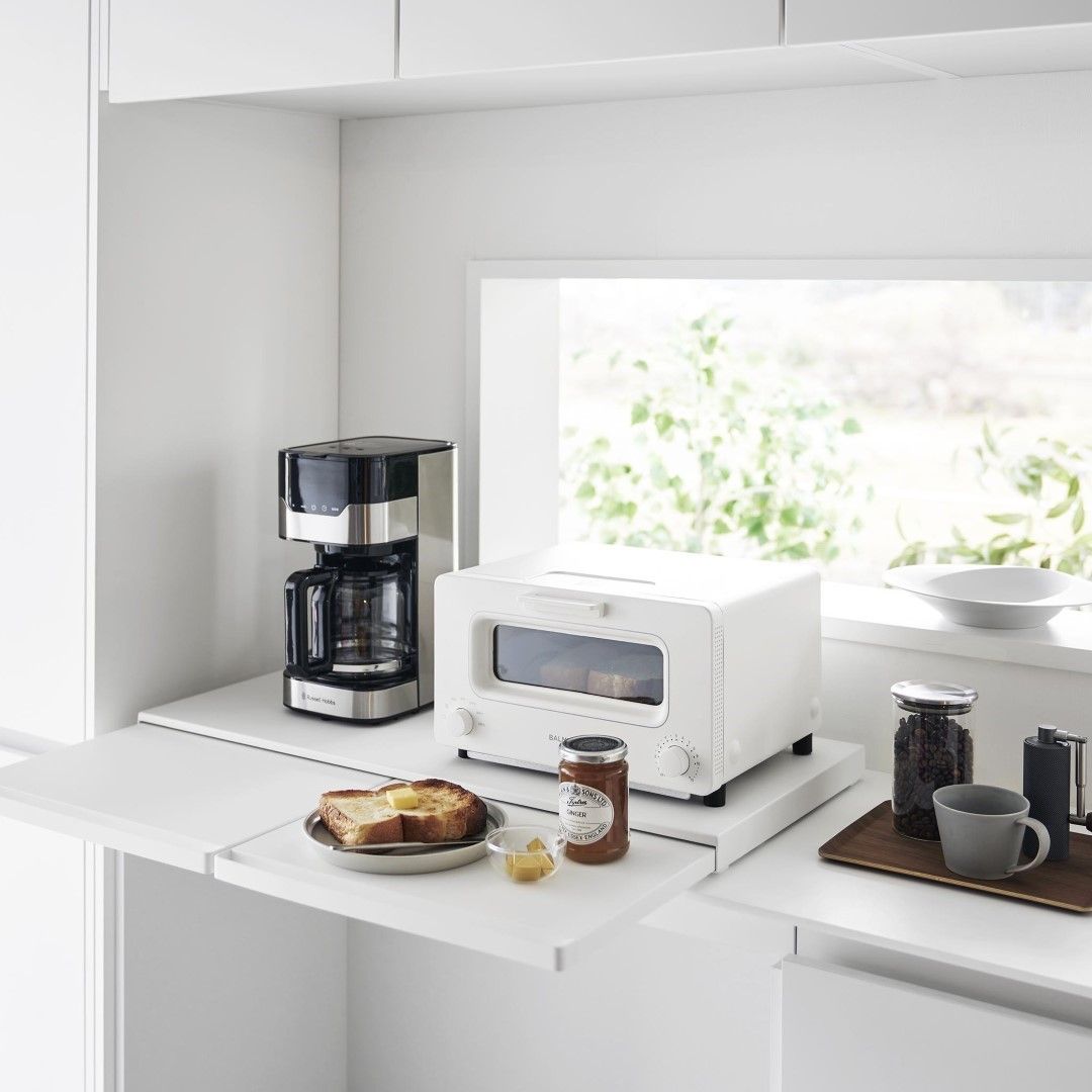 使うときだけ現れるスライドテーブルキッチン家電の下に設置することで、作業スペースが増設できるキッチンスライドテーブルです。必要なときだけ引き出して、使わないときはしまっておけるから作業効率が上がり邪魔になりません。キッチン空間にマッチする、2色のカラーバリエーションカラーは、清潔感のあるホワイト、スタイリッシュなブラックをご用意しました。キッチンの雰囲気に気に合わせてお好みのカラーをお選びください。炊飯器と電子レンジの下に設置炊飯器下に設置して、お茶碗に家族全員分のごはんをよそうときに作業台があると便利です。しゃもじ入れも一緒に置けて◎焼きあがったトーストにその場でバターを塗れば、熱々のパンがバターをじゅわーっと溶かして最高においしい状態が完成。パパッと食事を済ませちゃう。 簡易食卓に早変わりたまにはキッチンでササッと食事を済ませることも。そんなときはキッチン家電下スライドテーブルが簡易テーブルになるから、食べる場所に困りません。家事が忙しくて一息つきたいときも、スライドテーブルを引き出してドリンクのちょい置きに。横に広いテーブルで調理台代わりにも80cmのワイドサイズで、炊飯器と電子レンジを横に並べられるだけの広さがあります。スライドテーブルは最大25cm引き出せるから奥行きとしても十分です。手前のハンドルを引けばスムーズにテーブルを出し入れできます。時間とスペースを広くとる餃子づくりも、作業台が増やせれば作りやすくなります。