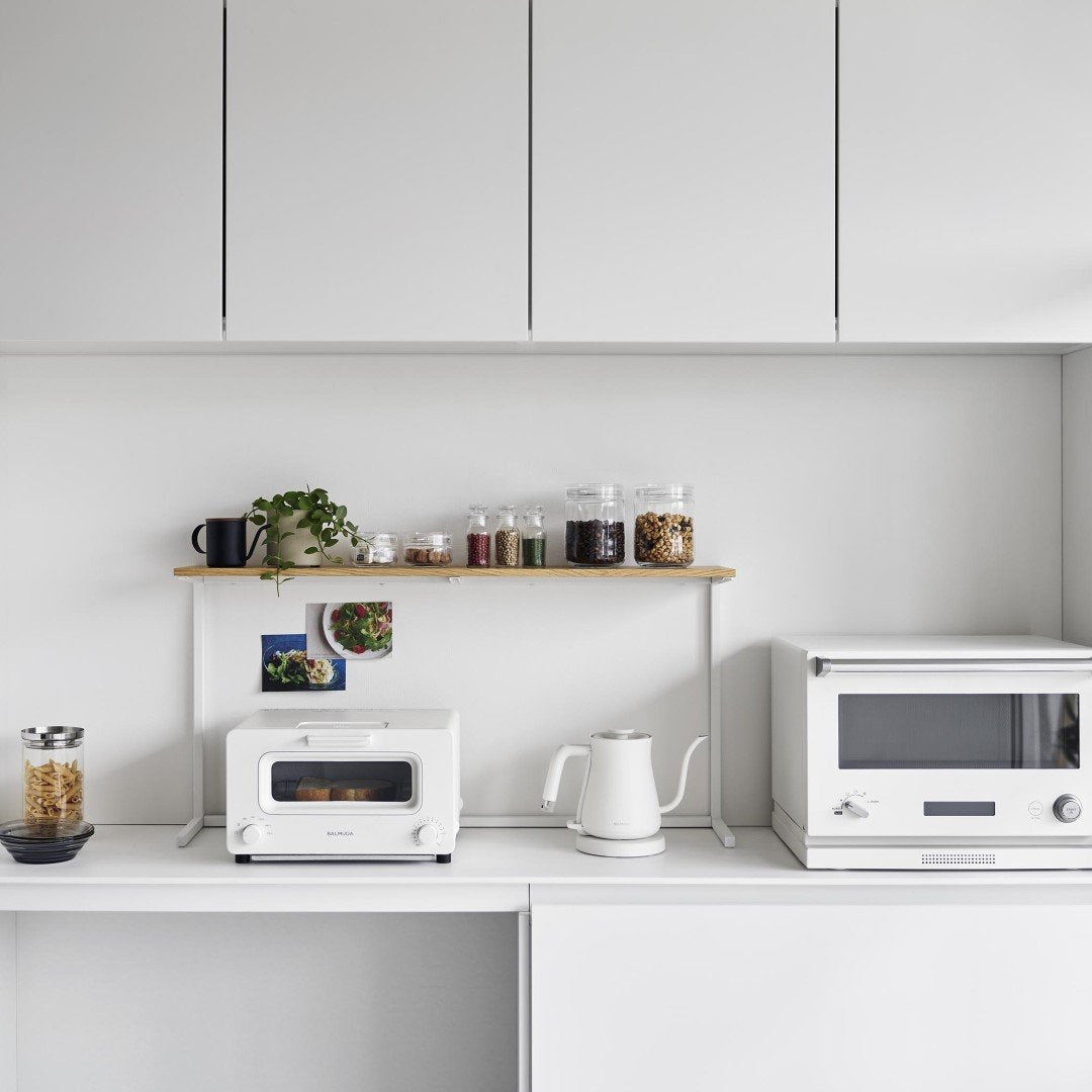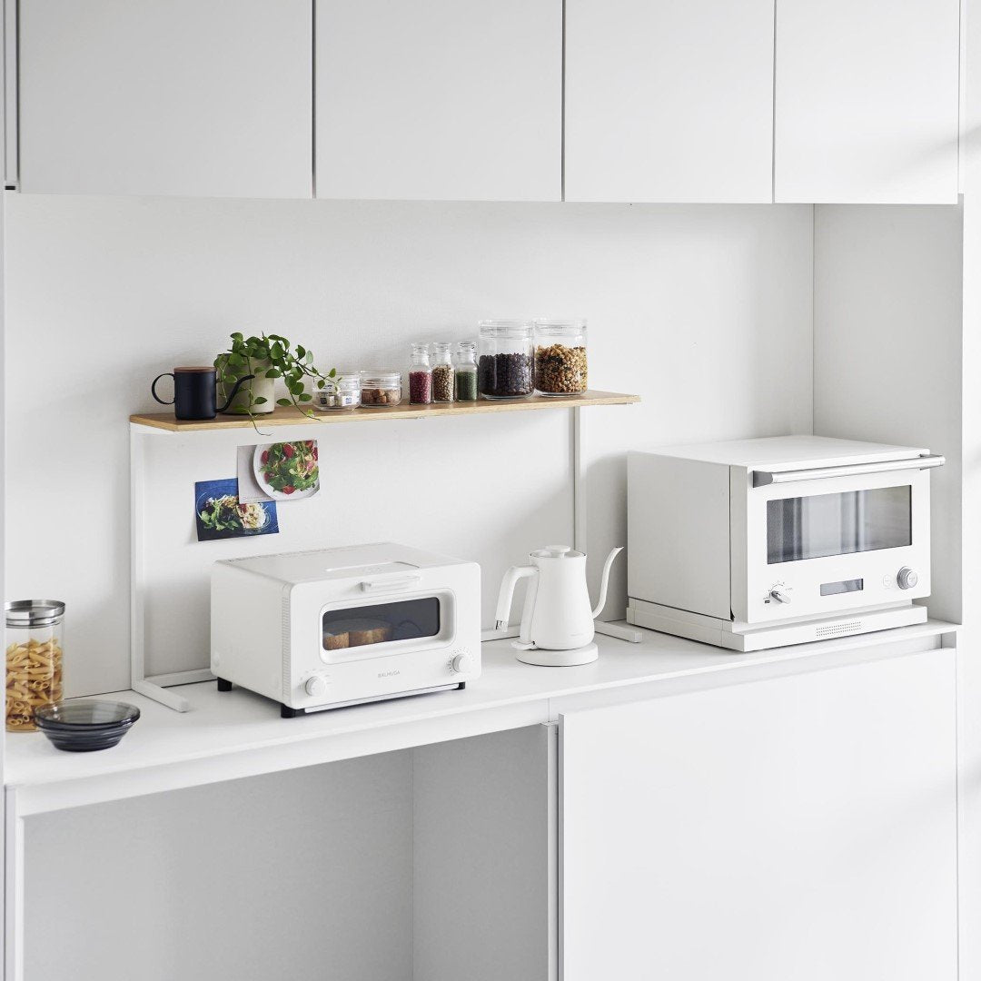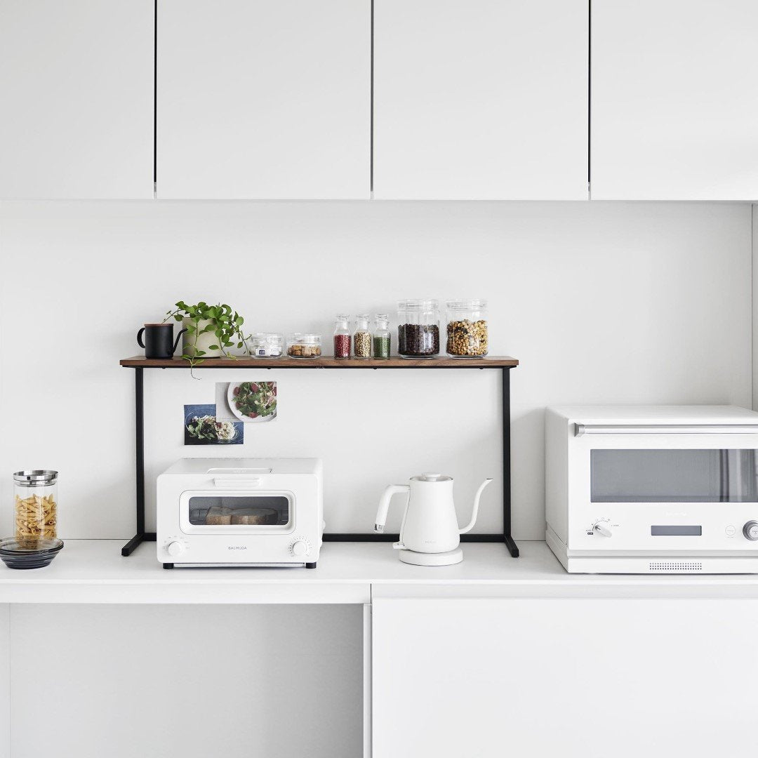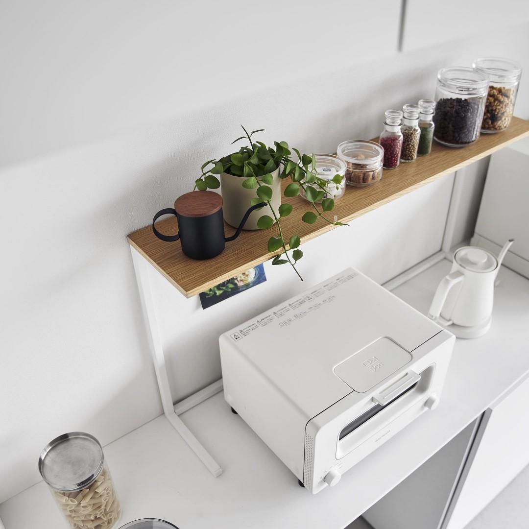 家電上のデッドスペースに収納棚を増設キッチンのカップボード上に置くだけで簡単に設置できるラックです。カップボードだけでなく、電子レンジなどのキッチン家電の上も有効活用できます。フレームの存在感が少ないデザインだから、キッチンによくなじみます。キッチン空間にマッチする、2色のカラーバリエーションカラーは、清潔感のあるホワイト、スタイリッシュなブラックをご用意しました。天然木の天板に、シンプルなモノトーンカラーのフレームの組み合わせです。キッチンの雰囲気に気に合わせてお好みのカラーをお選びください。木製天板とスチールの組合せがおしゃれ温かみのある木製の天板に、スチールという異なる素材の組み合わせが、互いの魅力をより引き立てています。粉体塗装を施されたスチール製のフレームは、高級感のあるマットな質感で華奢な印象に仕上がっています。ティータイムセットを並べて見た目も華やかに奥行きが18cmあるので、食器やキッチンツールをディスプレイしながら収納できます。多種多様なティーバッグとお菓子が入ったミニバスケットを並べれば、ティータイム用のアイテムをストックする棚に早変わり。壁へダメージを与えずに収納棚を増やせる耐荷重は7kgあり丈夫です。壁にネジを打ち込むことなく棚ができるのでお手軽です。壁にネジ穴を空けなくていいので、賃貸のお家に住んでいるご家庭や、新築のお家など、極力壁面へのダメージを少なくしたいと考えている方にもおすすめです。