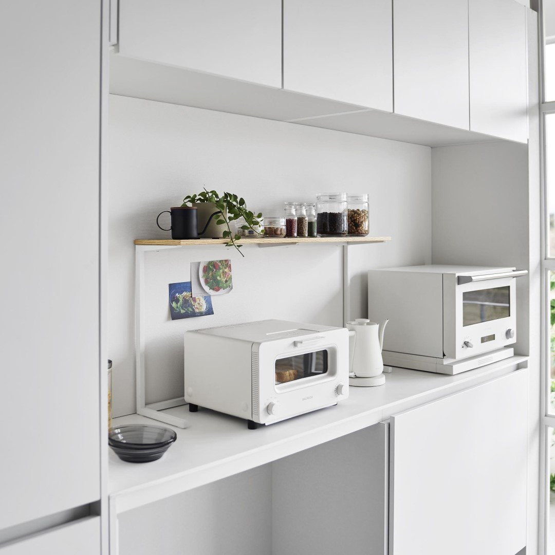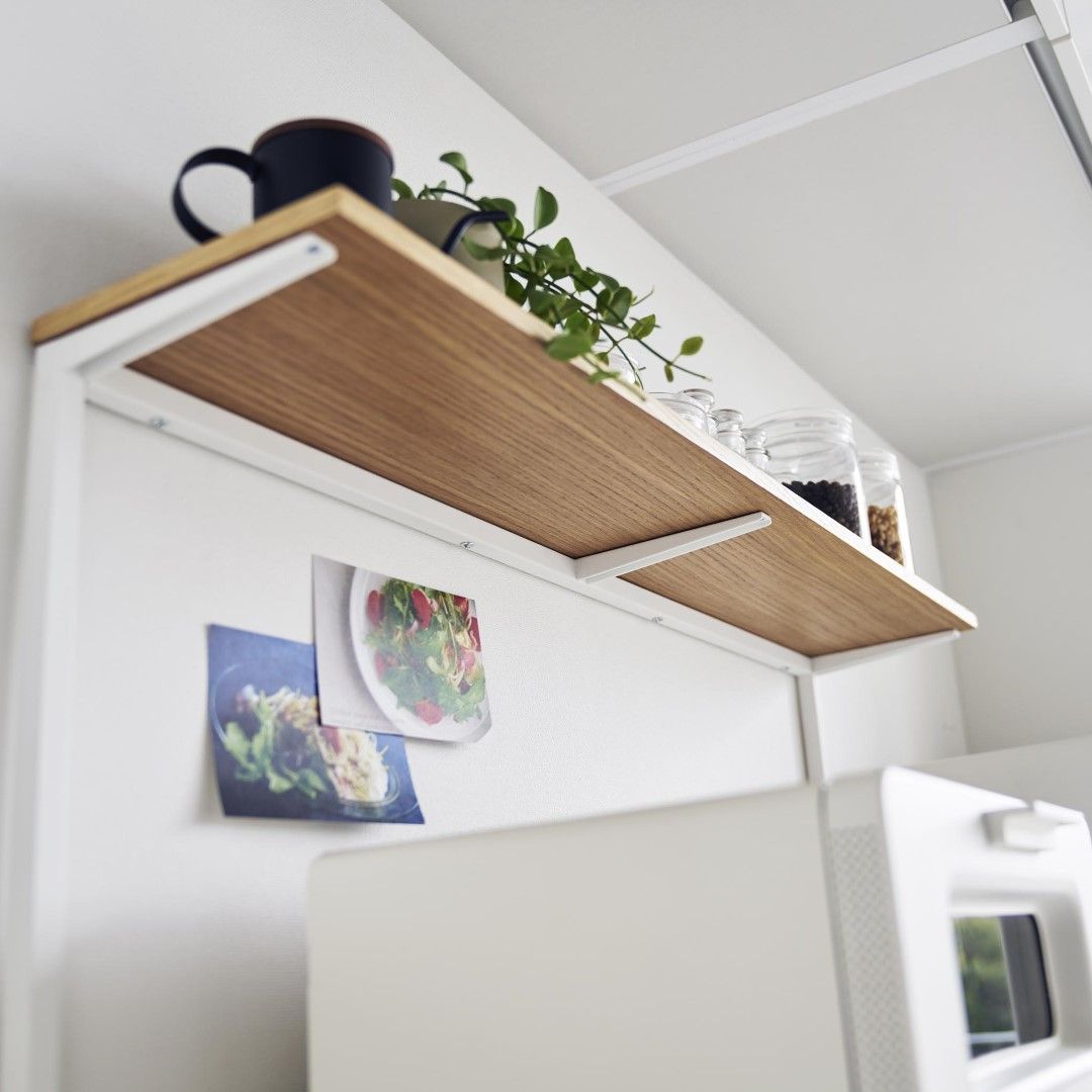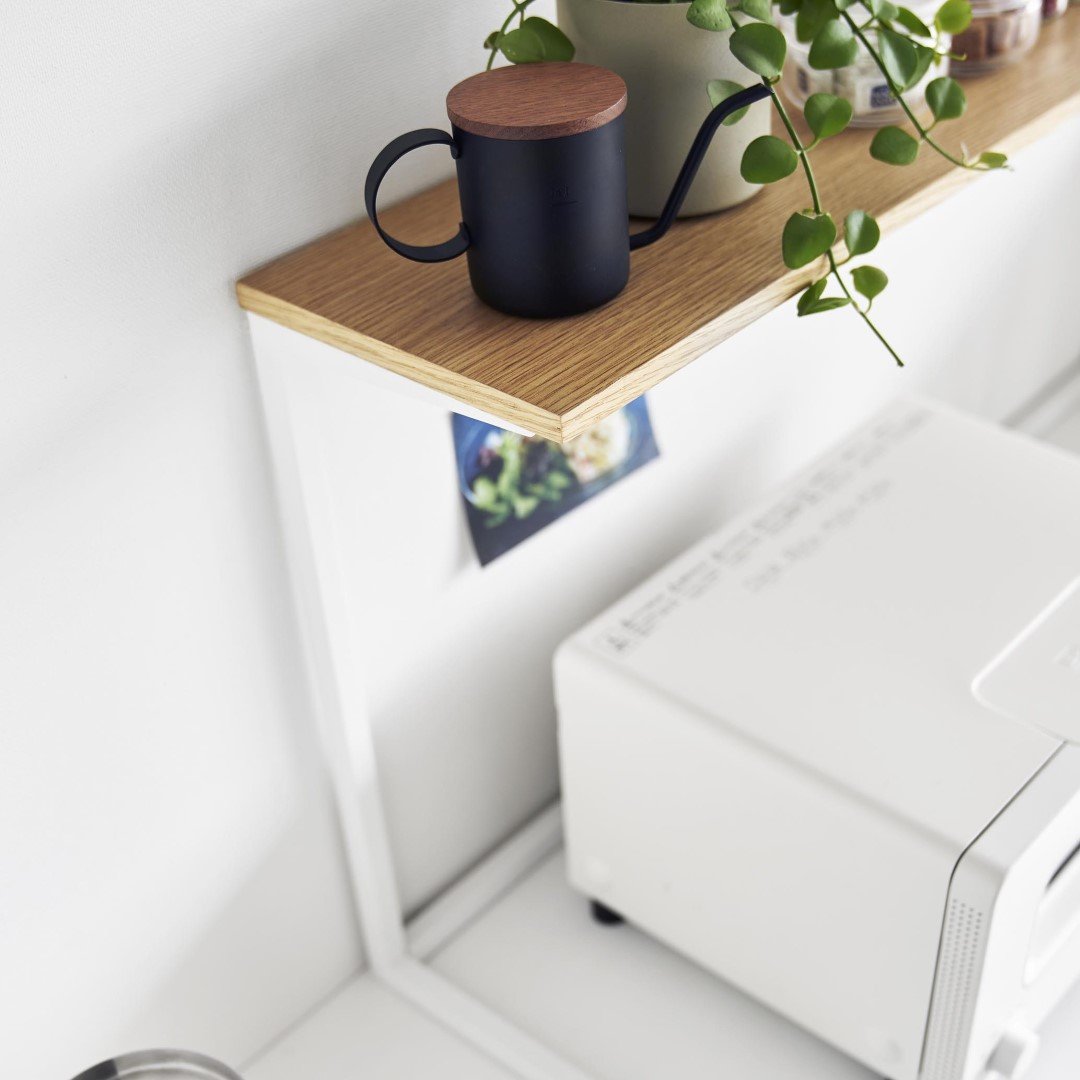 家電上のデッドスペースに収納棚を増設キッチンのカップボード上に置くだけで簡単に設置できるラックです。カップボードだけでなく、電子レンジなどのキッチン家電の上も有効活用できます。フレームの存在感が少ないデザインだから、キッチンによくなじみます。キッチン空間にマッチする、2色のカラーバリエーションカラーは、清潔感のあるホワイト、スタイリッシュなブラックをご用意しました。天然木の天板に、シンプルなモノトーンカラーのフレームの組み合わせです。キッチンの雰囲気に気に合わせてお好みのカラーをお選びください。木製天板とスチールの組合せがおしゃれ温かみのある木製の天板に、スチールという異なる素材の組み合わせが、互いの魅力をより引き立てています。粉体塗装を施されたスチール製のフレームは、高級感のあるマットな質感で華奢な印象に仕上がっています。ティータイムセットを並べて見た目も華やかに奥行きが18cmあるので、食器やキッチンツールをディスプレイしながら収納できます。多種多様なティーバッグとお菓子が入ったミニバスケットを並べれば、ティータイム用のアイテムをストックする棚に早変わり。壁へダメージを与えずに収納棚を増やせる耐荷重は7kgあり丈夫です。壁にネジを打ち込むことなく棚ができるのでお手軽です。壁にネジ穴を空けなくていいので、賃貸のお家に住んでいるご家庭や、新築のお家など、極力壁面へのダメージを少なくしたいと考えている方にもおすすめです。