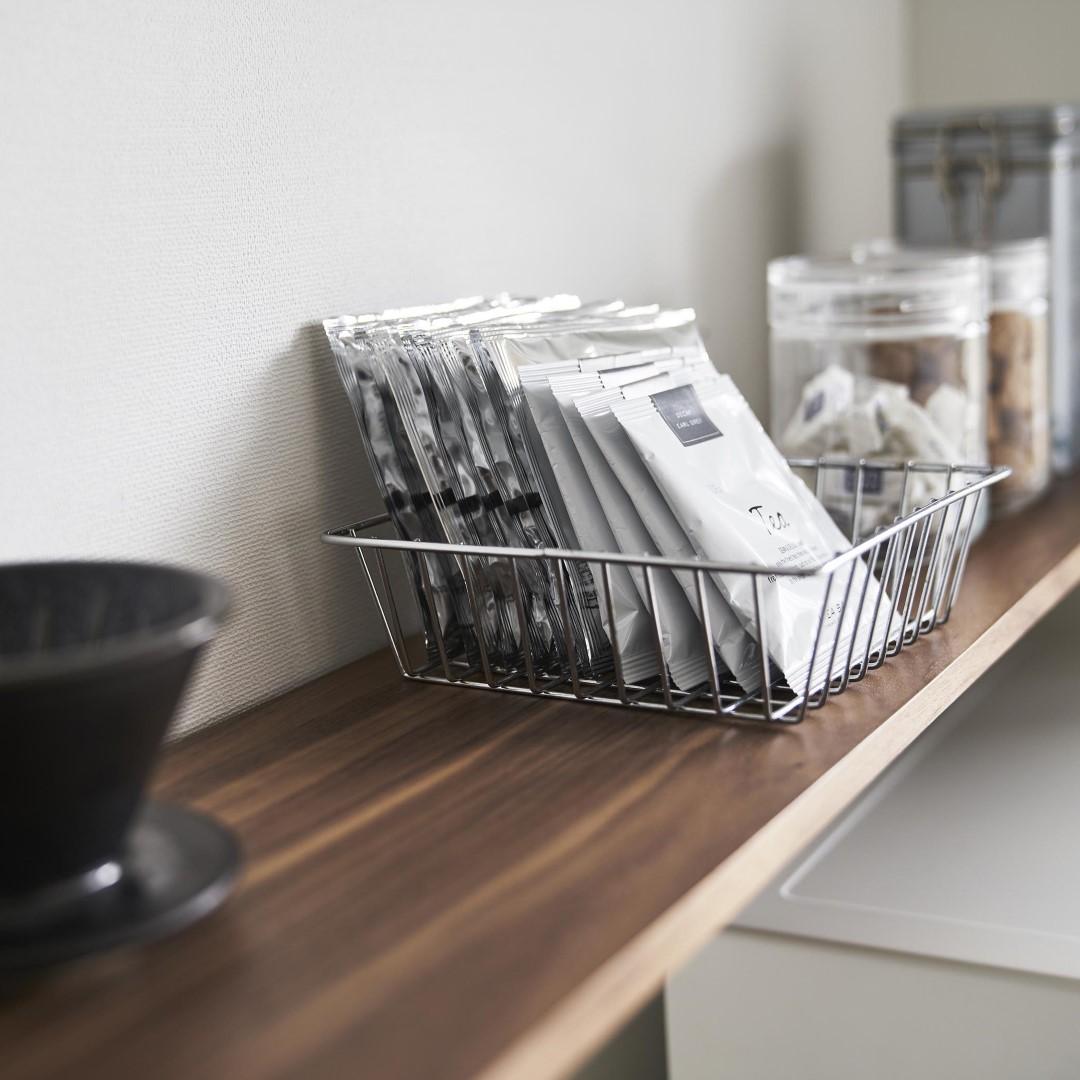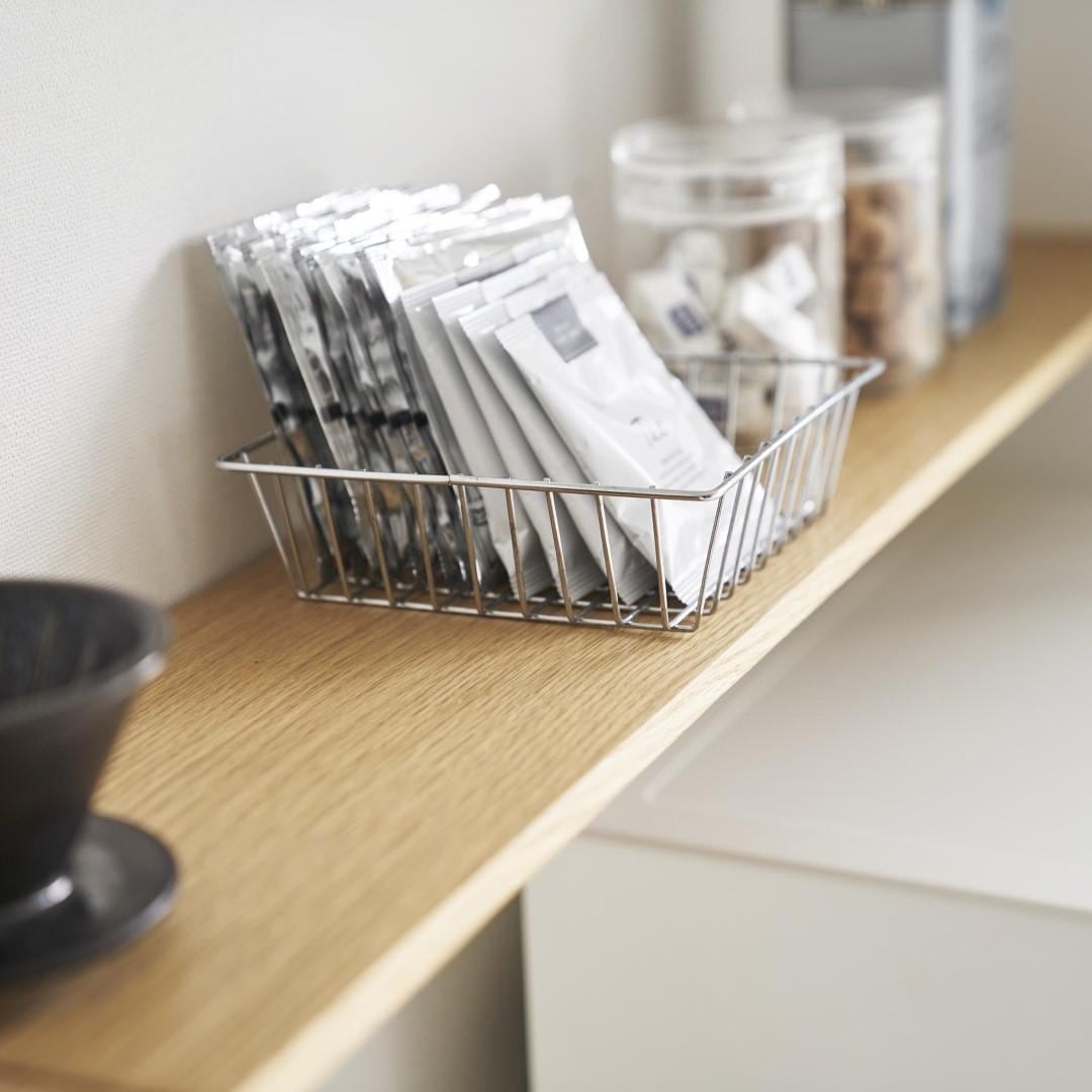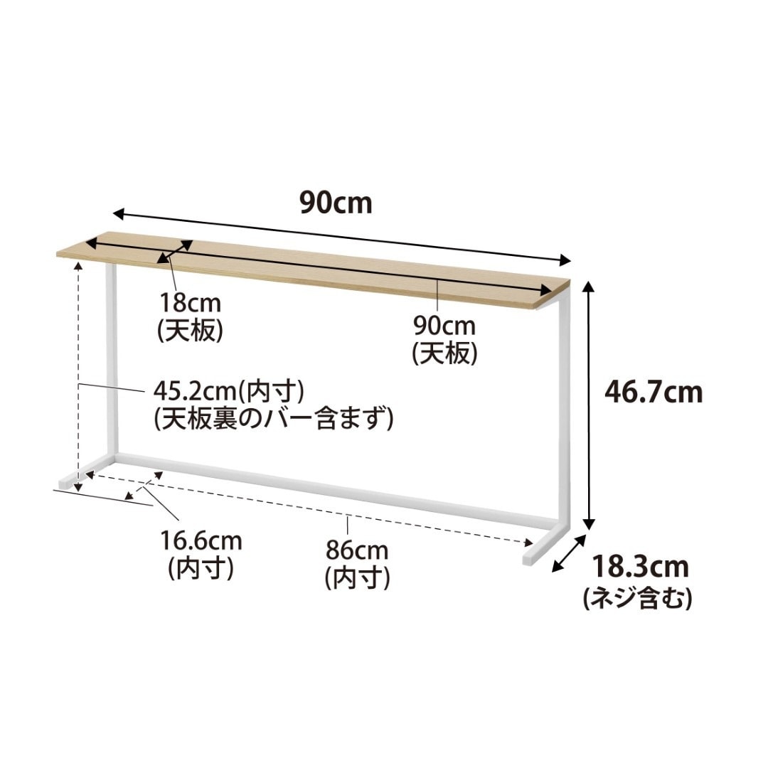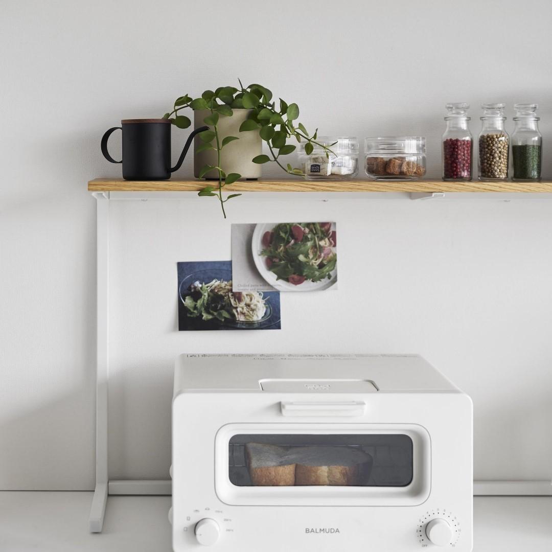 家電上のデッドスペースに収納棚を増設キッチンのカップボード上に置くだけで簡単に設置できるラックです。カップボードだけでなく、電子レンジなどのキッチン家電の上も有効活用できます。フレームの存在感が少ないデザインだから、キッチンによくなじみます。キッチン空間にマッチする、2色のカラーバリエーションカラーは、清潔感のあるホワイト、スタイリッシュなブラックをご用意しました。天然木の天板に、シンプルなモノトーンカラーのフレームの組み合わせです。キッチンの雰囲気に気に合わせてお好みのカラーをお選びください。木製天板とスチールの組合せがおしゃれ温かみのある木製の天板に、スチールという異なる素材の組み合わせが、互いの魅力をより引き立てています。粉体塗装を施されたスチール製のフレームは、高級感のあるマットな質感で華奢な印象に仕上がっています。ティータイムセットを並べて見た目も華やかに奥行きが18cmあるので、食器やキッチンツールをディスプレイしながら収納できます。多種多様なティーバッグとお菓子が入ったミニバスケットを並べれば、ティータイム用のアイテムをストックする棚に早変わり。壁へダメージを与えずに収納棚を増やせる耐荷重は7kgあり丈夫です。壁にネジを打ち込むことなく棚ができるのでお手軽です。壁にネジ穴を空けなくていいので、賃貸のお家に住んでいるご家庭や、新築のお家など、極力壁面へのダメージを少なくしたいと考えている方にもおすすめです。