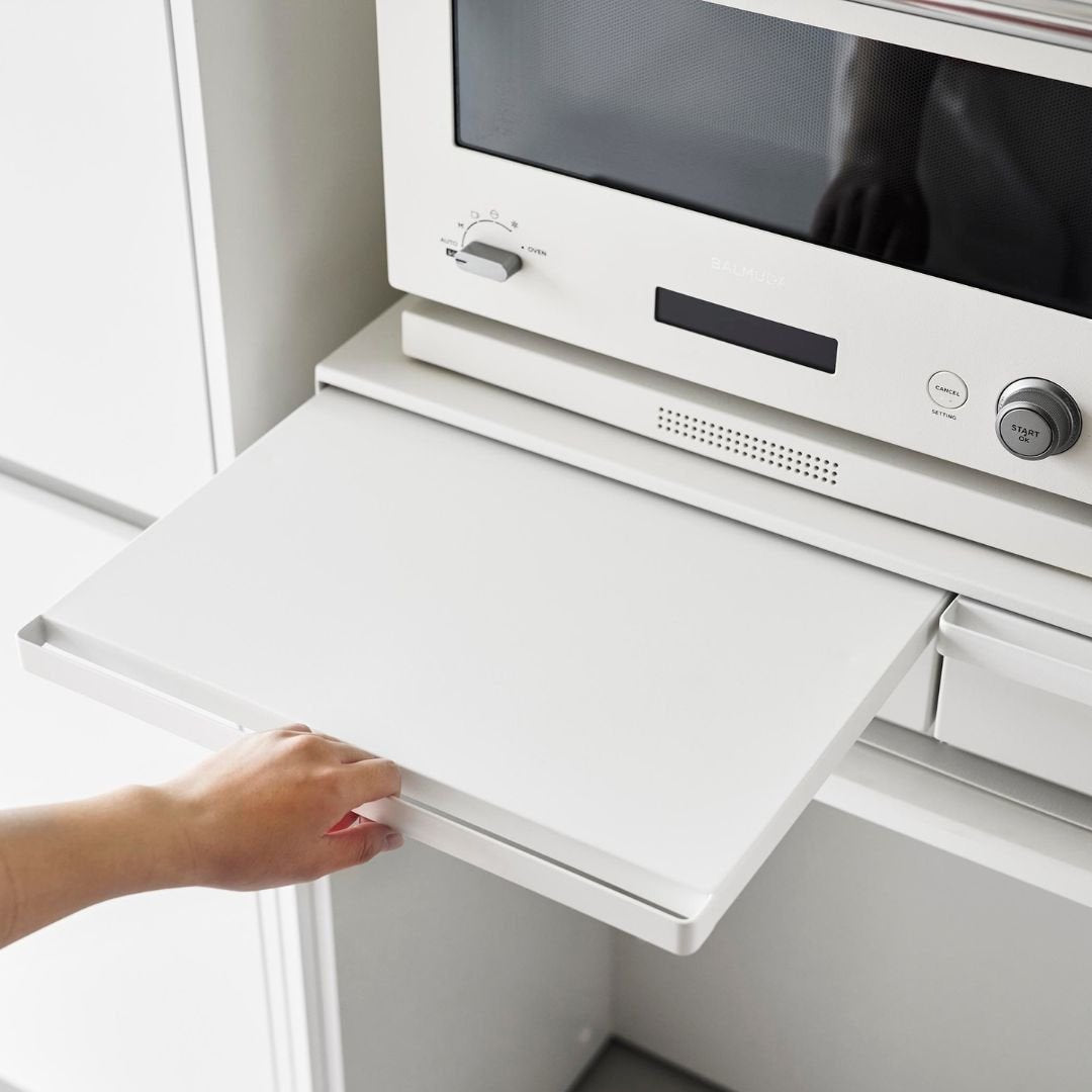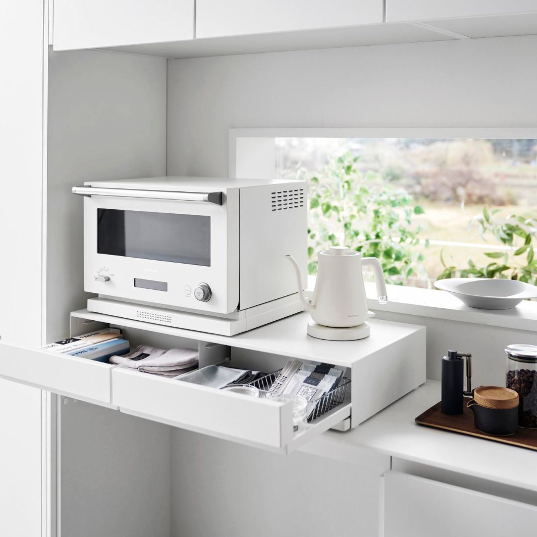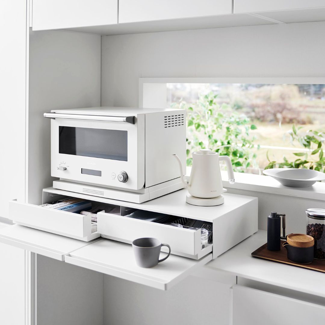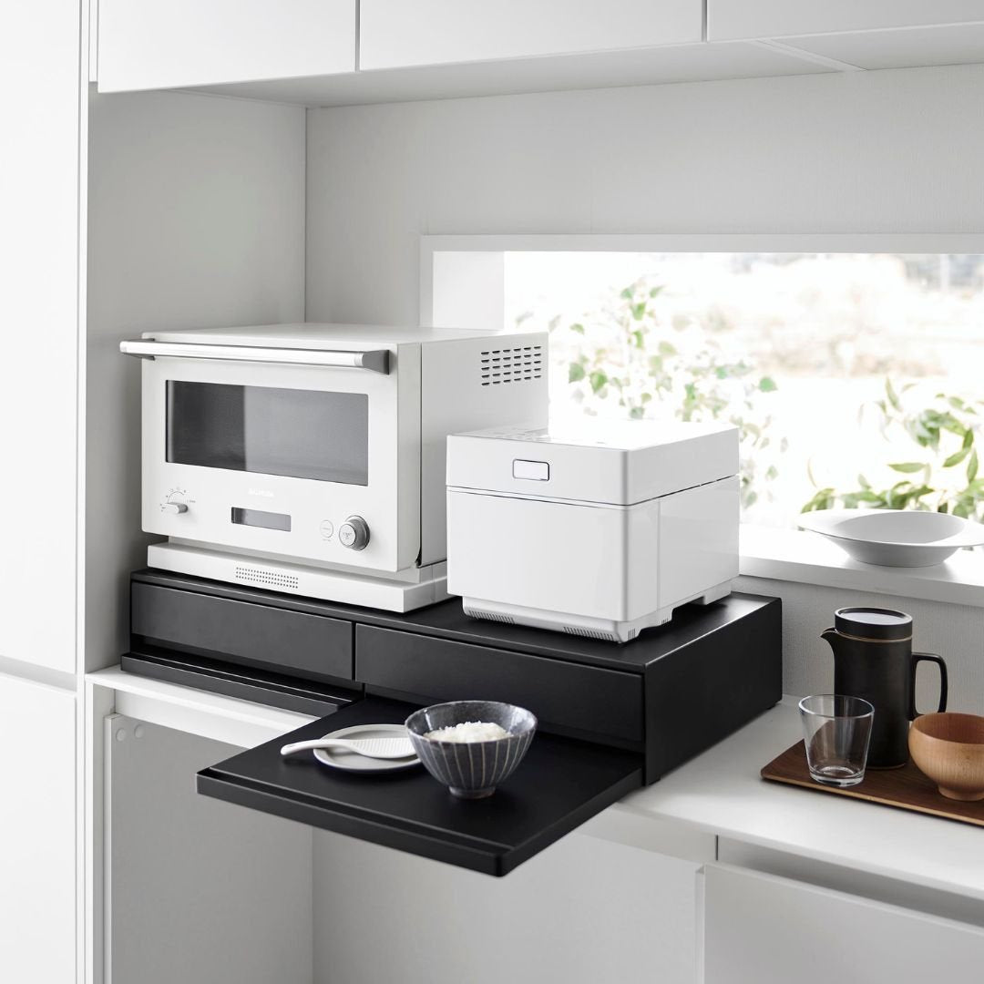 キッチン家電下を活用して家事効率アップ。 レンジやオーブンなどのキッチン家電下に設置できる引き出し&スライドテーブルに、幅80cmのワイドタイプの登場です。家電を置いてしまうと料理の一時置きできるスペースがなくなることも。引き出しにはラップやミトンなどのキッチンツール収納に、スライドテーブルを引き出せば、温め後の料理を一時置きできるスペースが確保できます。キッチンに馴染む2色のカラーバリエーション カラーはキッチン家電にもあわせやすいホワイトとブラックの2種類からお選びいただけます。レンジ、オーブントースター、炊飯器などの家電に合わせたり、カップボードに合わせて選択するのも◎。料理の仕上げはスライドテーブルで トースト、温め後の料理はスライドテーブルに乗せて仕上げを。わざわざテーブルに移動しなくてもキッチンで完結すれば調味料の後片付けも楽に。カップボードにフリースペースが確保できない場合にも便利です。80cmのワイドサイズで広々使え電子レンジと炊飯器を並べて置けるサイズ感。引出しの位置を入れ替え可能 引出しとスライドテーブルの位置は上下入れ替えて使用することが可能です。スライドテーブルを上段にすれば、引き出しを引き出したまま使用することができて便利。 引き出しを上にした場合は、レンジなどの扉があたらないメリットも。使用する頻度などに合わせて位置を変えるのも◎。引き出しの高さは9cmあるのでカトラリーやラップ類をたくさん収納できます。お手入れ楽なスチール素材 本体はスチール素材で汚れがついても簡単にふき取りができます。汚れが染みついたりしないのでいつでも清潔に保てます。