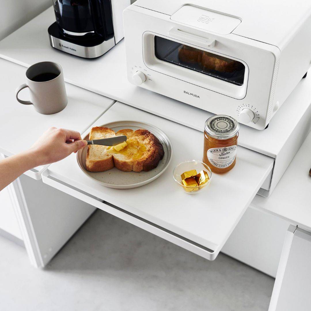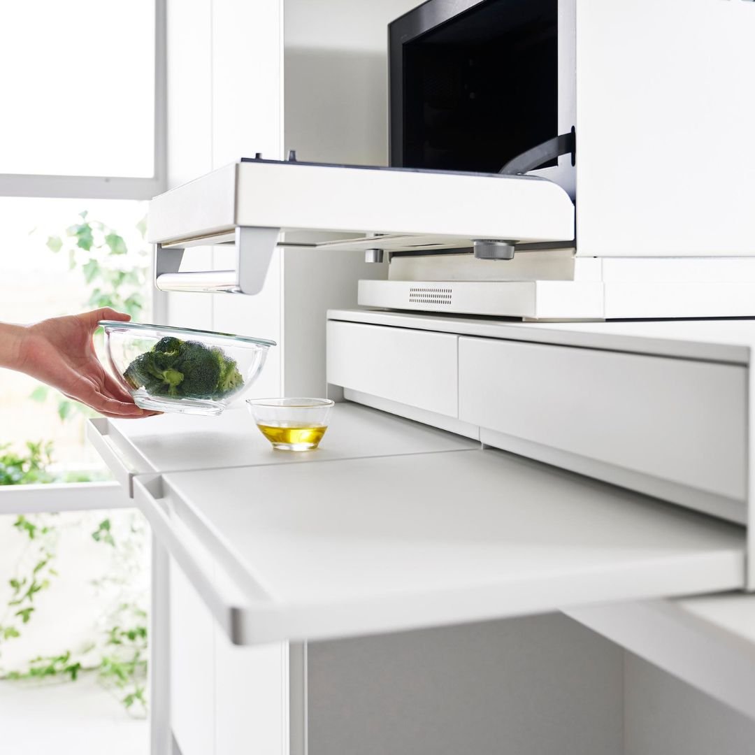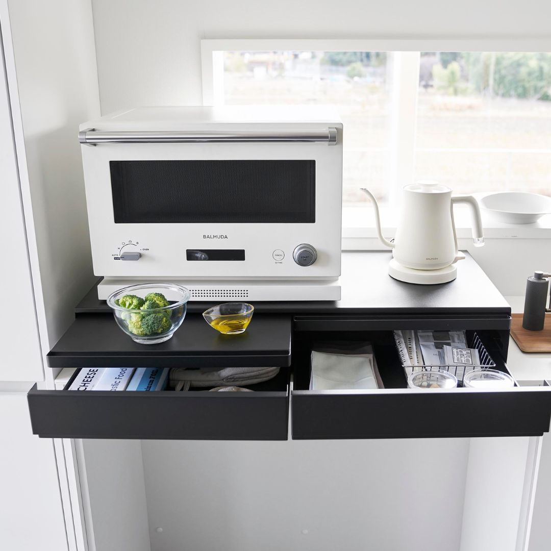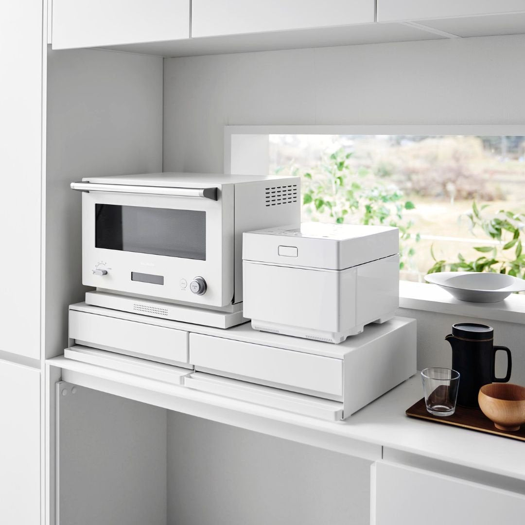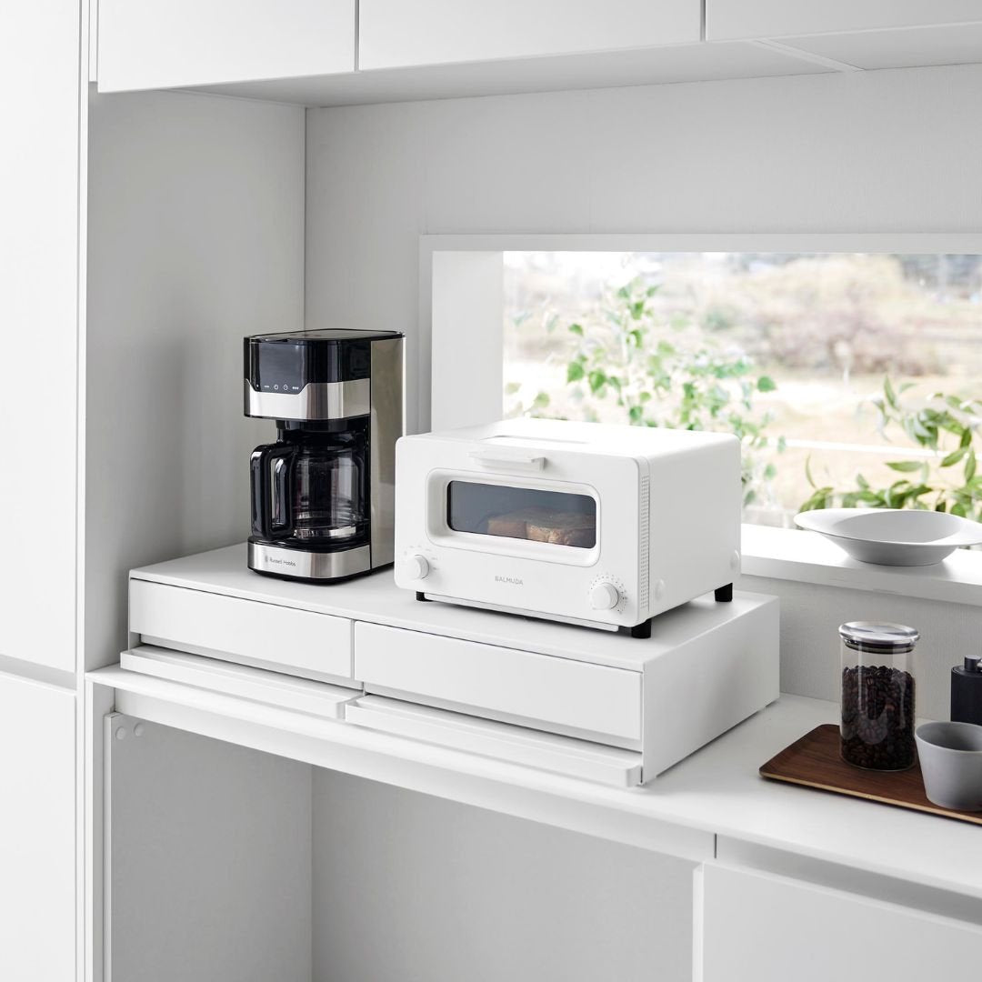 キッチン家電下を活用して家事効率アップ。 レンジやオーブンなどのキッチン家電下に設置できる引き出し&スライドテーブルに、幅80cmのワイドタイプの登場です。家電を置いてしまうと料理の一時置きできるスペースがなくなることも。引き出しにはラップやミトンなどのキッチンツール収納に、スライドテーブルを引き出せば、温め後の料理を一時置きできるスペースが確保できます。キッチンに馴染む2色のカラーバリエーション カラーはキッチン家電にもあわせやすいホワイトとブラックの2種類からお選びいただけます。レンジ、オーブントースター、炊飯器などの家電に合わせたり、カップボードに合わせて選択するのも◎。料理の仕上げはスライドテーブルで トースト、温め後の料理はスライドテーブルに乗せて仕上げを。わざわざテーブルに移動しなくてもキッチンで完結すれば調味料の後片付けも楽に。カップボードにフリースペースが確保できない場合にも便利です。80cmのワイドサイズで広々使え電子レンジと炊飯器を並べて置けるサイズ感。引出しの位置を入れ替え可能 引出しとスライドテーブルの位置は上下入れ替えて使用することが可能です。スライドテーブルを上段にすれば、引き出しを引き出したまま使用することができて便利。 引き出しを上にした場合は、レンジなどの扉があたらないメリットも。使用する頻度などに合わせて位置を変えるのも◎。引き出しの高さは9cmあるのでカトラリーやラップ類をたくさん収納できます。お手入れ楽なスチール素材 本体はスチール素材で汚れがついても簡単にふき取りができます。汚れが染みついたりしないのでいつでも清潔に保てます。
