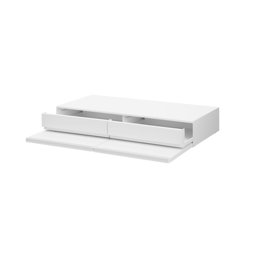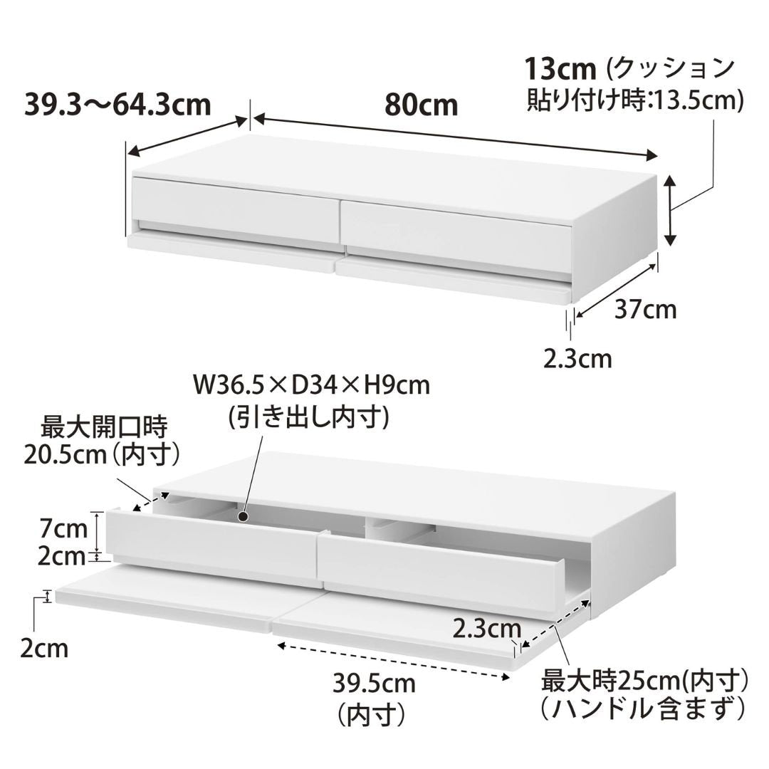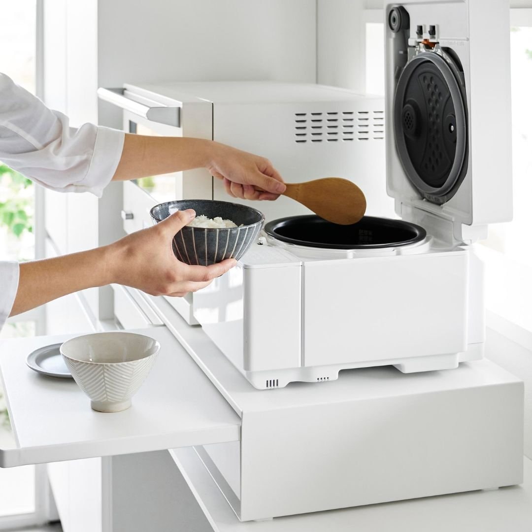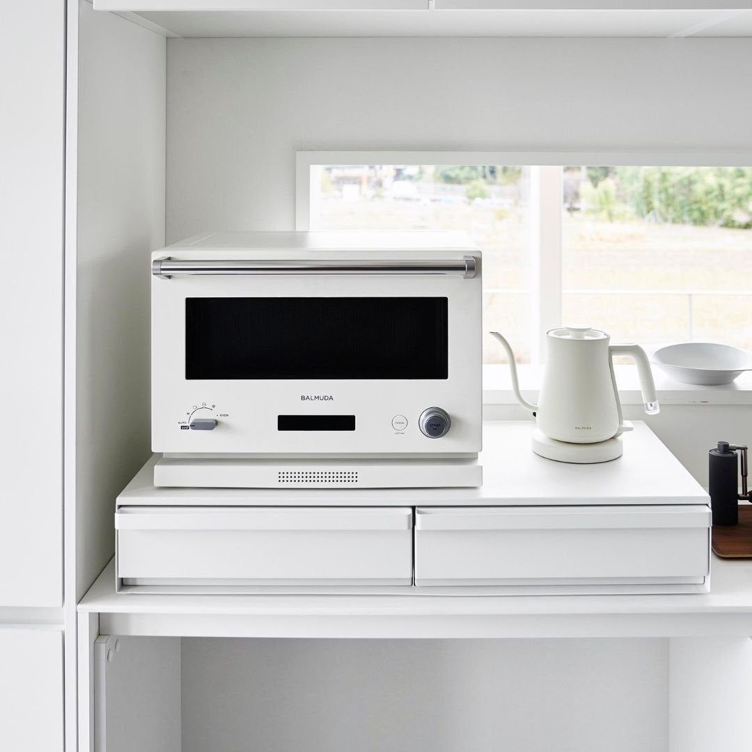 キッチン家電下を活用して家事効率アップ。 レンジやオーブンなどのキッチン家電下に設置できる引き出し&スライドテーブルに、幅80cmのワイドタイプの登場です。家電を置いてしまうと料理の一時置きできるスペースがなくなることも。引き出しにはラップやミトンなどのキッチンツール収納に、スライドテーブルを引き出せば、温め後の料理を一時置きできるスペースが確保できます。キッチンに馴染む2色のカラーバリエーション カラーはキッチン家電にもあわせやすいホワイトとブラックの2種類からお選びいただけます。レンジ、オーブントースター、炊飯器などの家電に合わせたり、カップボードに合わせて選択するのも◎。料理の仕上げはスライドテーブルで トースト、温め後の料理はスライドテーブルに乗せて仕上げを。わざわざテーブルに移動しなくてもキッチンで完結すれば調味料の後片付けも楽に。カップボードにフリースペースが確保できない場合にも便利です。80cmのワイドサイズで広々使え電子レンジと炊飯器を並べて置けるサイズ感。引出しの位置を入れ替え可能 引出しとスライドテーブルの位置は上下入れ替えて使用することが可能です。スライドテーブルを上段にすれば、引き出しを引き出したまま使用することができて便利。 引き出しを上にした場合は、レンジなどの扉があたらないメリットも。使用する頻度などに合わせて位置を変えるのも◎。引き出しの高さは9cmあるのでカトラリーやラップ類をたくさん収納できます。お手入れ楽なスチール素材 本体はスチール素材で汚れがついても簡単にふき取りができます。汚れが染みついたりしないのでいつでも清潔に保てます。