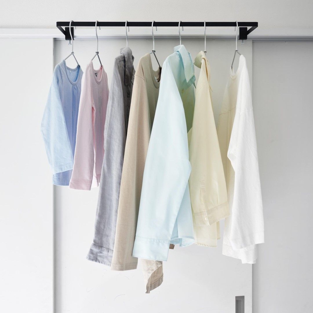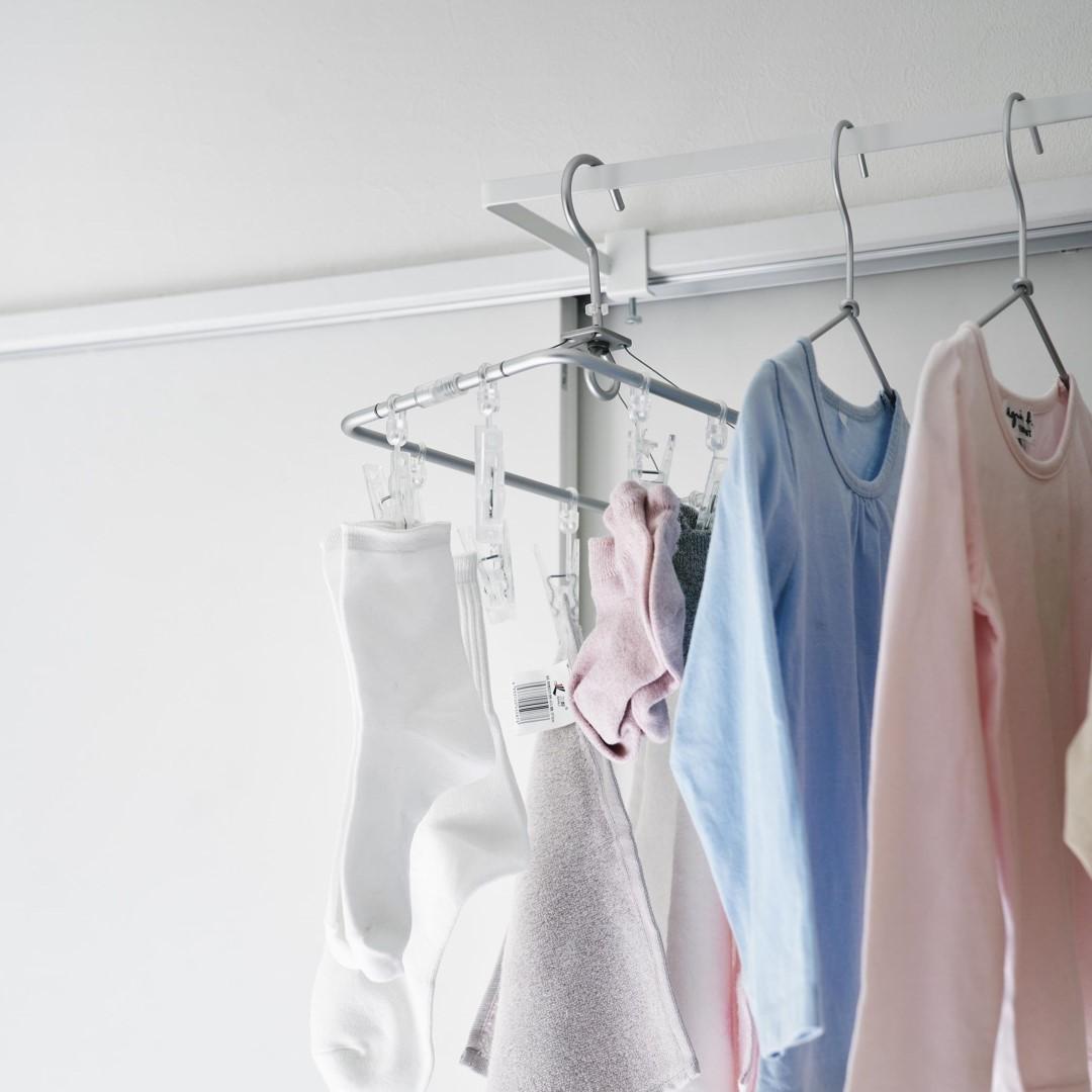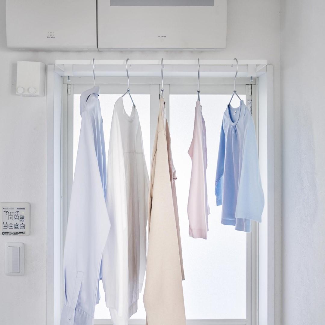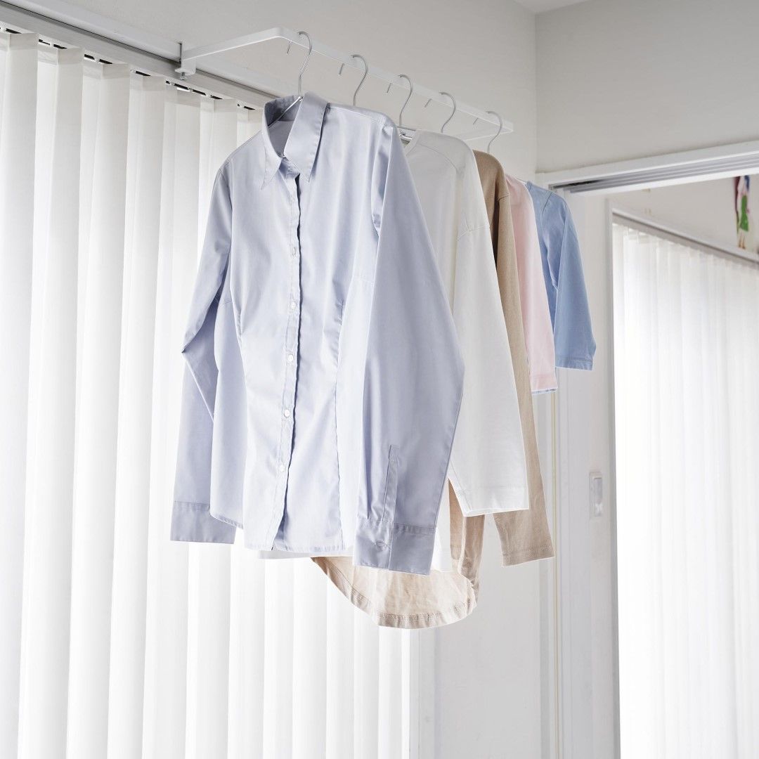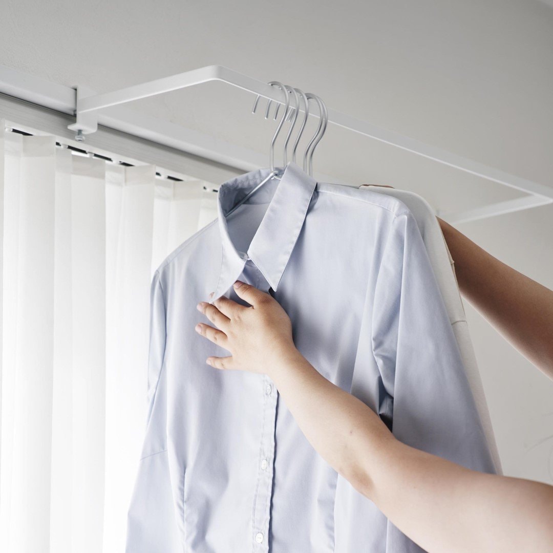 カーテンを閉めていても干せる部屋干しスペースを簡単に増設できる室内干しハンガーです。従来の室内物干しハンガーよりも奥行きのあるワイドタイプなので、カーテンや壁がハンガーに干渉しづらくなりました。梅雨や花粉が飛散する時期など、部屋干しが多くなる季節にはうってつけのアイテムです。ハンガーの種類を問わず干せる一般的なハンガーはもちろん、ピンチがたくさんついた洗濯物ハンガーを干すことも可能です。靴下や下着などは一般的なハンガーでは干しにくいので、どのタイプのハンガーも干せるのはうれしいポイント。洗濯機近くに設置して家事負担を軽減ランドリールームや洗面所など、洗濯機のすぐそばに設置すれば、洗った洗濯物をすぐに干せて便利です。わざわざ洗濯カゴに入れてべつの部屋に運ぶ手間もかからないので、時間と手間を短縮することが可能です。サッとまとめて一度に取り込める壁やカーテンに干渉することのない十分な空間を確保しているので、洗濯物を取り込む際にはハンガーを一ヶ所に滑らせて一気に取り込むことも簡単です。自分の服、子どもの服……などとあらかじめ左右に分けて干しておけば、取り込む際に仕分ける手もがかからずそのままそれぞれのクローゼットへ収納するだけ。調節ネジで固定するだけのお手軽さ。 調節ネジで穴をあけずに設置フックの上部にあるピンを枠にはめ込んだら、調節ネジを締めて取り付けが完了です。固定に費用する六角レンチは付属しているのでご自身でご用意いただかなくても大丈夫です。窓枠などを上下から挟むように設置するため、しっかりと固定できて安心。