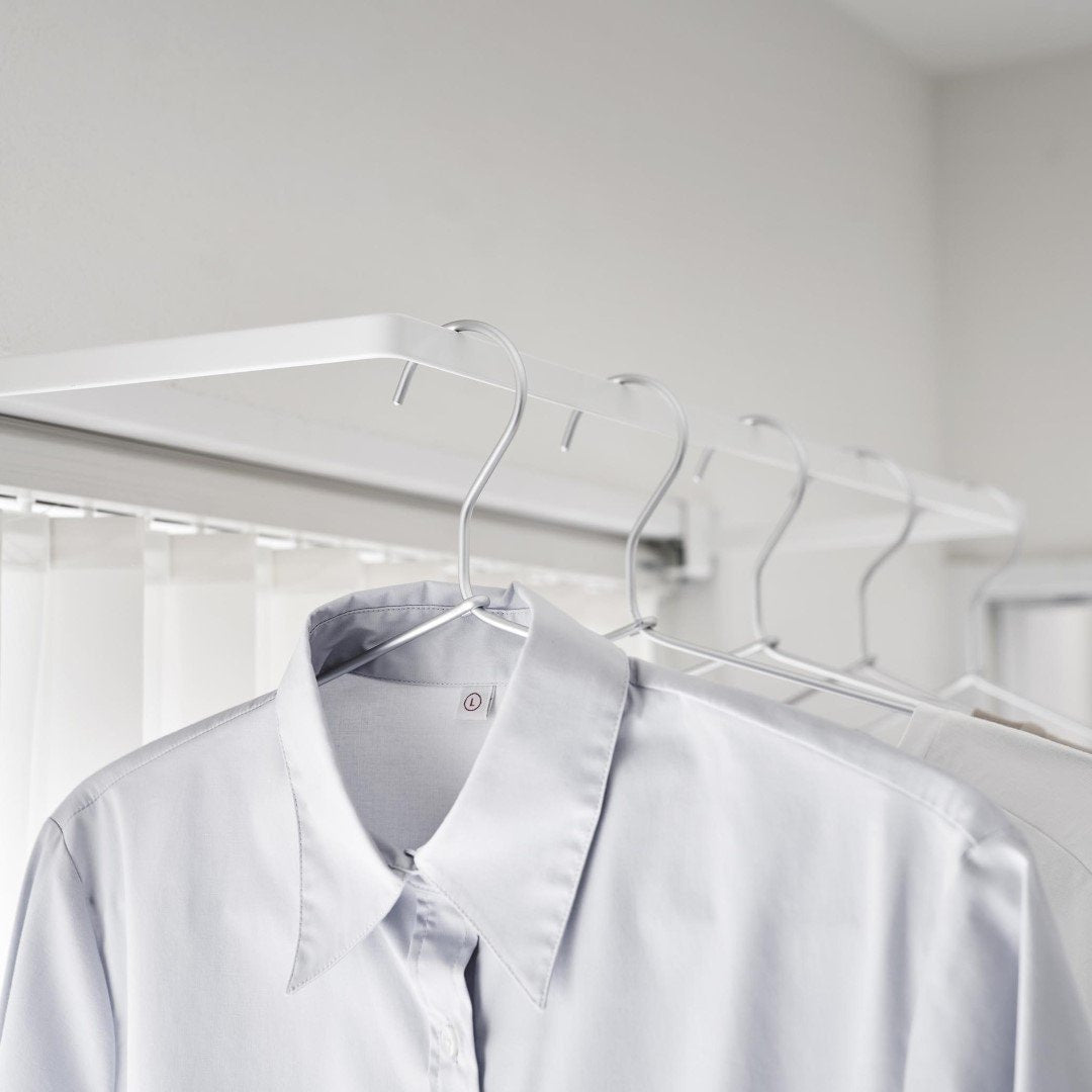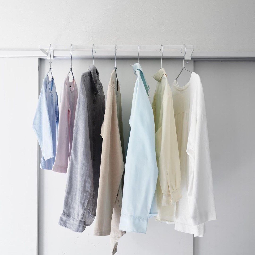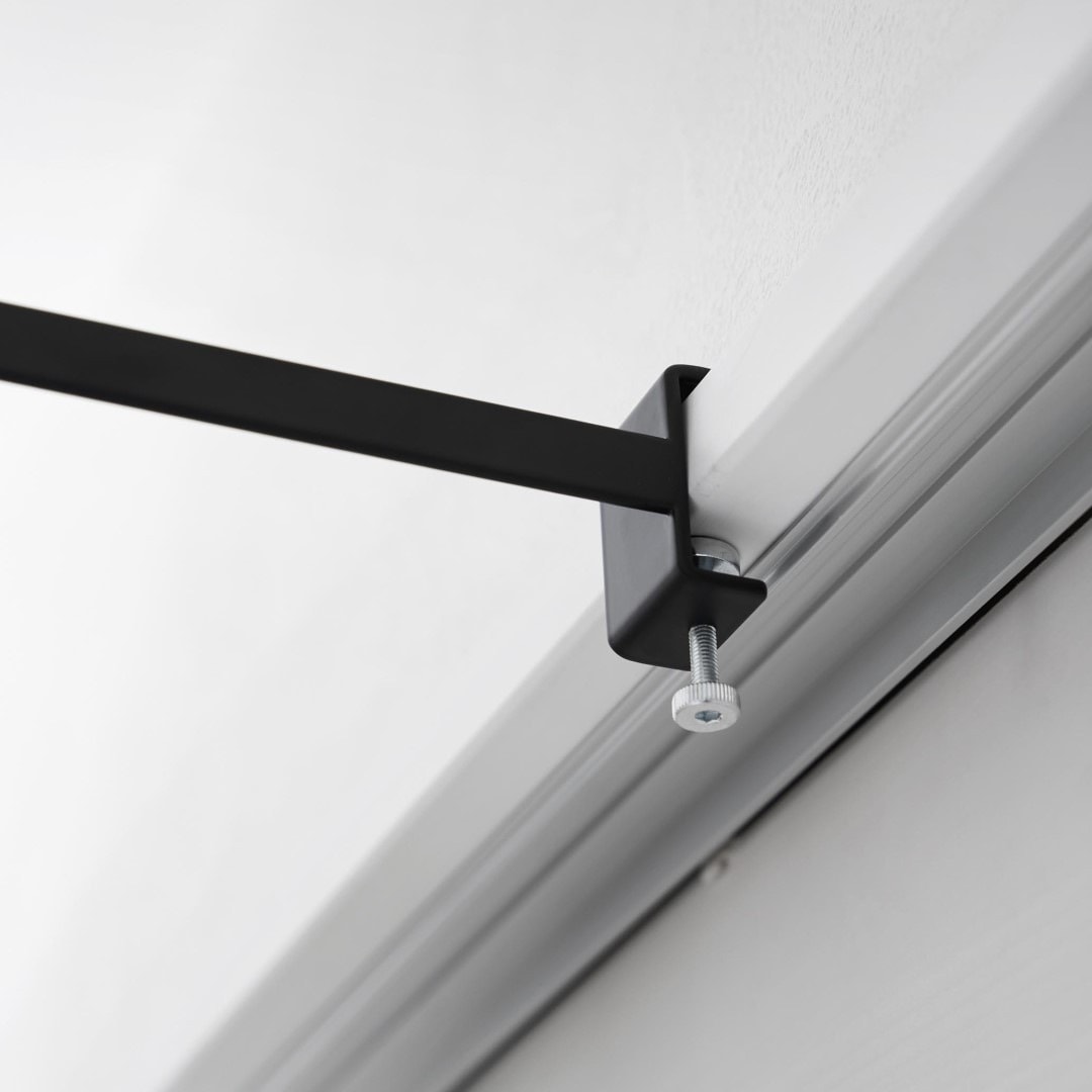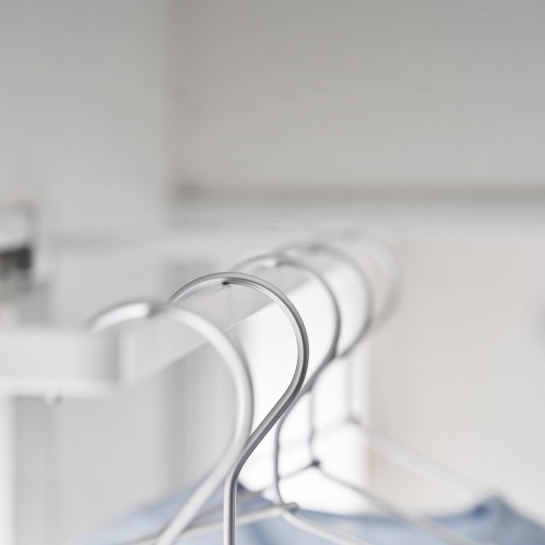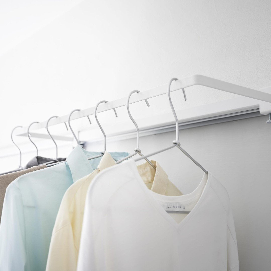 カーテンを閉めていても干せる部屋干しスペースを簡単に増設できる室内干しハンガーです。従来の室内物干しハンガーよりも奥行きのあるワイドタイプなので、カーテンや壁がハンガーに干渉しづらくなりました。梅雨や花粉が飛散する時期など、部屋干しが多くなる季節にはうってつけのアイテムです。ハンガーの種類を問わず干せる一般的なハンガーはもちろん、ピンチがたくさんついた洗濯物ハンガーを干すことも可能です。靴下や下着などは一般的なハンガーでは干しにくいので、どのタイプのハンガーも干せるのはうれしいポイント。洗濯機近くに設置して家事負担を軽減ランドリールームや洗面所など、洗濯機のすぐそばに設置すれば、洗った洗濯物をすぐに干せて便利です。わざわざ洗濯カゴに入れてべつの部屋に運ぶ手間もかからないので、時間と手間を短縮することが可能です。サッとまとめて一度に取り込める壁やカーテンに干渉することのない十分な空間を確保しているので、洗濯物を取り込む際にはハンガーを一ヶ所に滑らせて一気に取り込むことも簡単です。自分の服、子どもの服……などとあらかじめ左右に分けて干しておけば、取り込む際に仕分ける手もがかからずそのままそれぞれのクローゼットへ収納するだけ。調節ネジで固定するだけのお手軽さ。 調節ネジで穴をあけずに設置フックの上部にあるピンを枠にはめ込んだら、調節ネジを締めて取り付けが完了です。固定に費用する六角レンチは付属しているのでご自身でご用意いただかなくても大丈夫です。窓枠などを上下から挟むように設置するため、しっかりと固定できて安心。